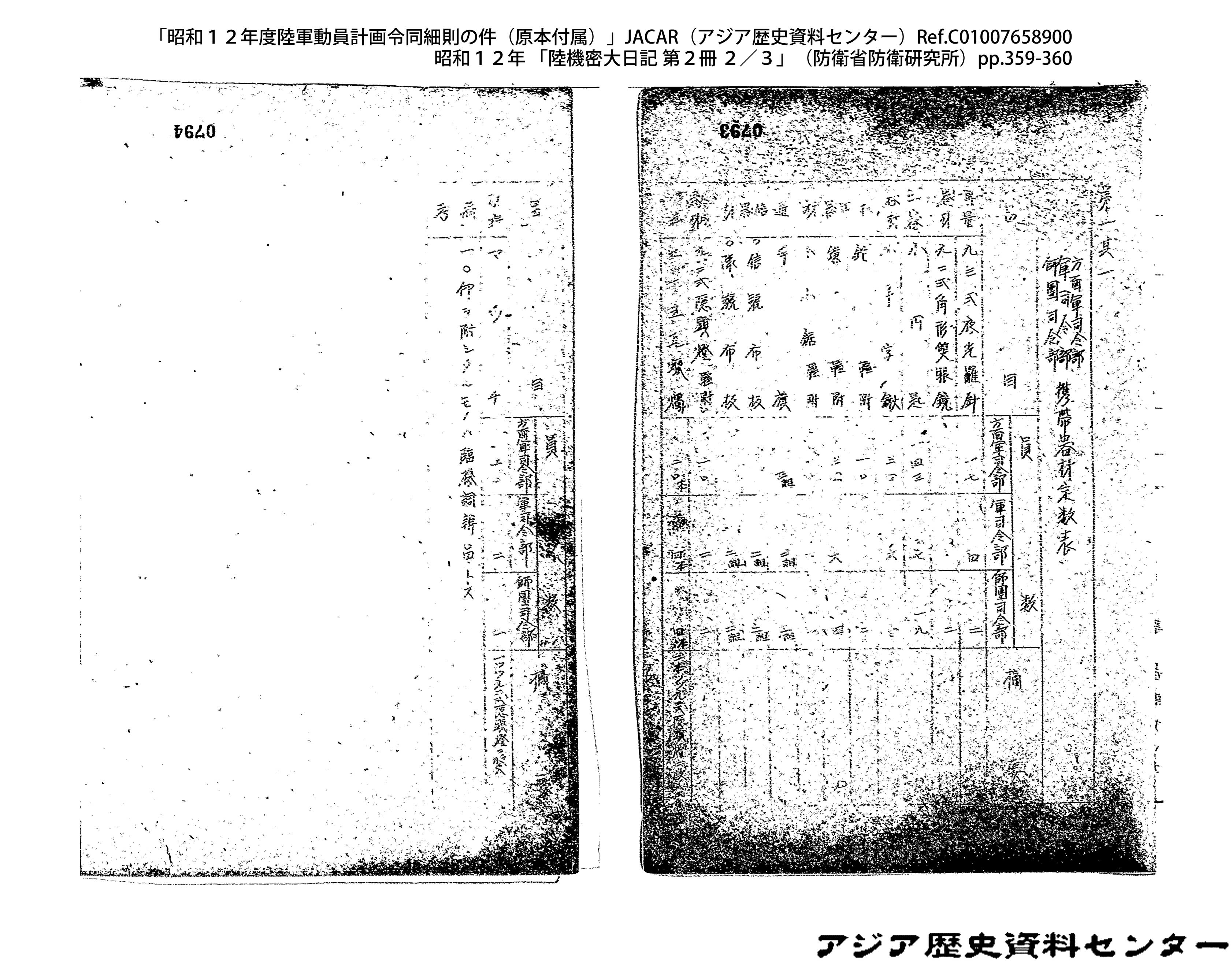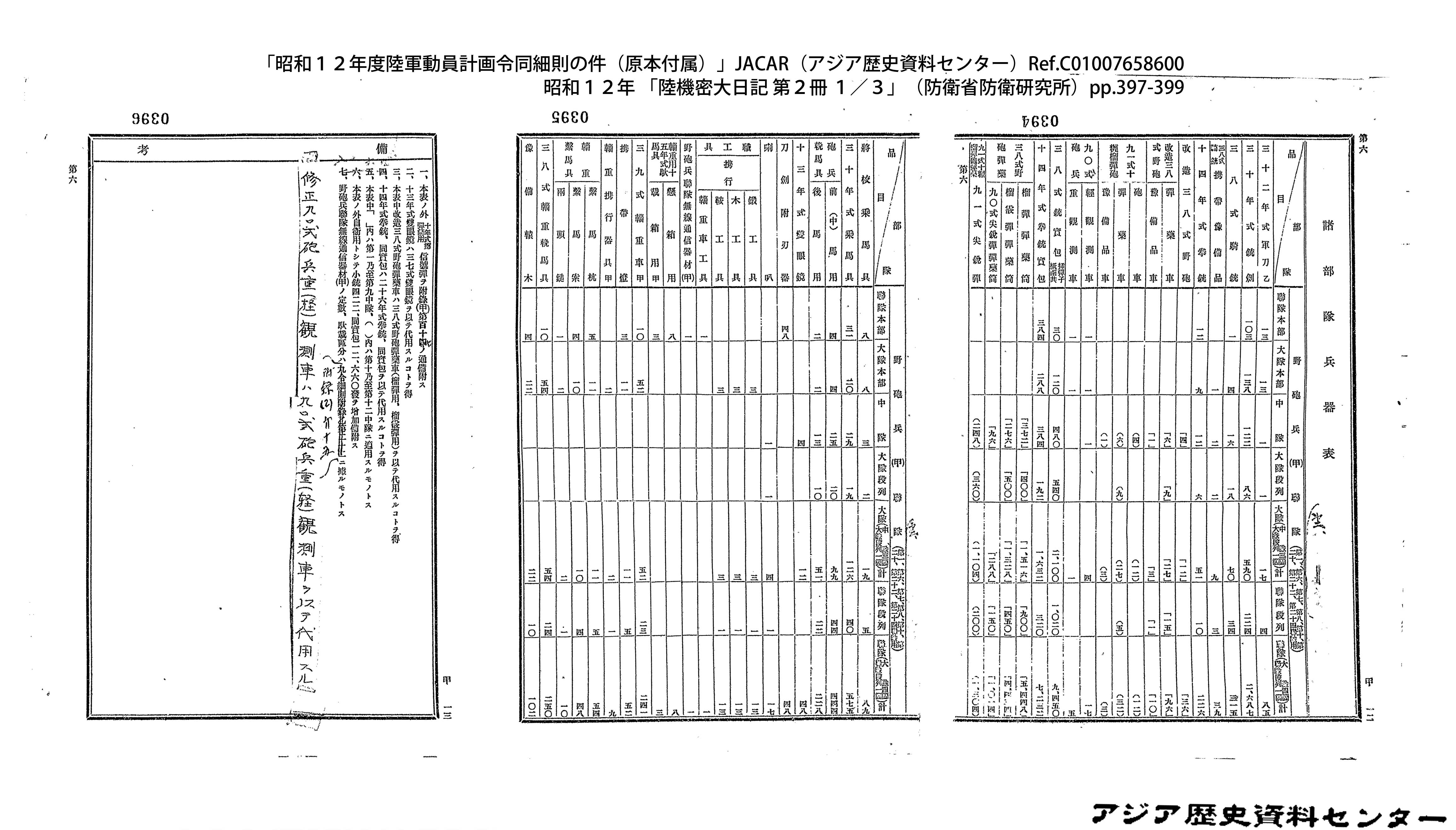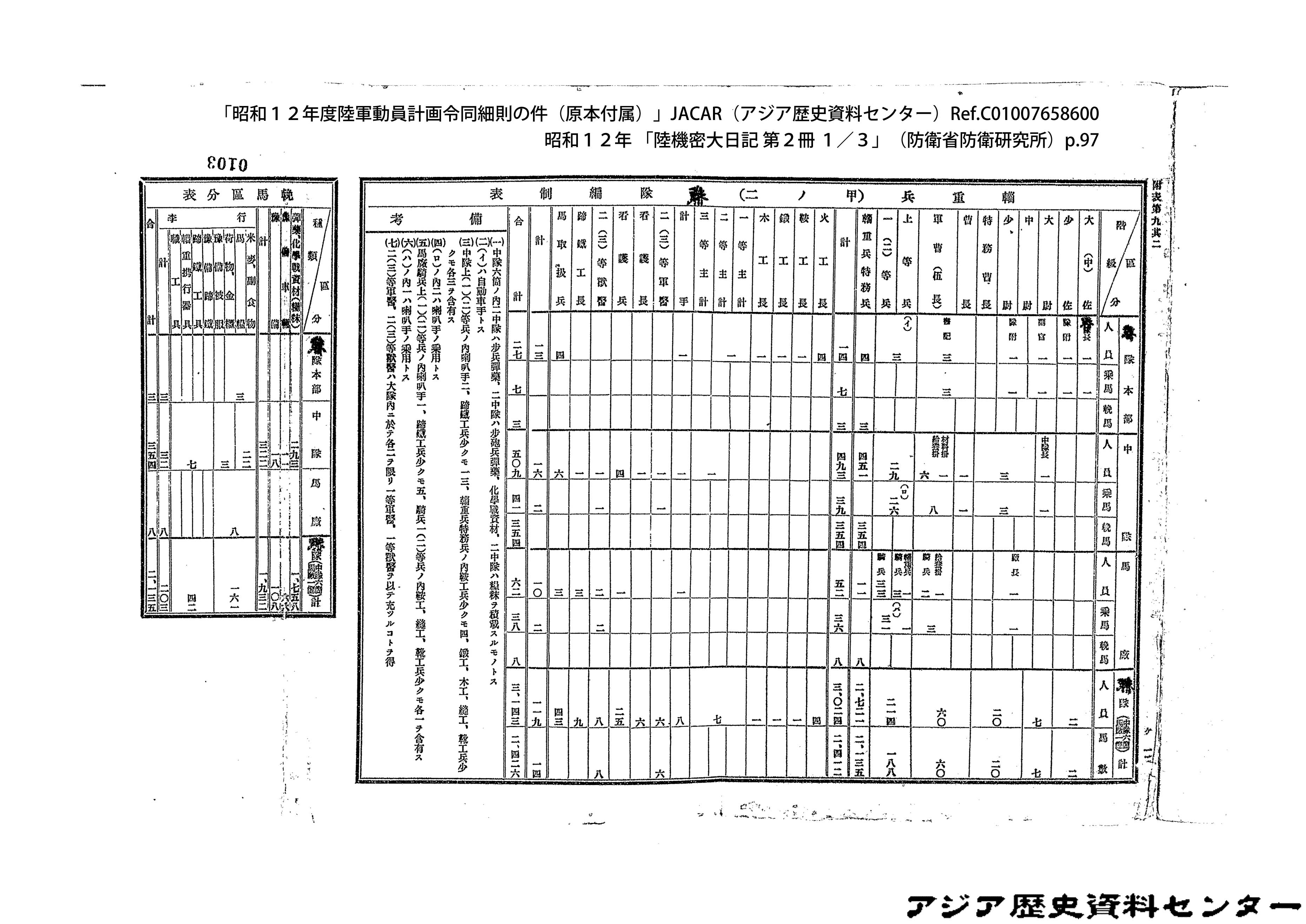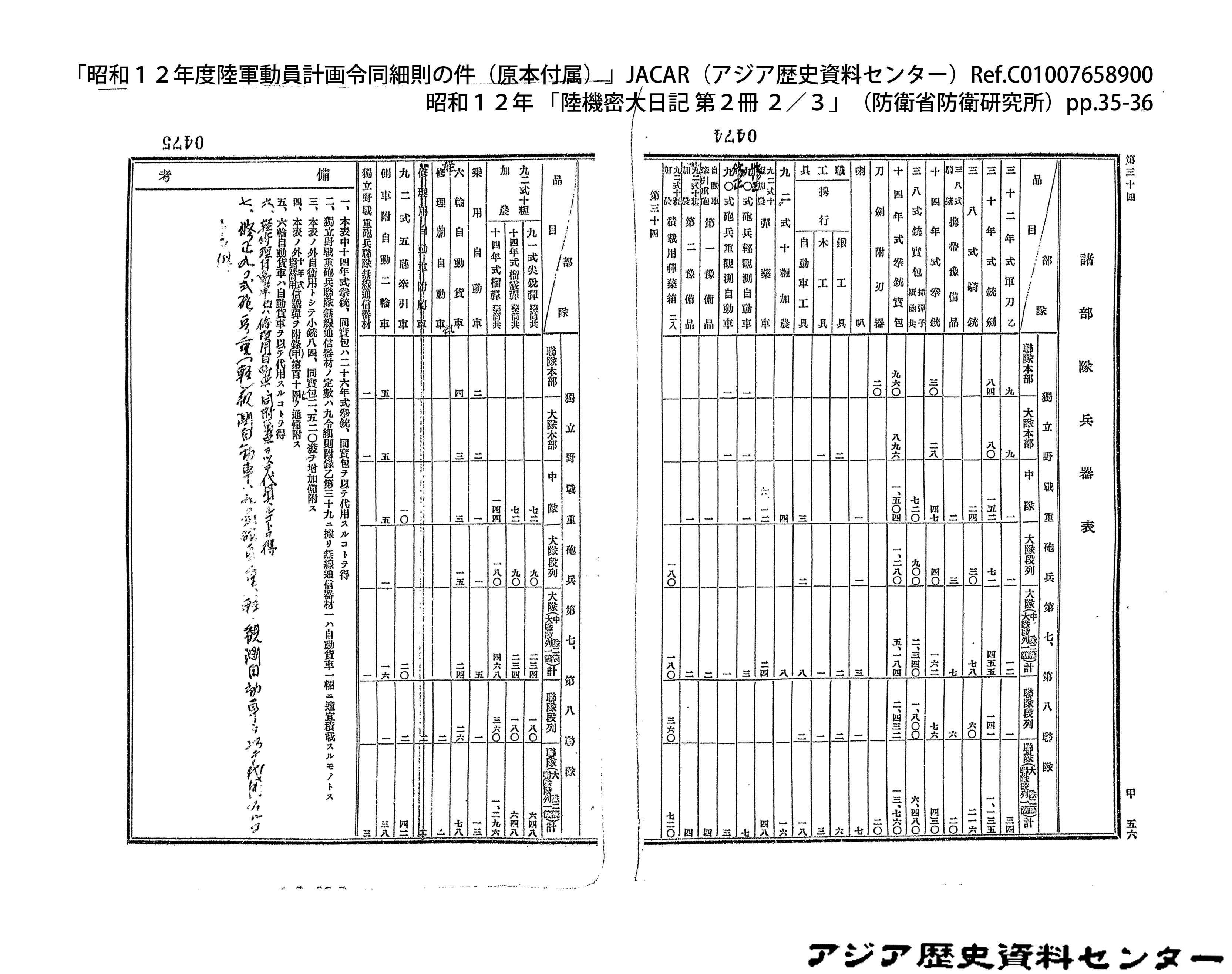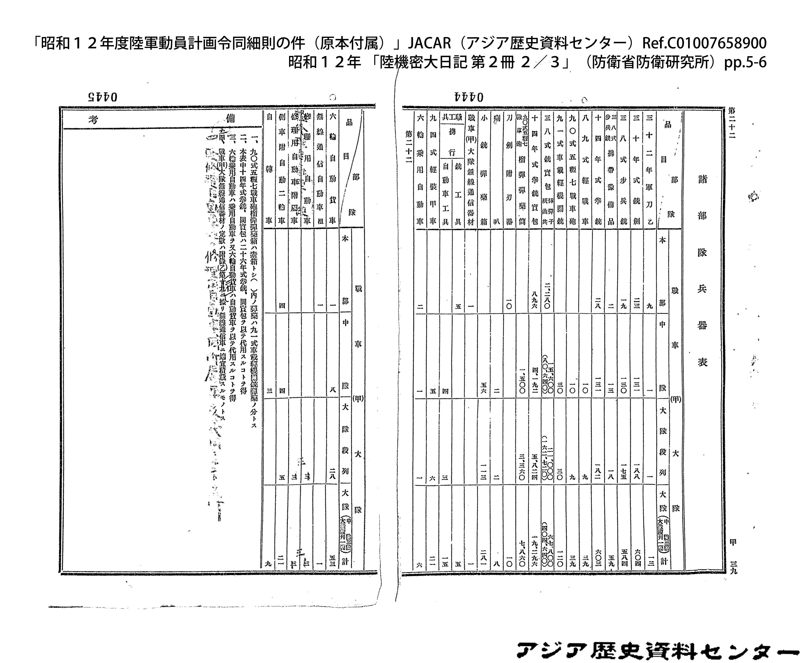 「昭和12年度陸軍動員計画令同細則の件(原本付属)」JACAR(アジア歴史資料センター)Ref.C01007659200、昭和12年 「陸機密大日記 第2冊 3/3」(防衛省防衛研究所)