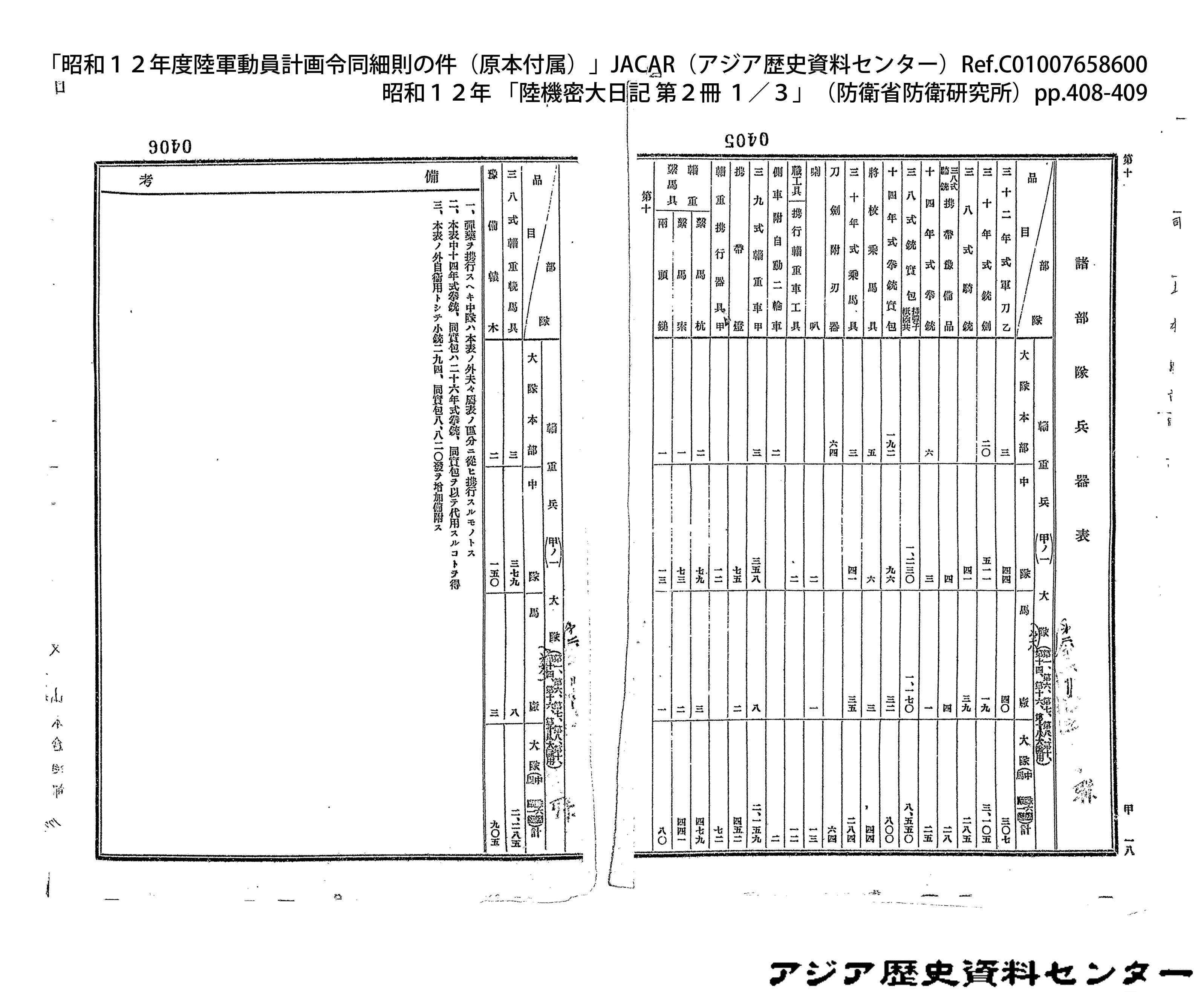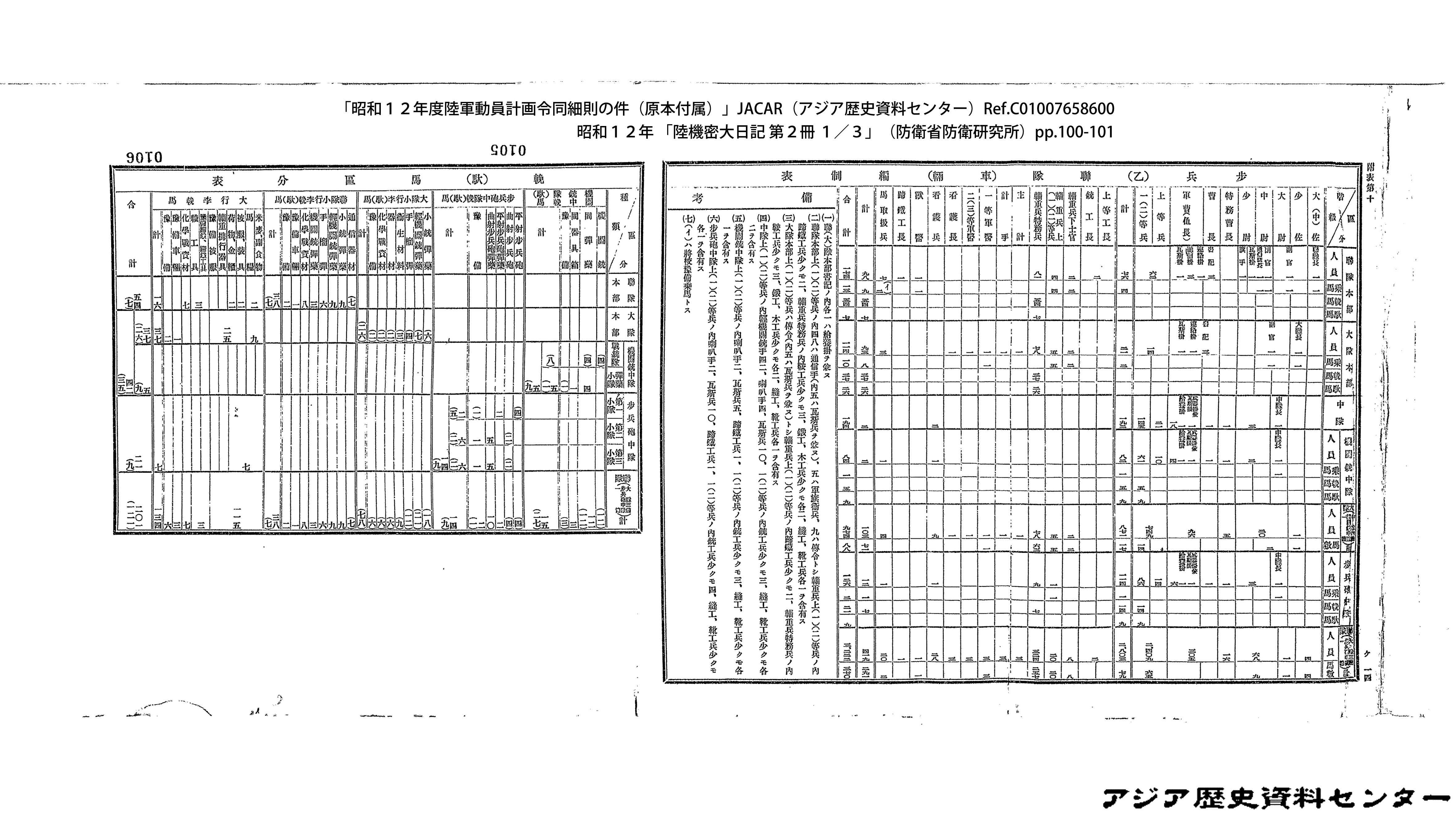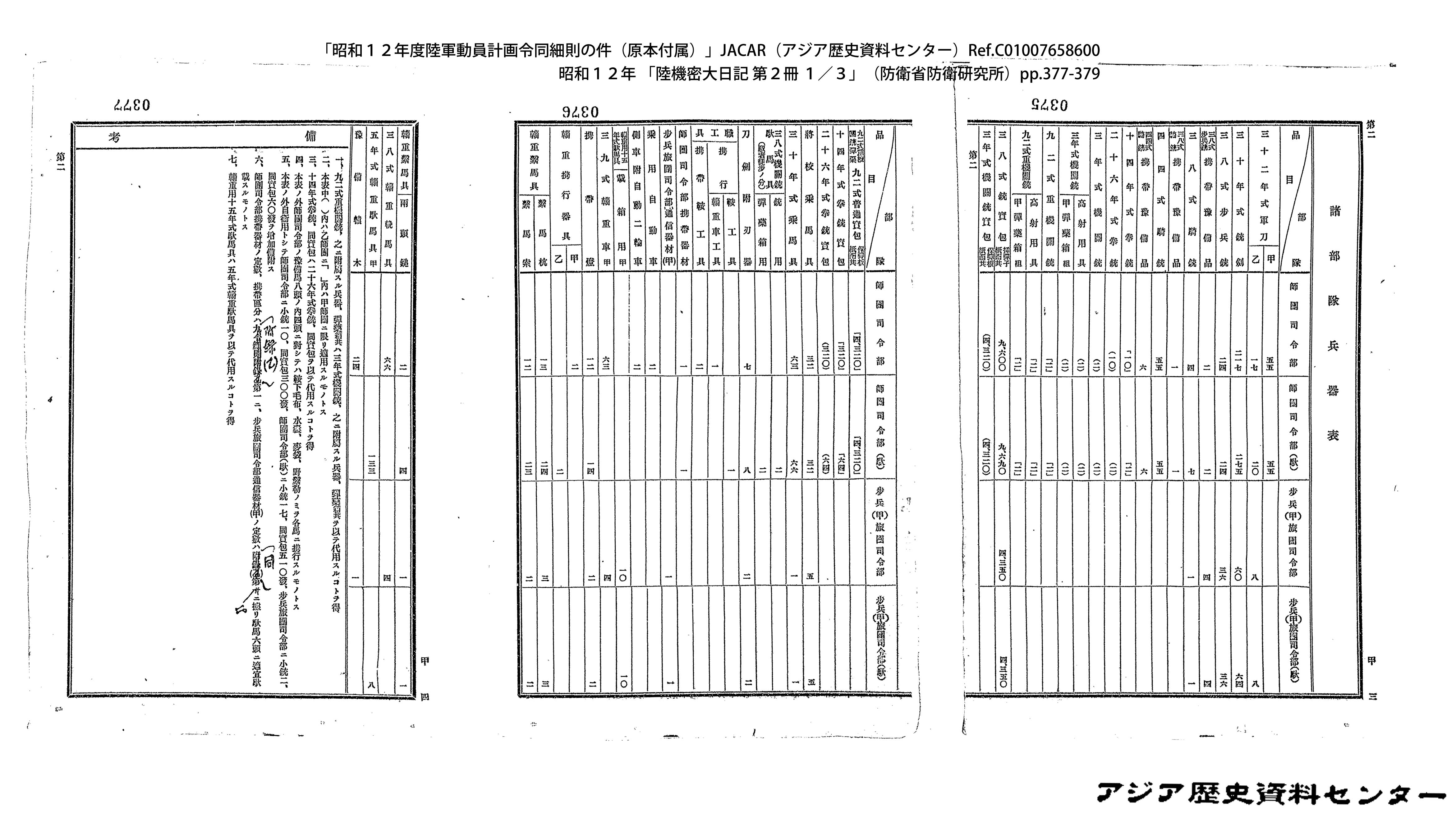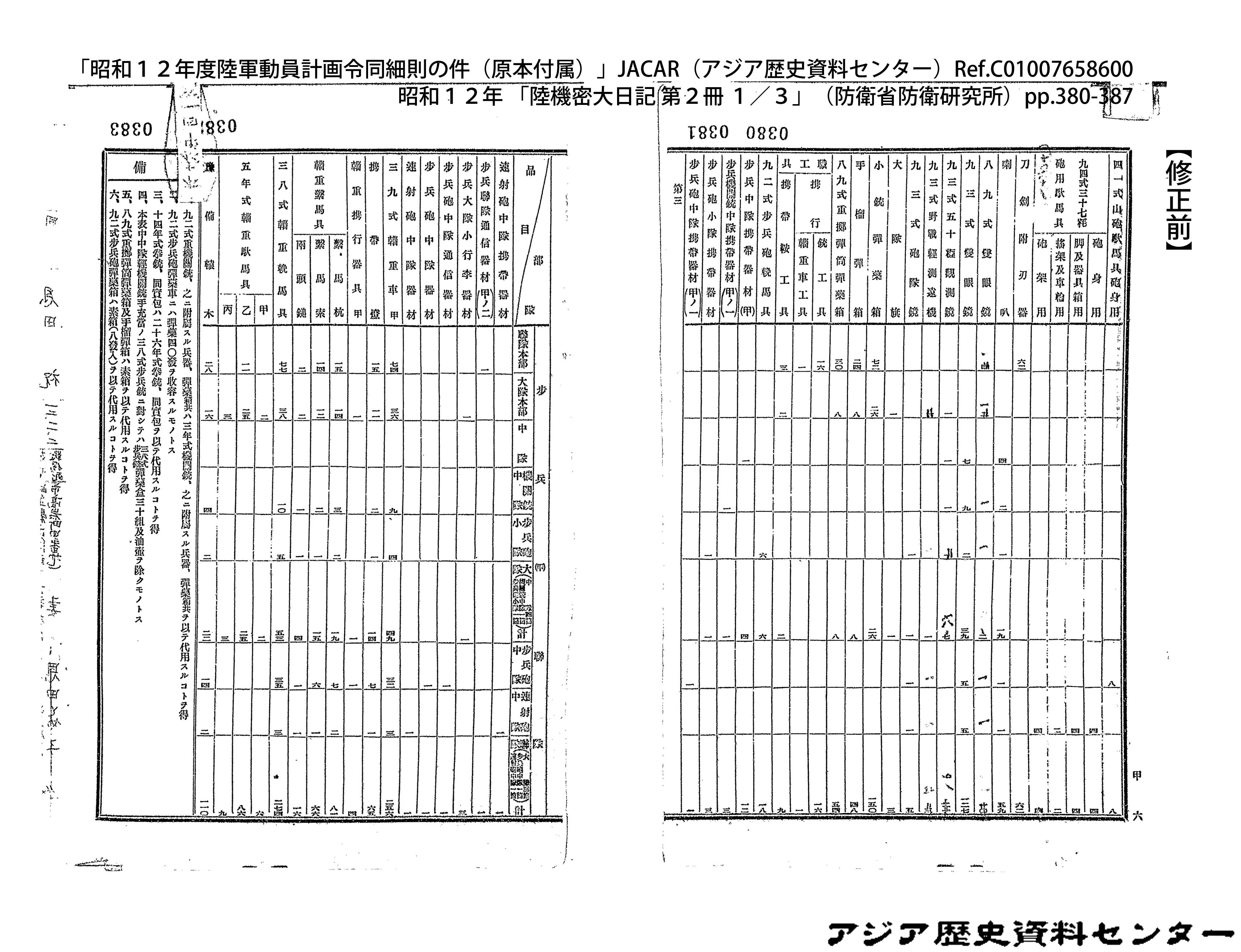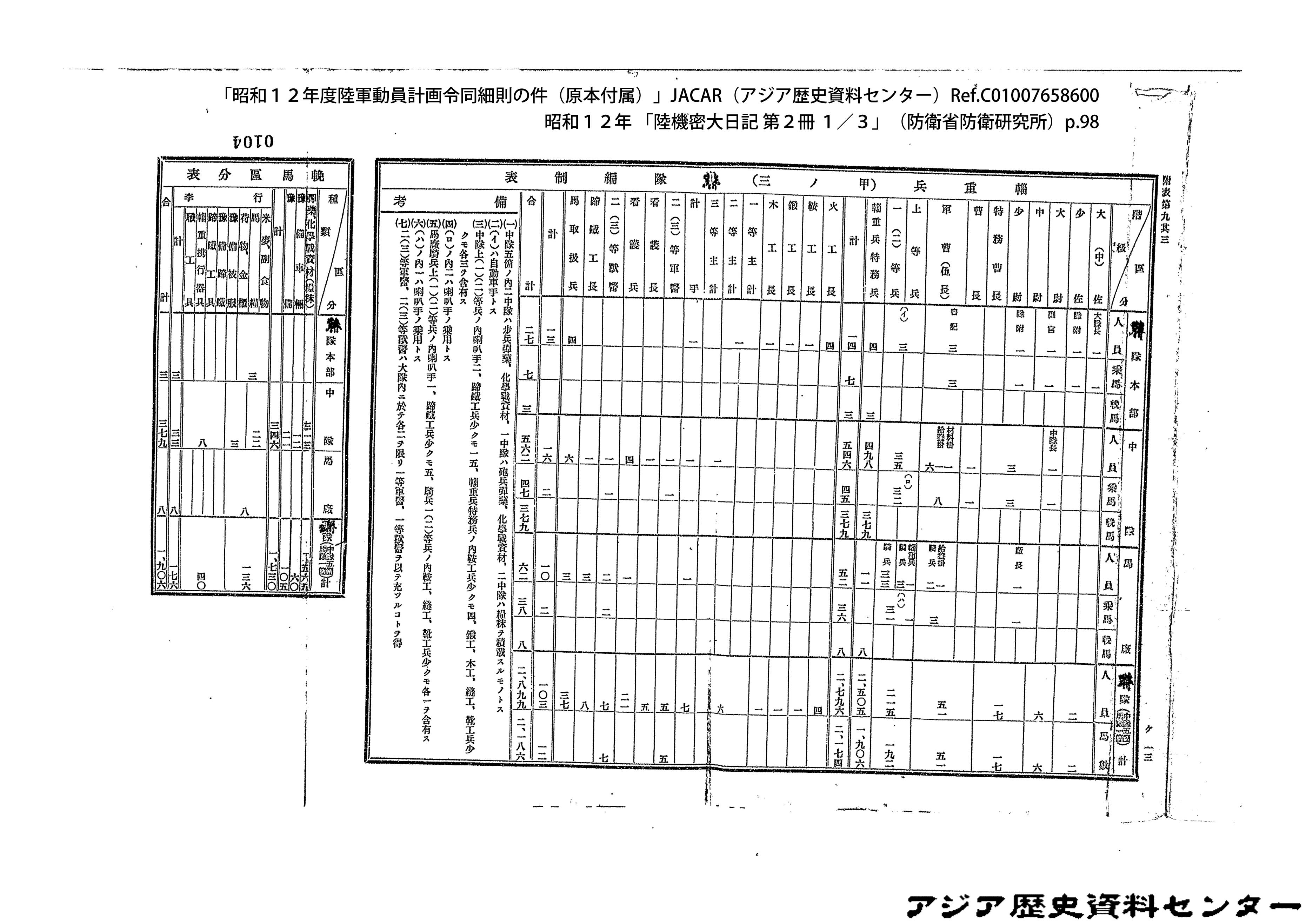 「昭和12年度陸軍動員計画令同細則の件(原本付属)」JACAR(アジア歴史資料センター)Ref.C01007659200、昭和12年 「陸機密大日記 第2冊 3/3」(防衛省防衛研究所)