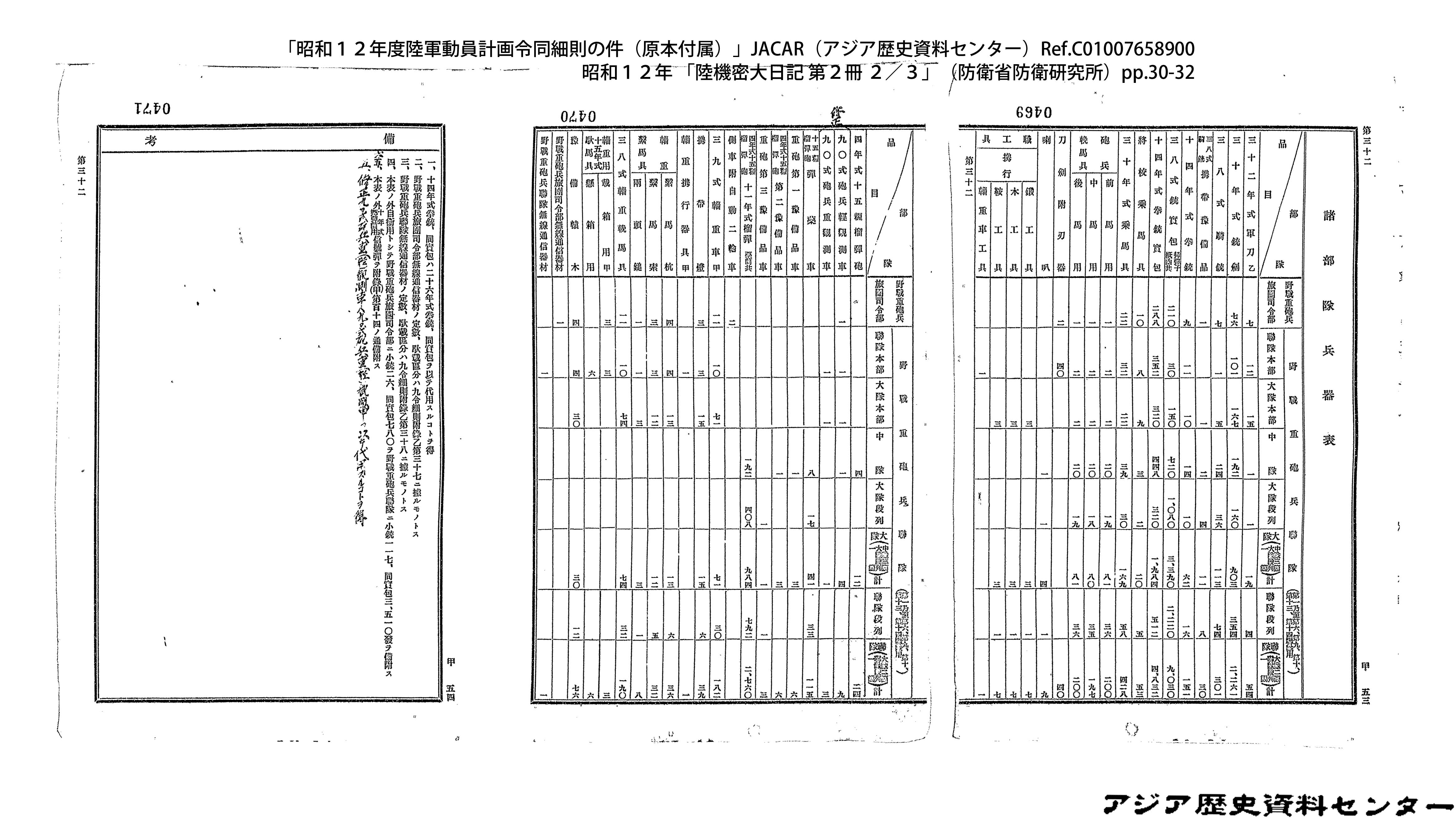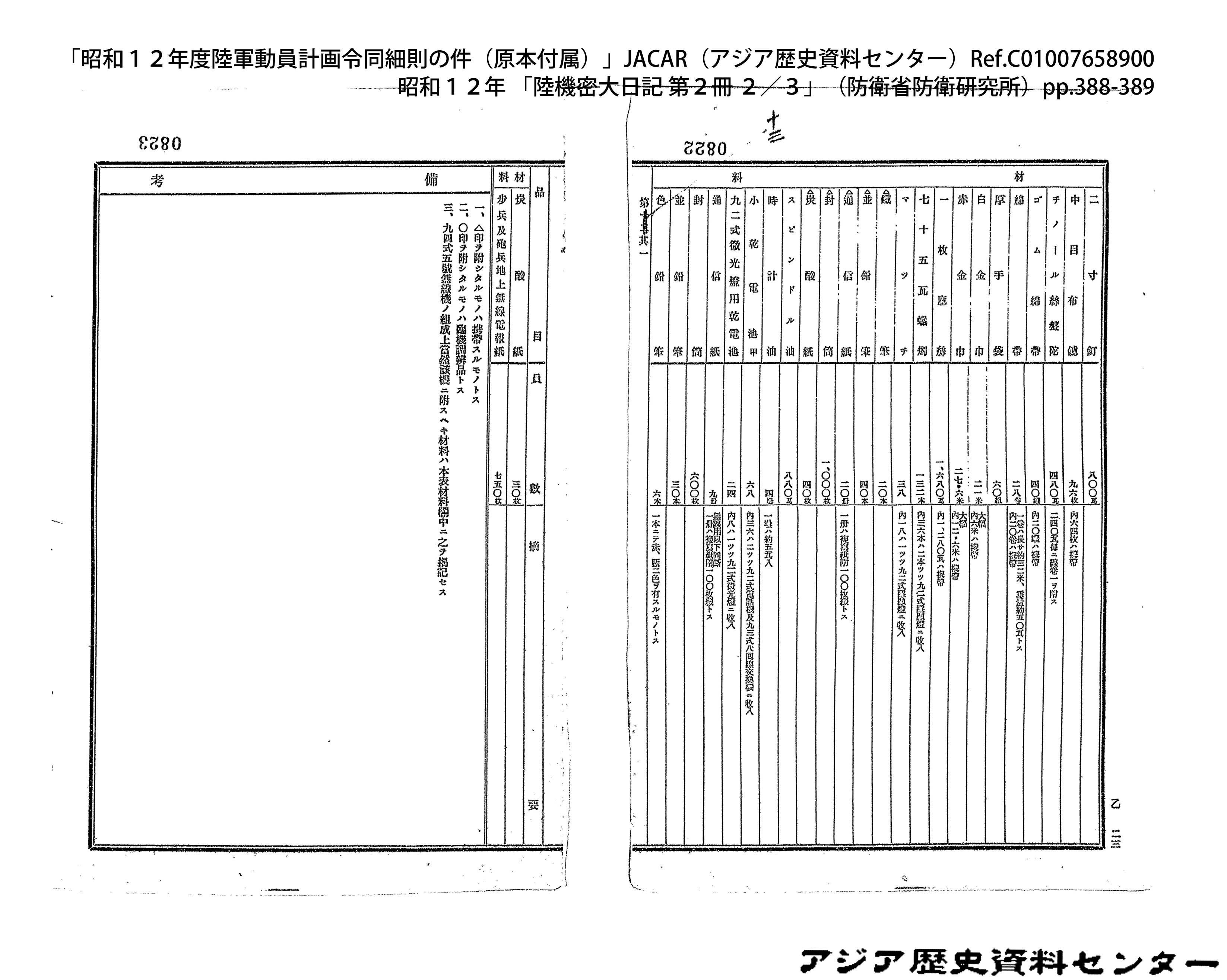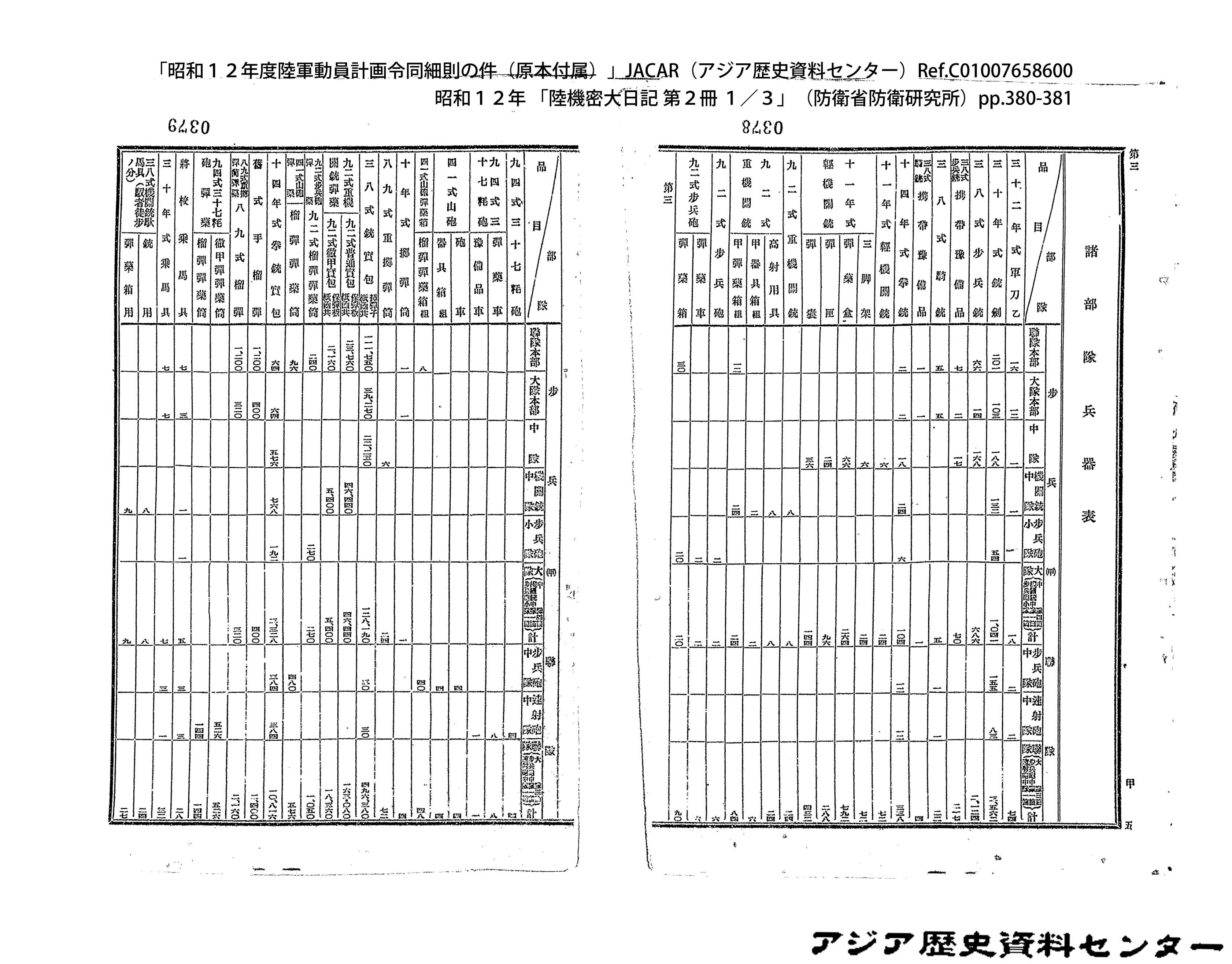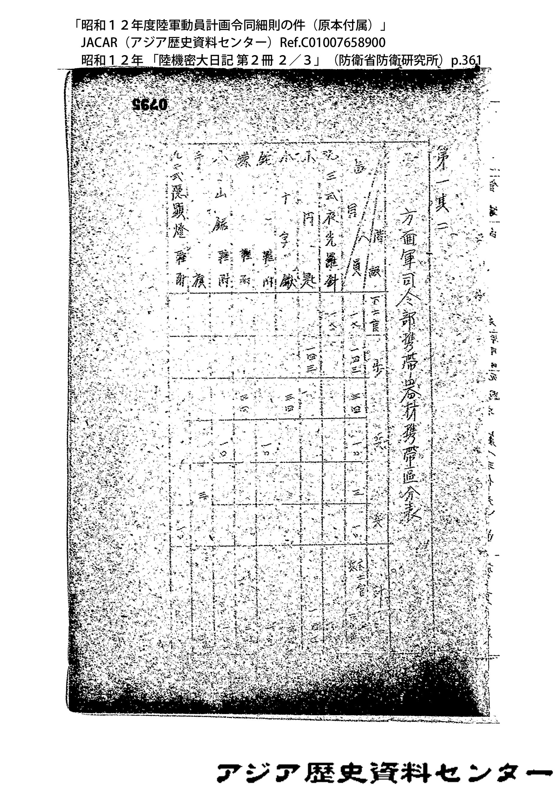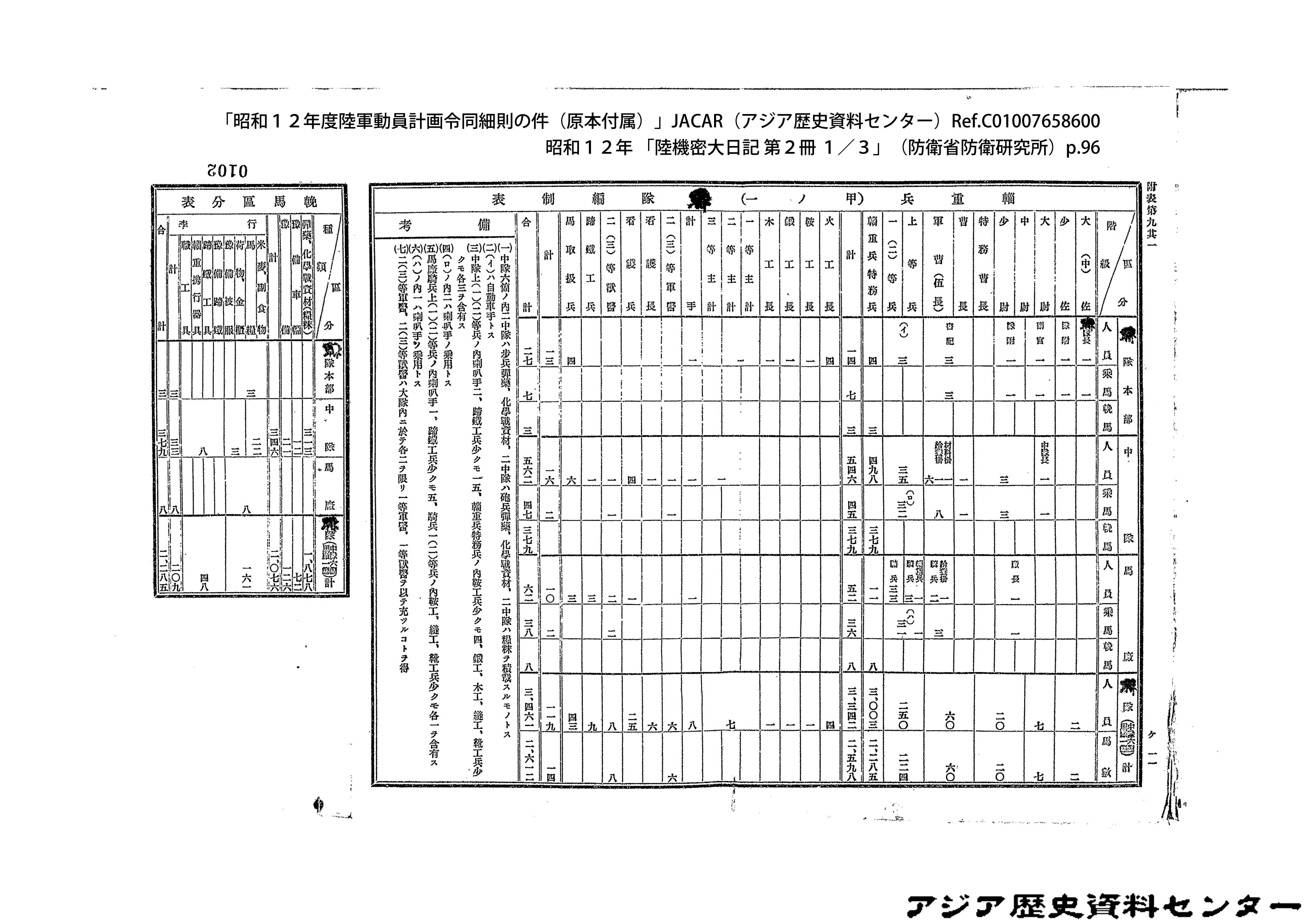 「昭和12年度陸軍動員計画令同細則の件(原本付属)」JACAR(アジア歴史資料センター)Ref.C01007659200、昭和12年 「陸機密大日記 第2冊 3/3」(防衛省防衛研究所)