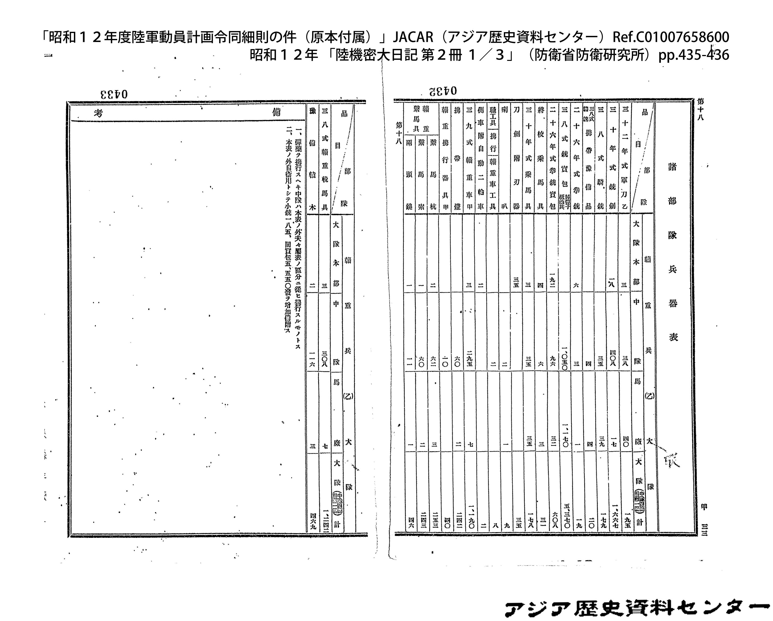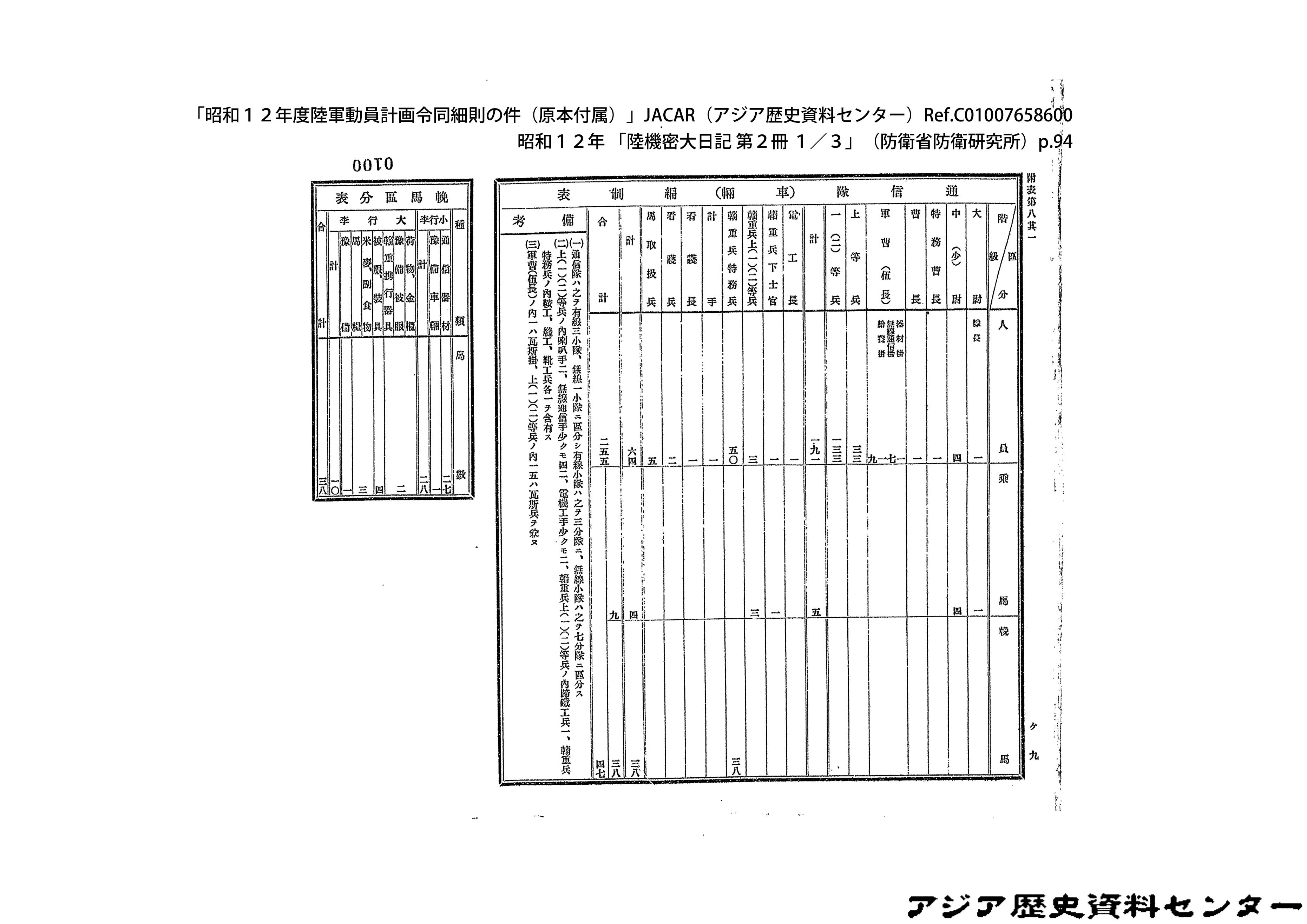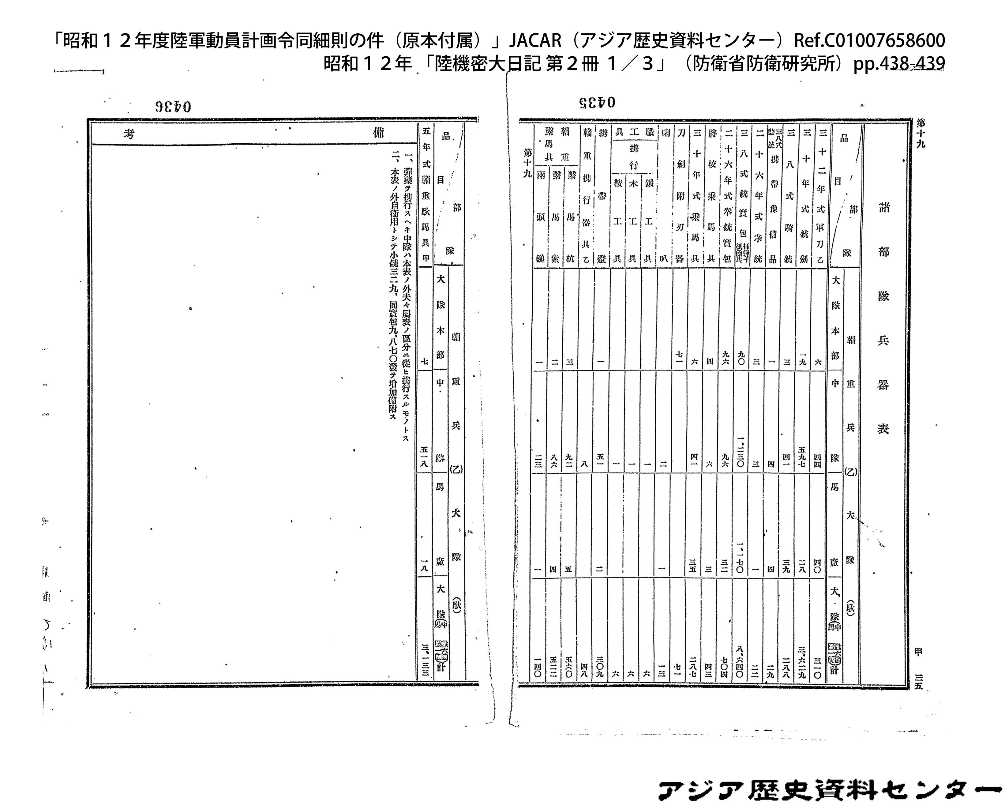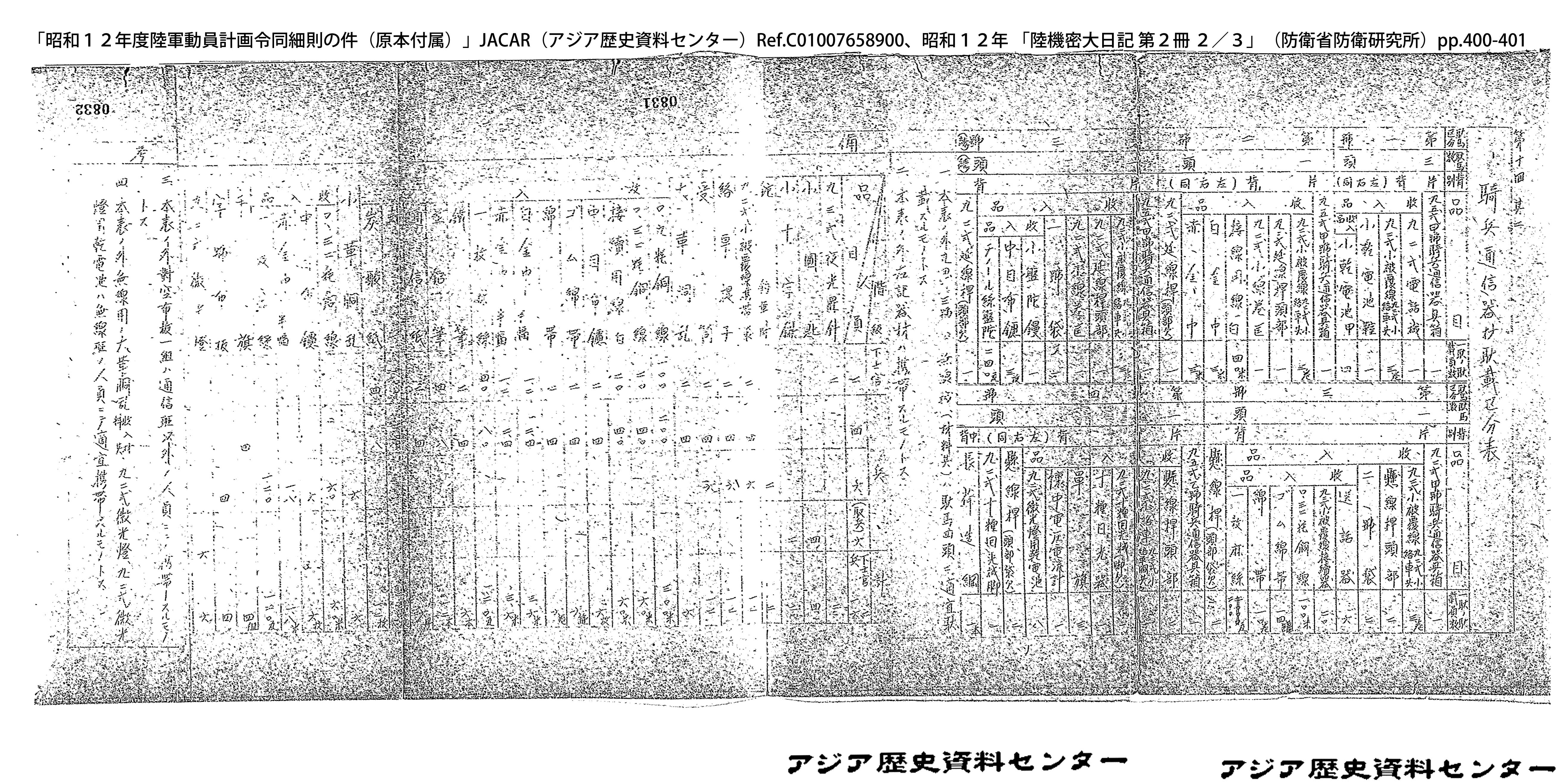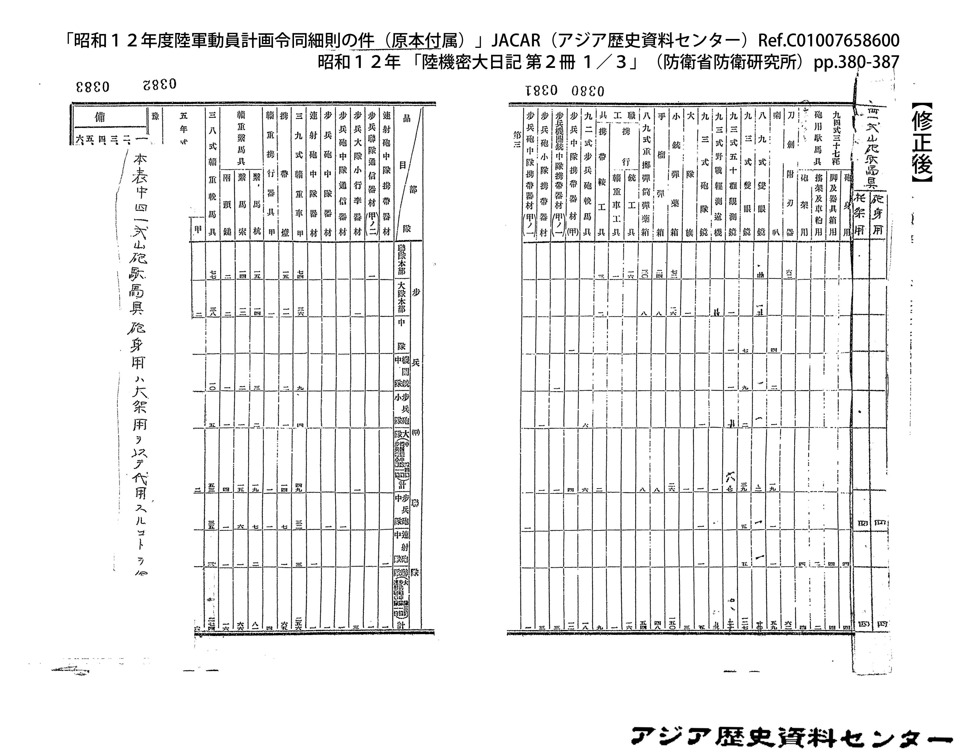 「昭和12年度陸軍動員計画令同細則の件(原本付属)」JACAR(アジア歴史資料センター)Ref.C01007659200、昭和12年 「陸機密大日記 第2冊 3/3」(防衛省防衛研究所)