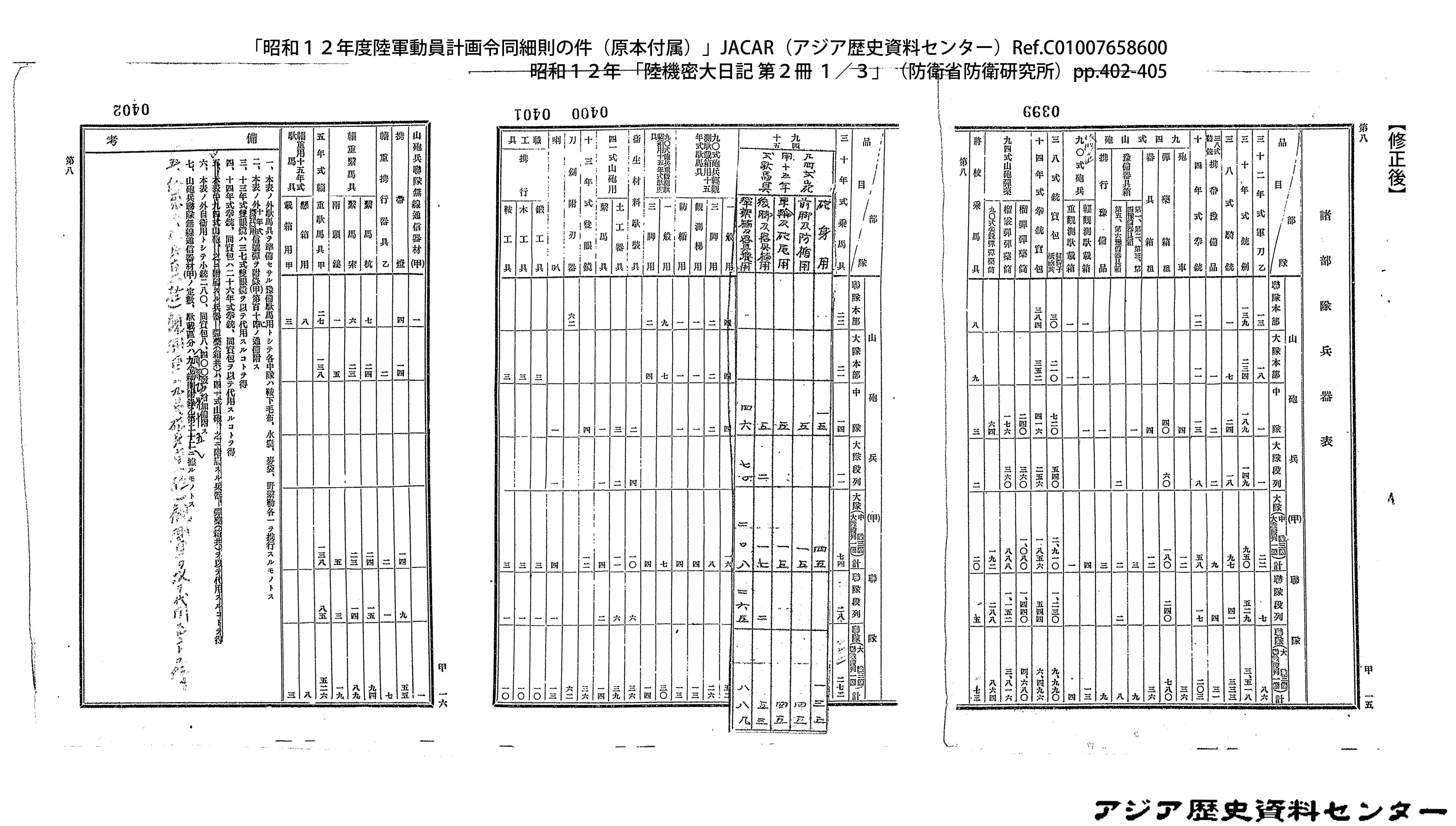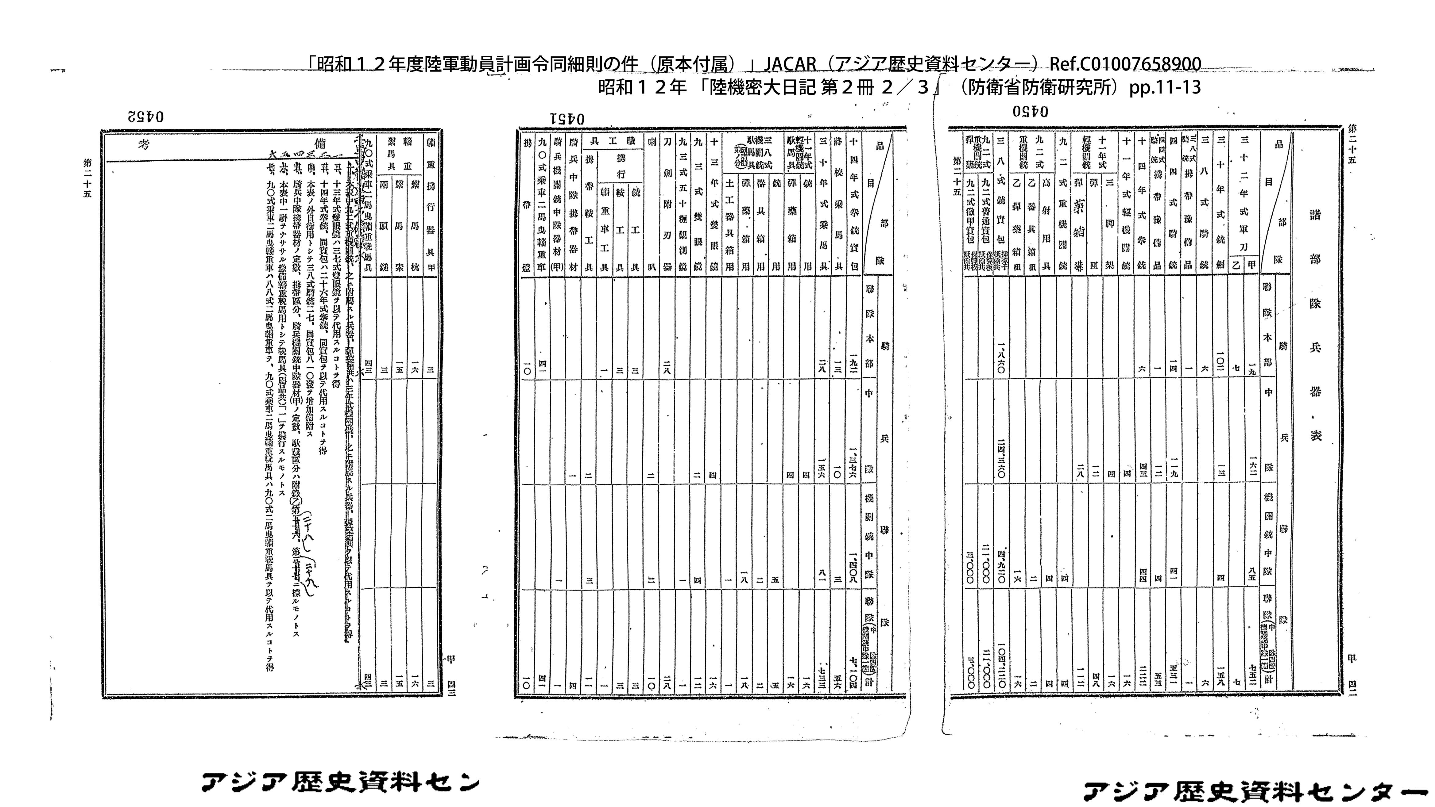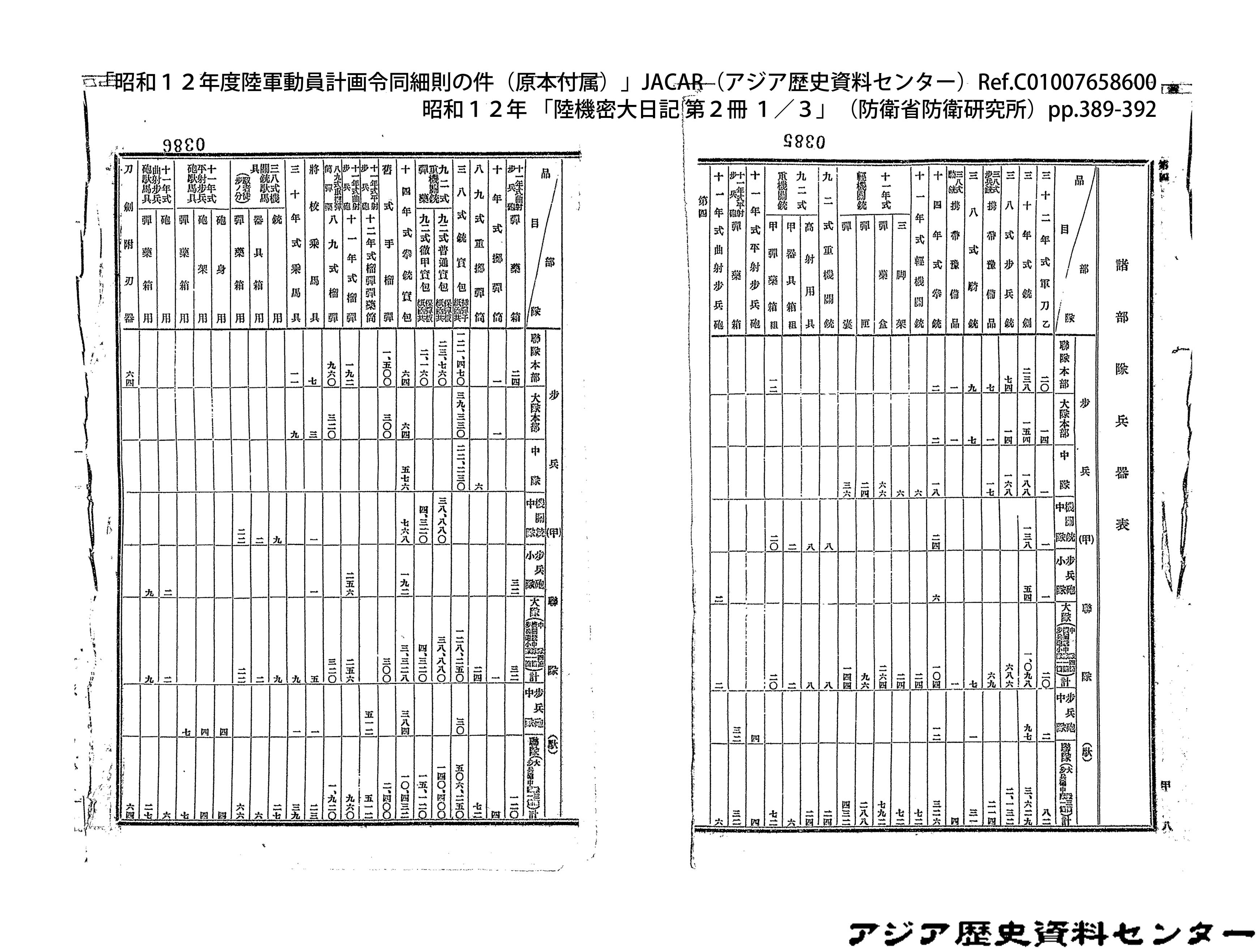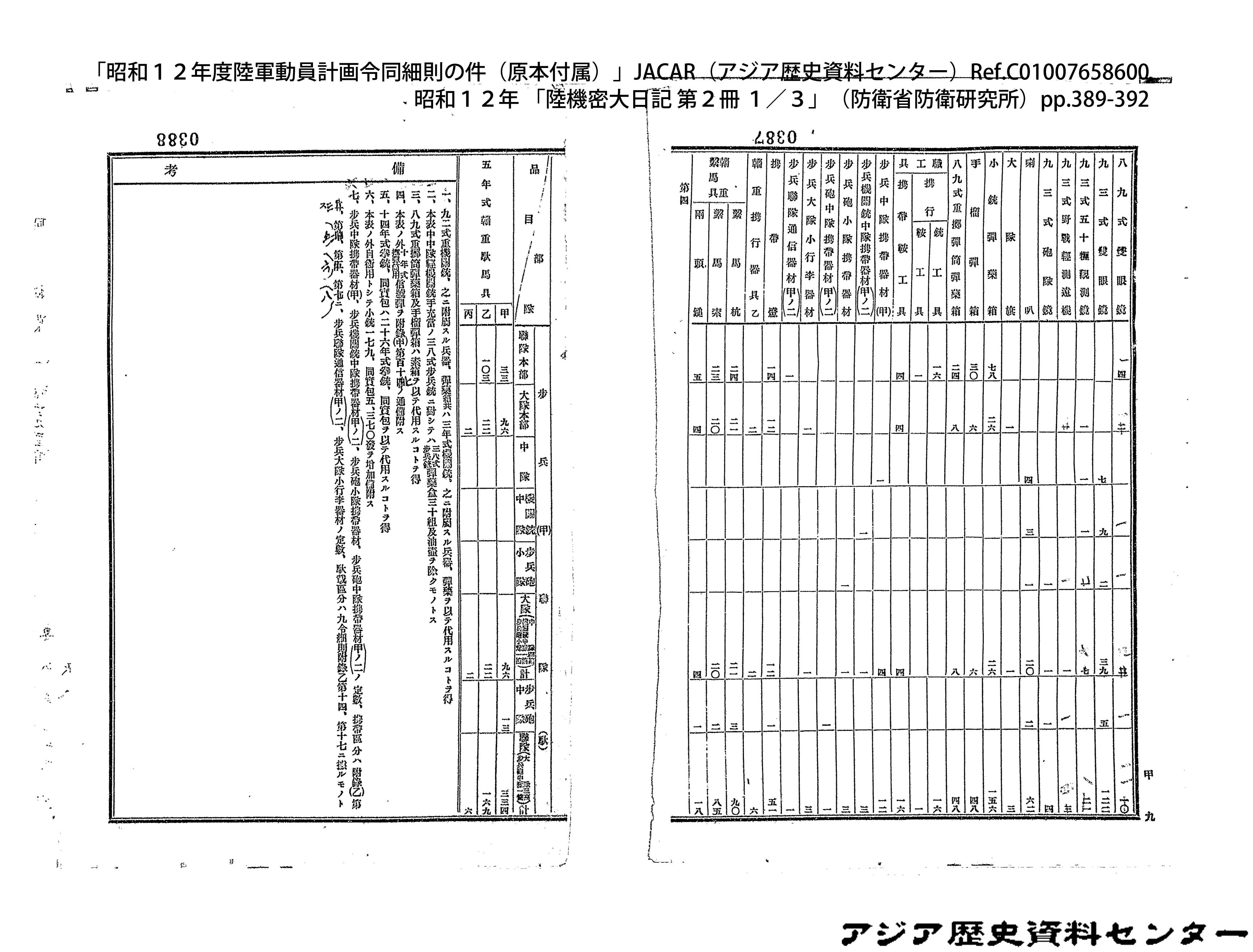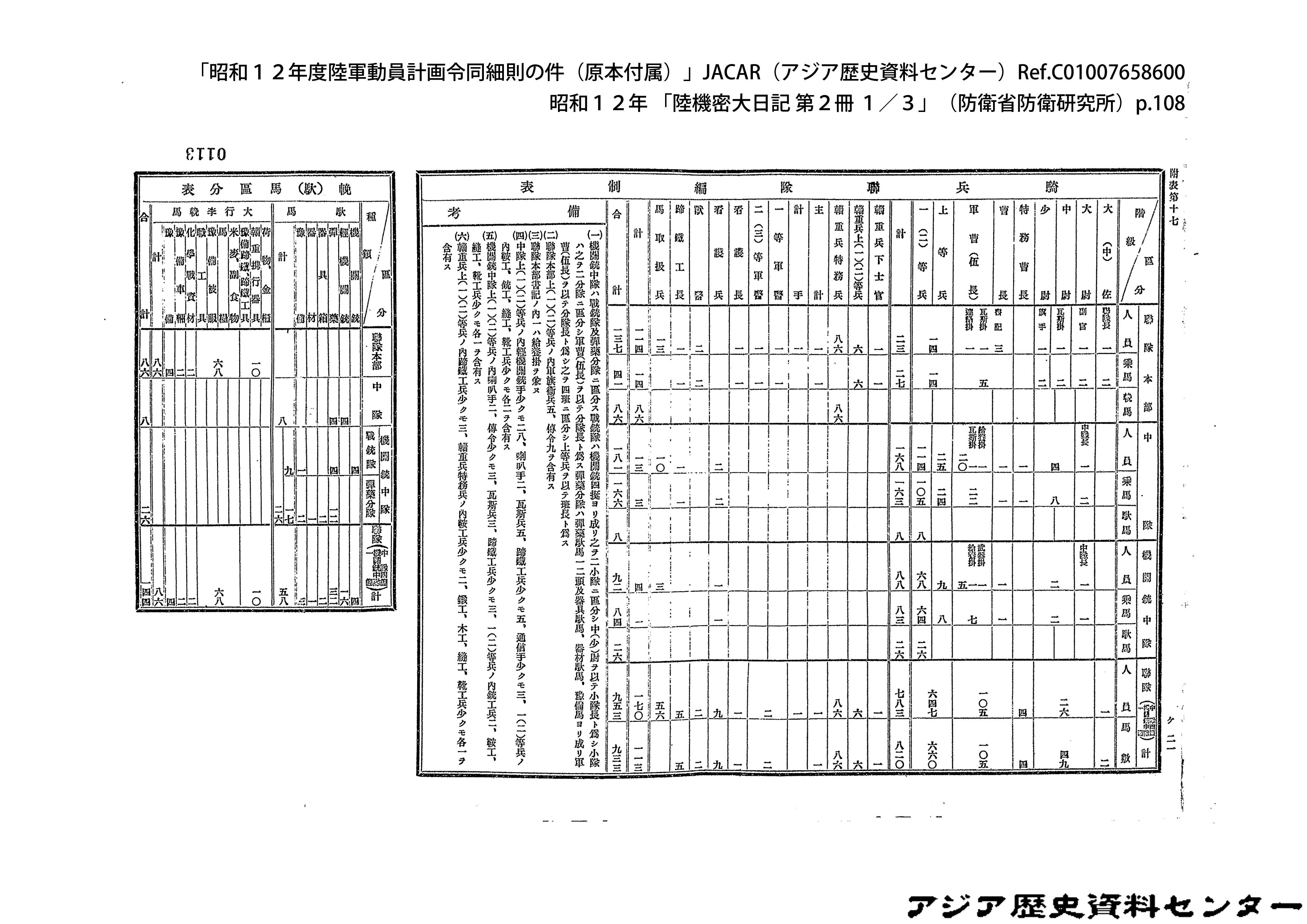 「昭和12年度陸軍動員計画令同細則の件(原本付属)」JACAR(アジア歴史資料センター)Ref.C01007659200、昭和12年 「陸機密大日記 第2冊 3/3」(防衛省防衛研究所)