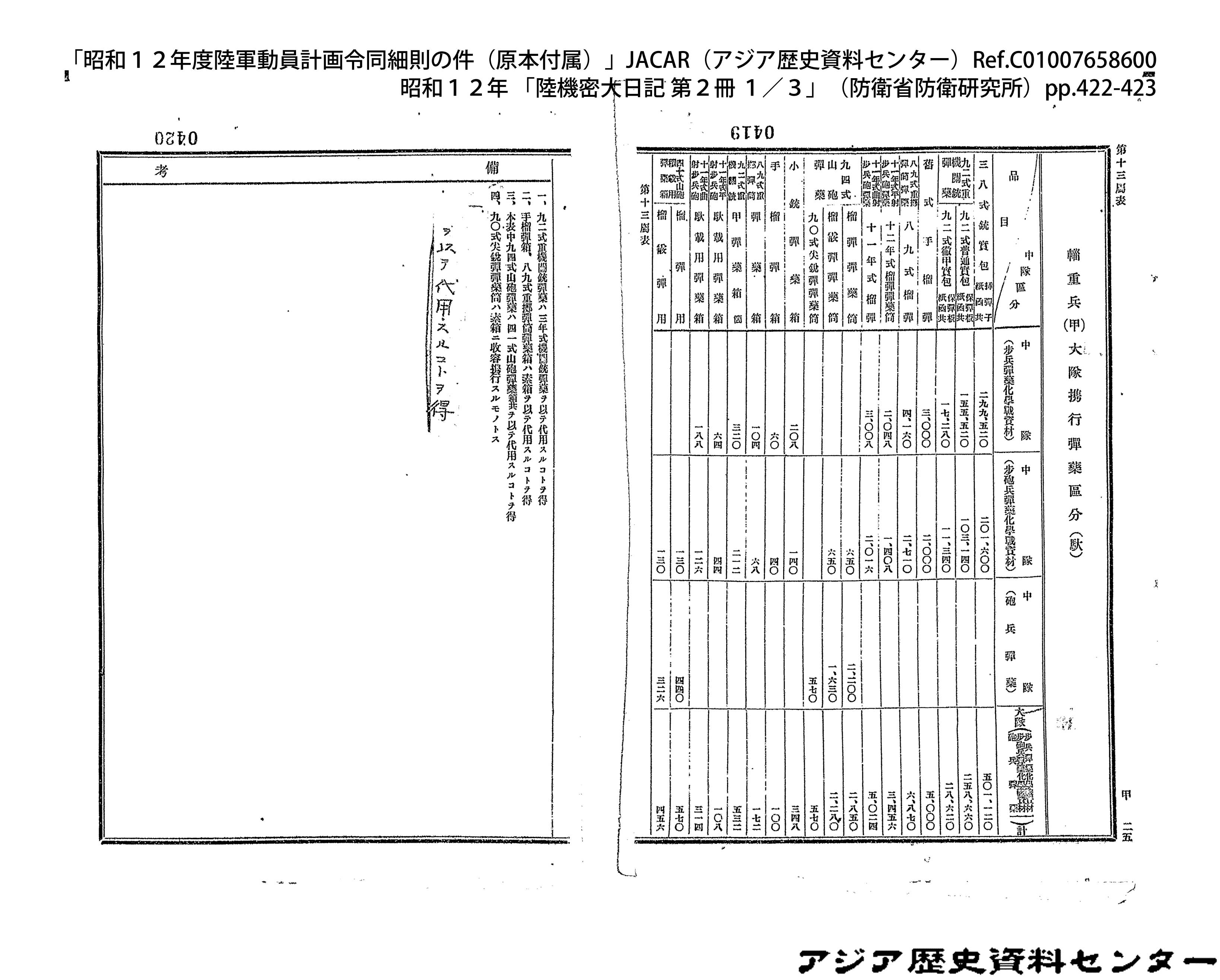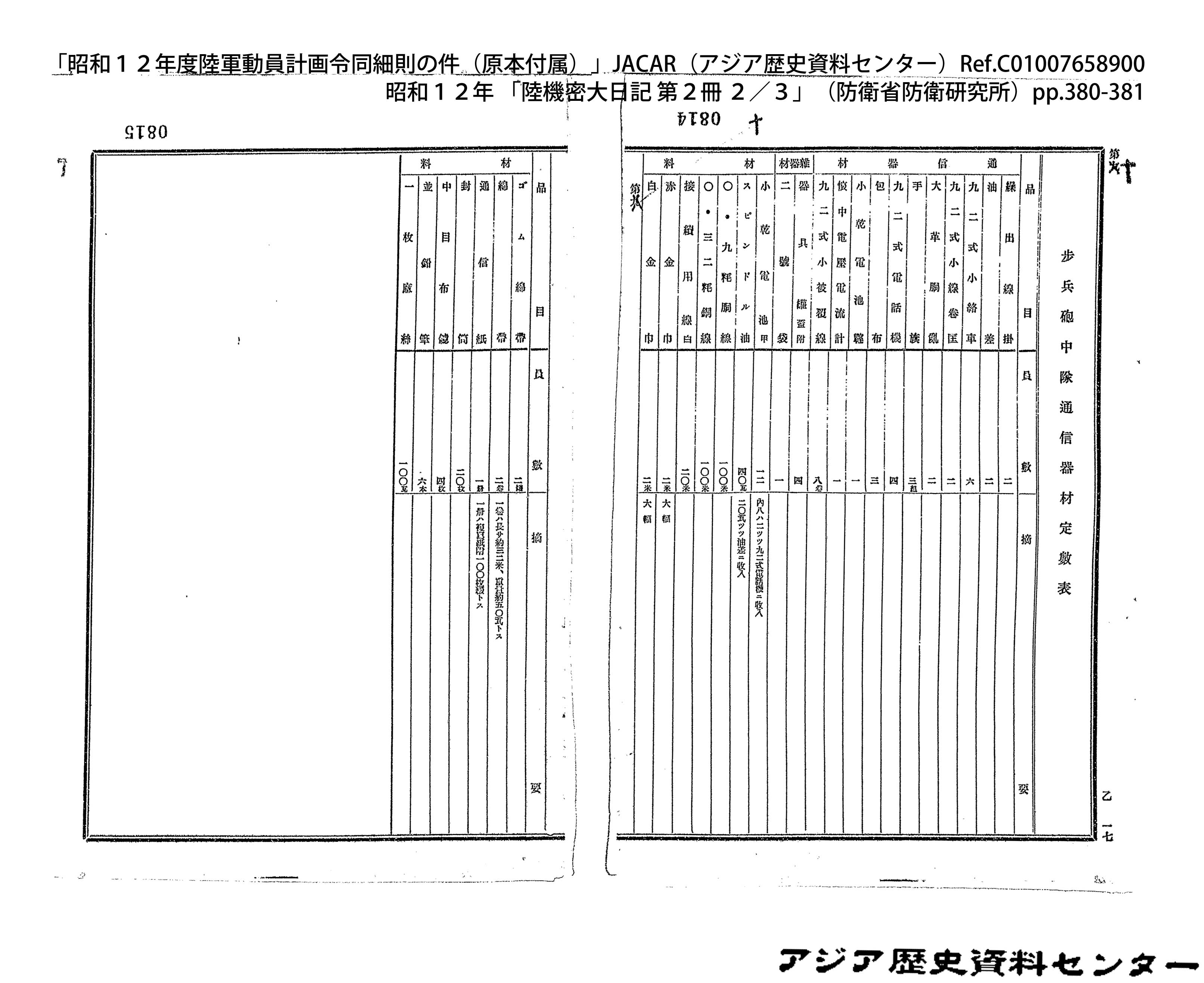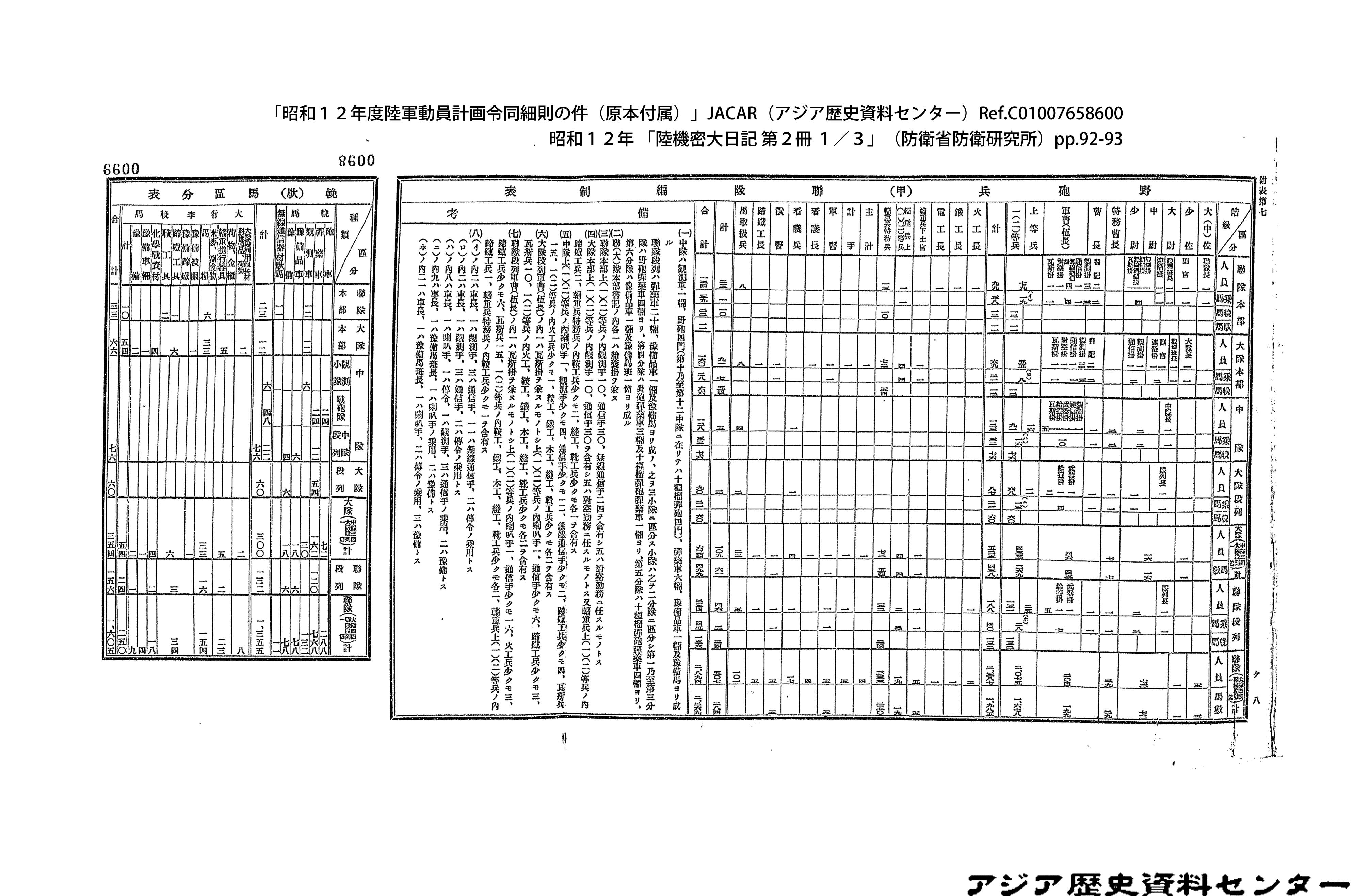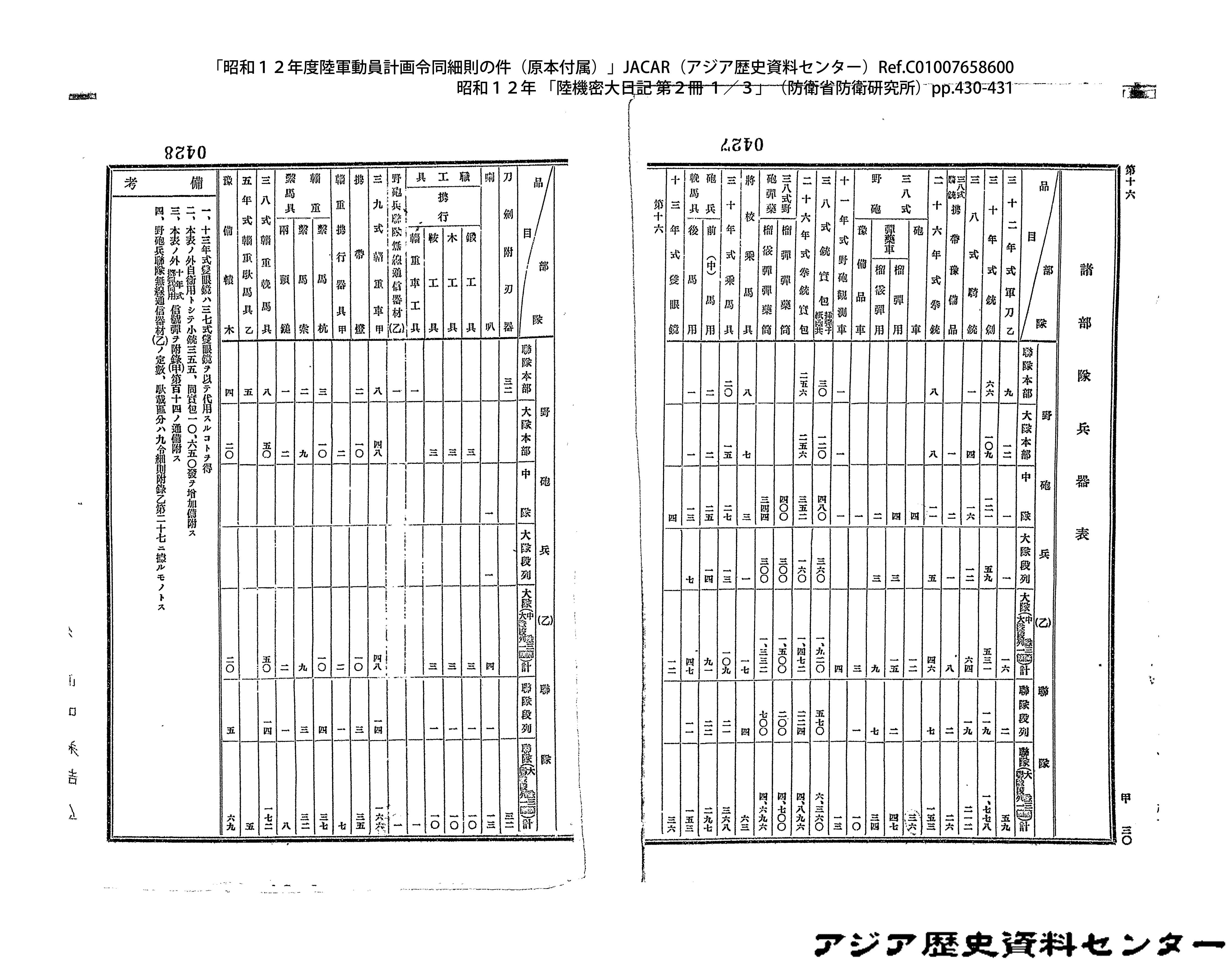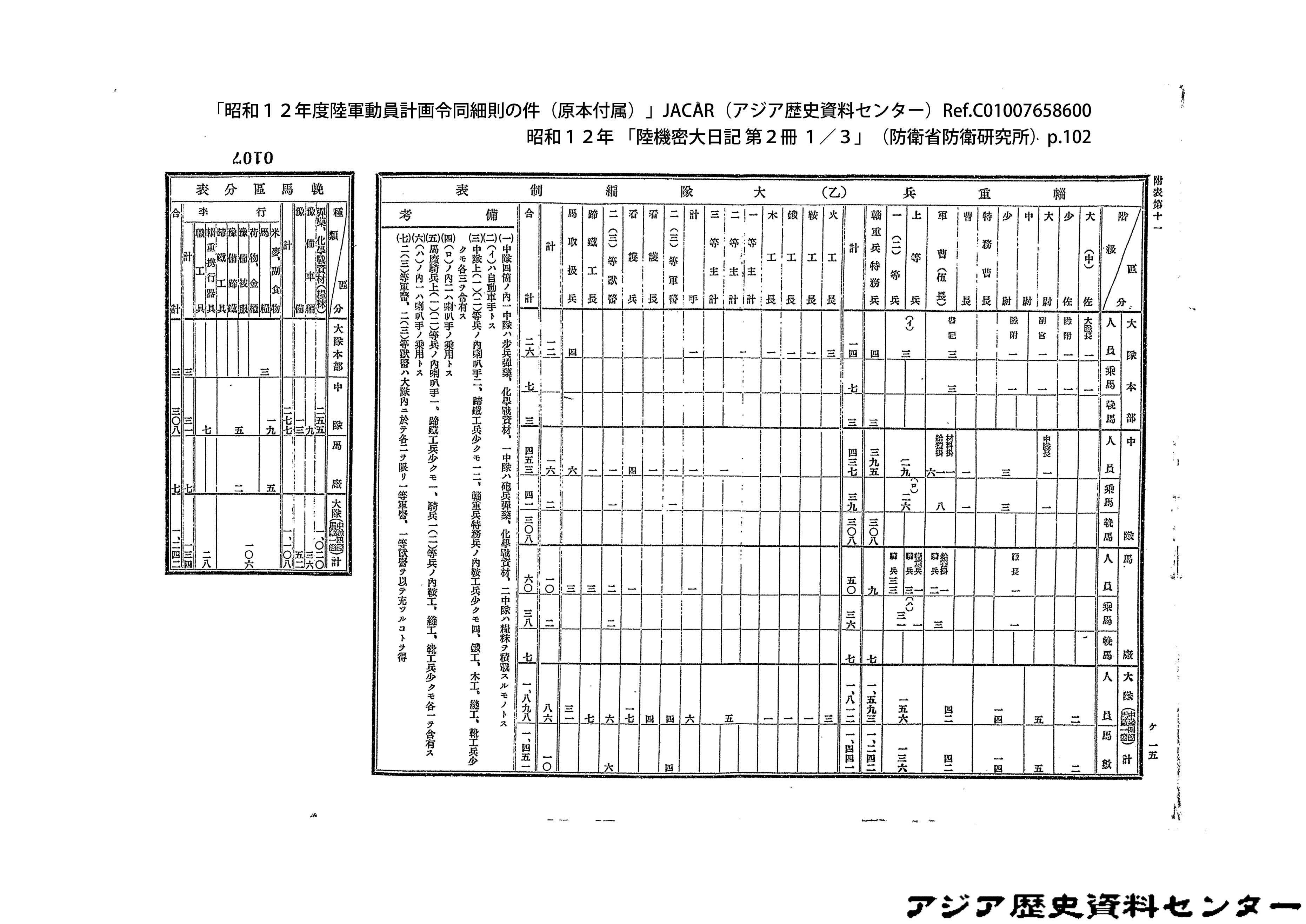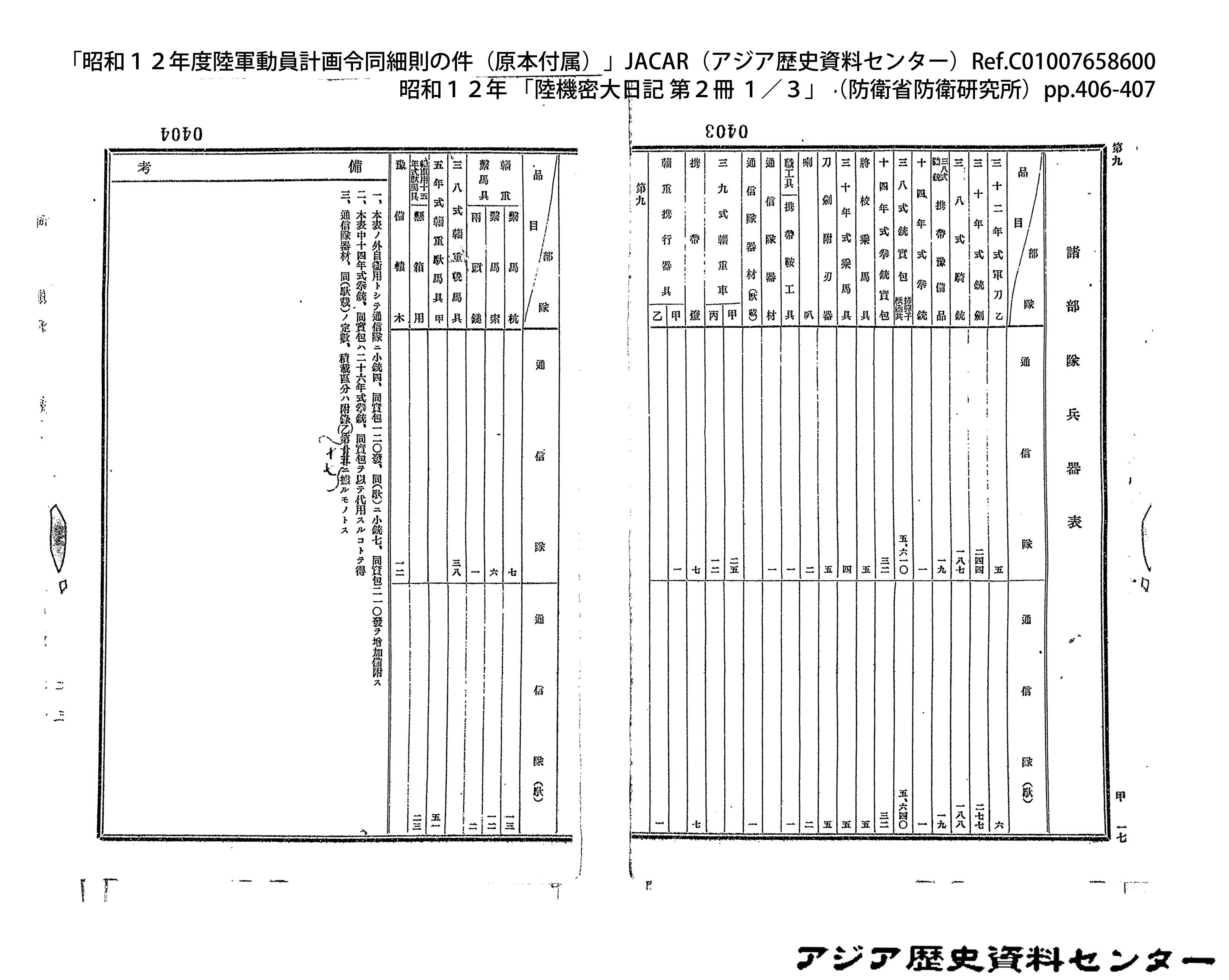 「昭和12年度陸軍動員計画令同細則の件(原本付属)」JACAR(アジア歴史資料センター)Ref.C01007659200、昭和12年 「陸機密大日記 第2冊 3/3」(防衛省防衛研究所)