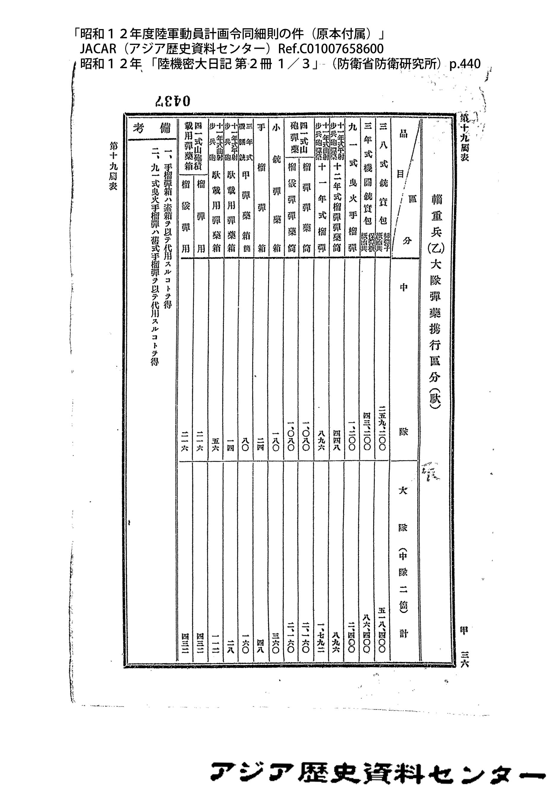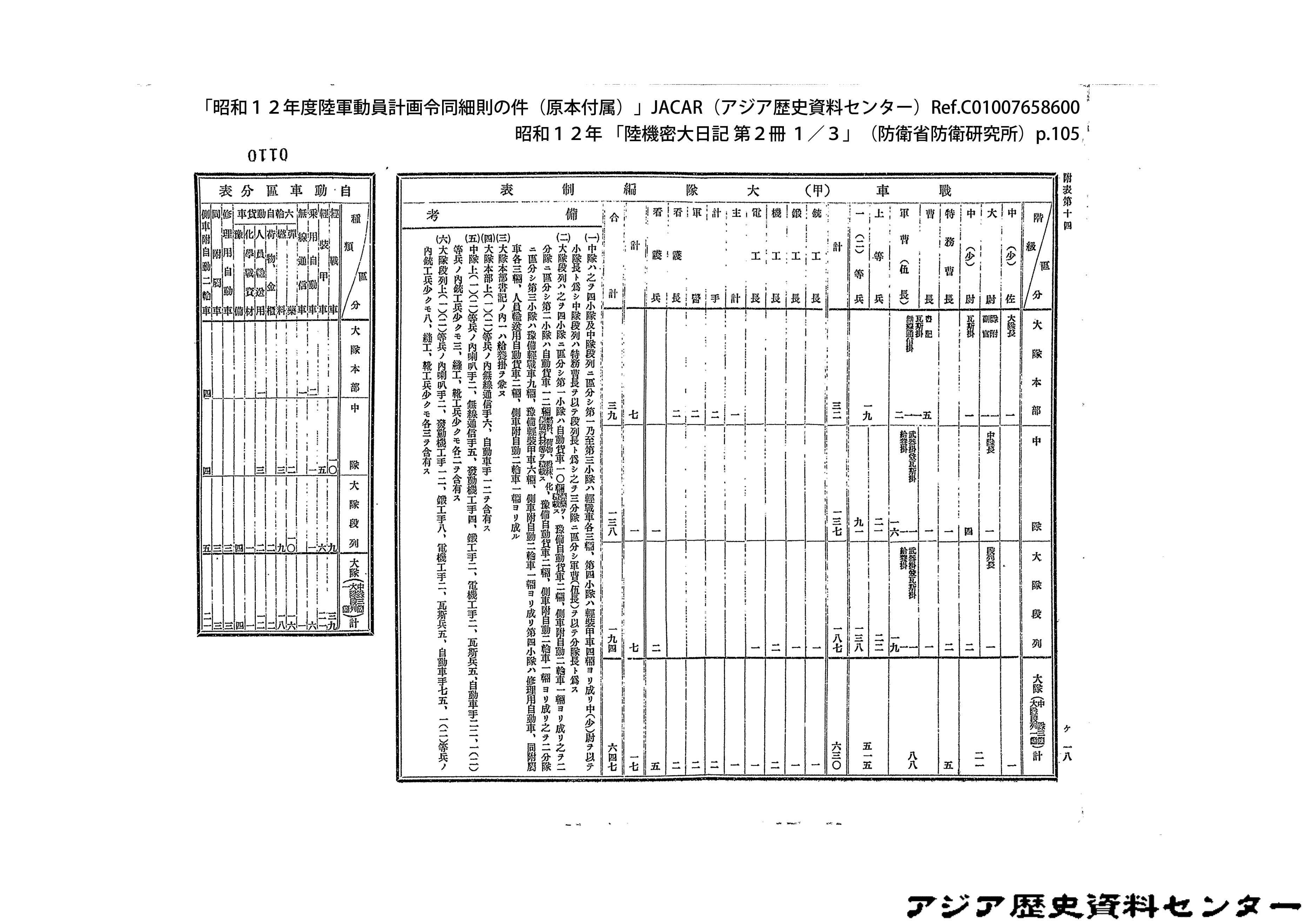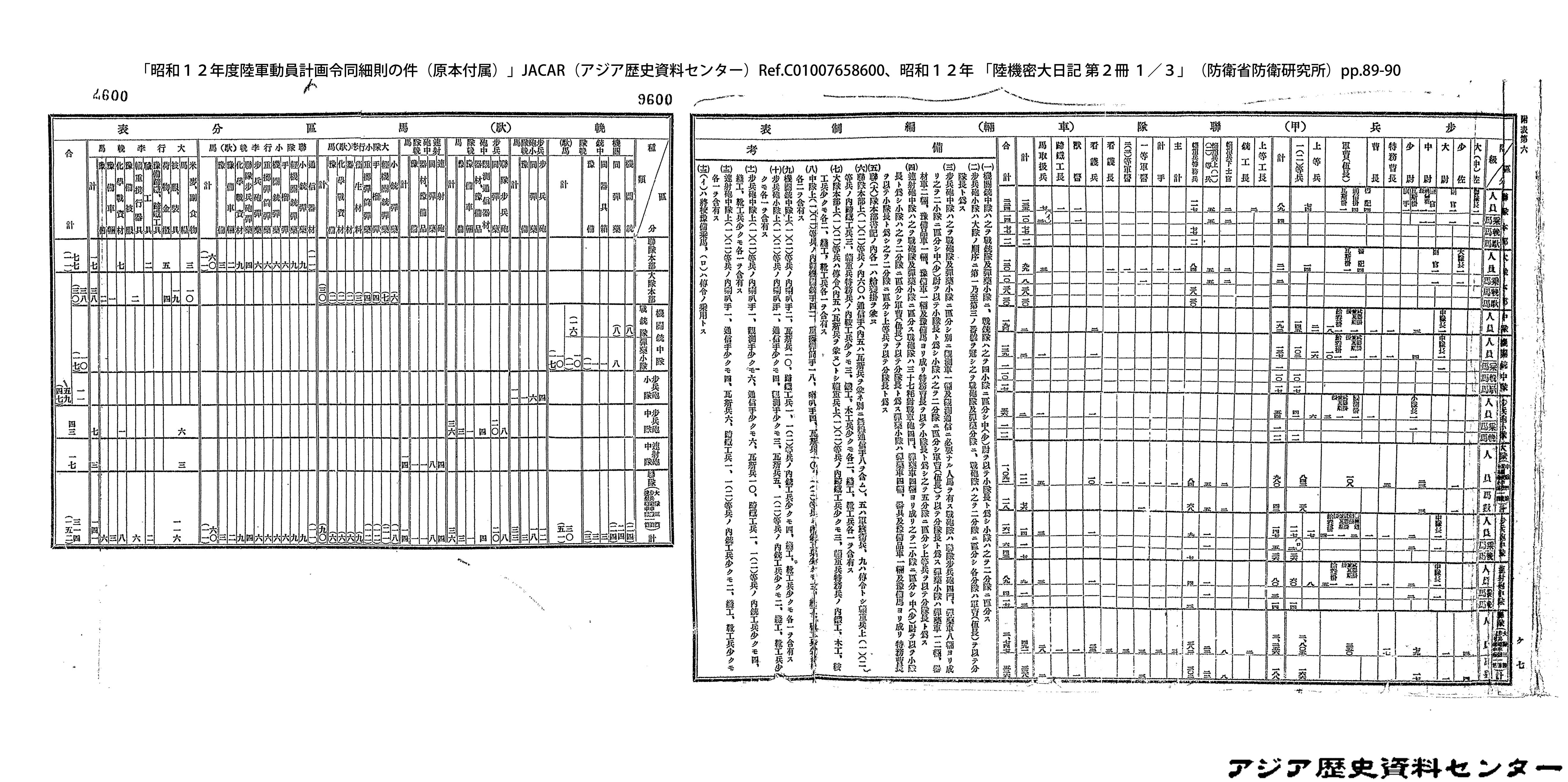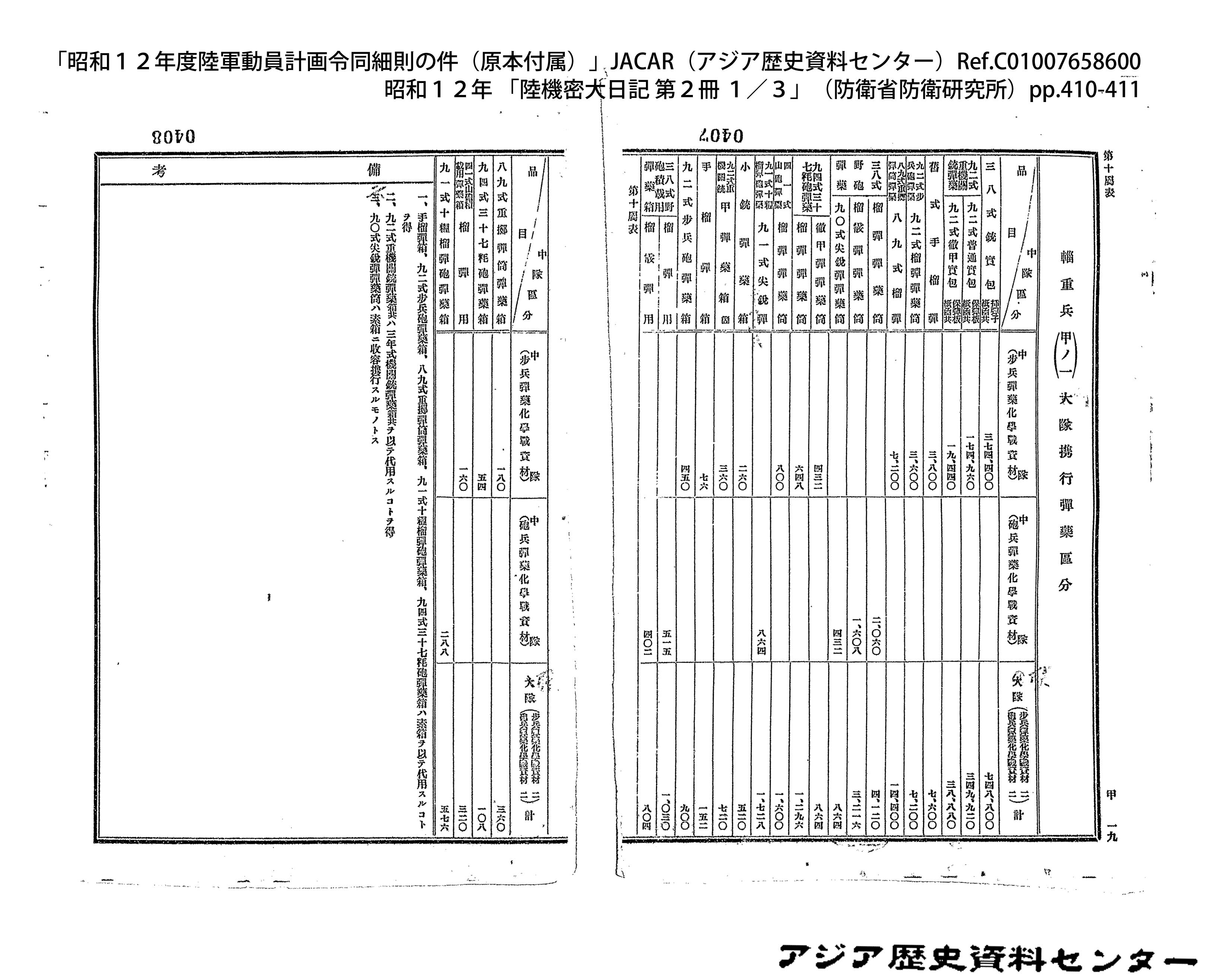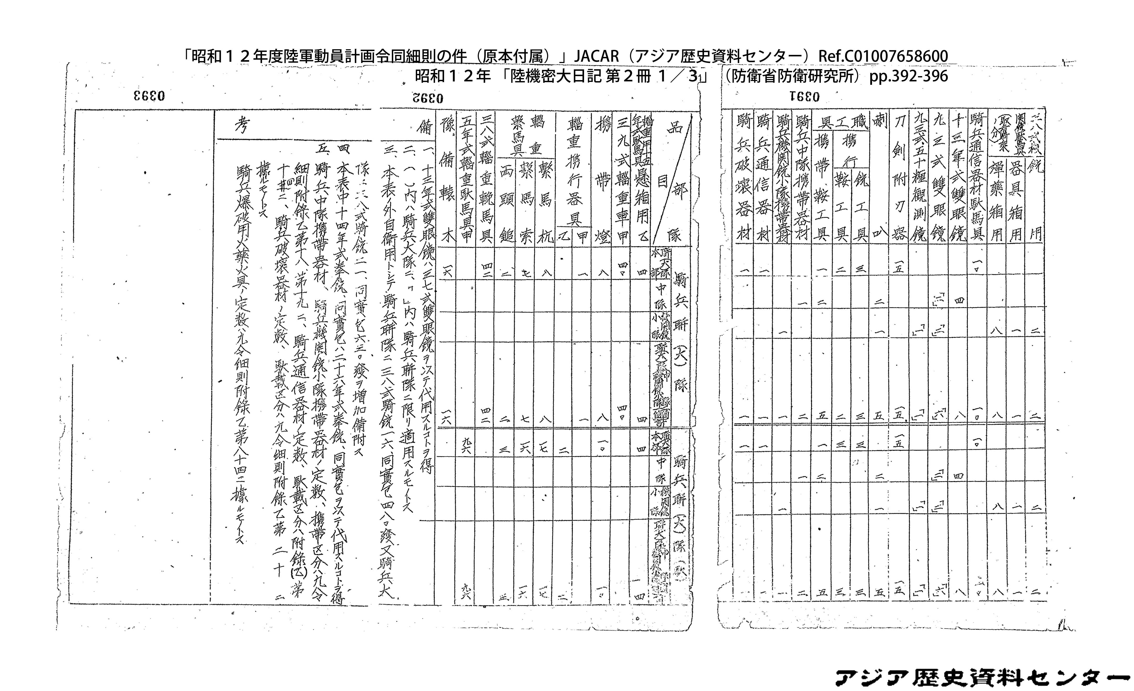 「昭和12年度陸軍動員計画令同細則の件(原本付属)」JACAR(アジア歴史資料センター)Ref.C01007659200、昭和12年 「陸機密大日記 第2冊 3/3」(防衛省防衛研究所)