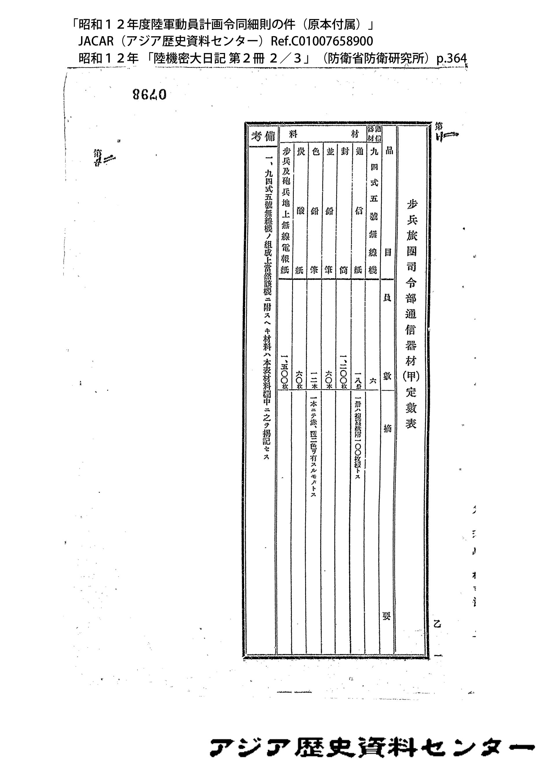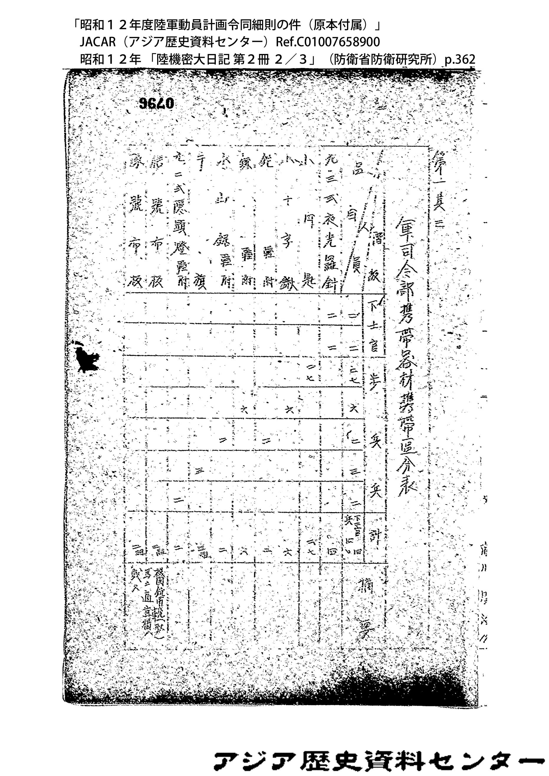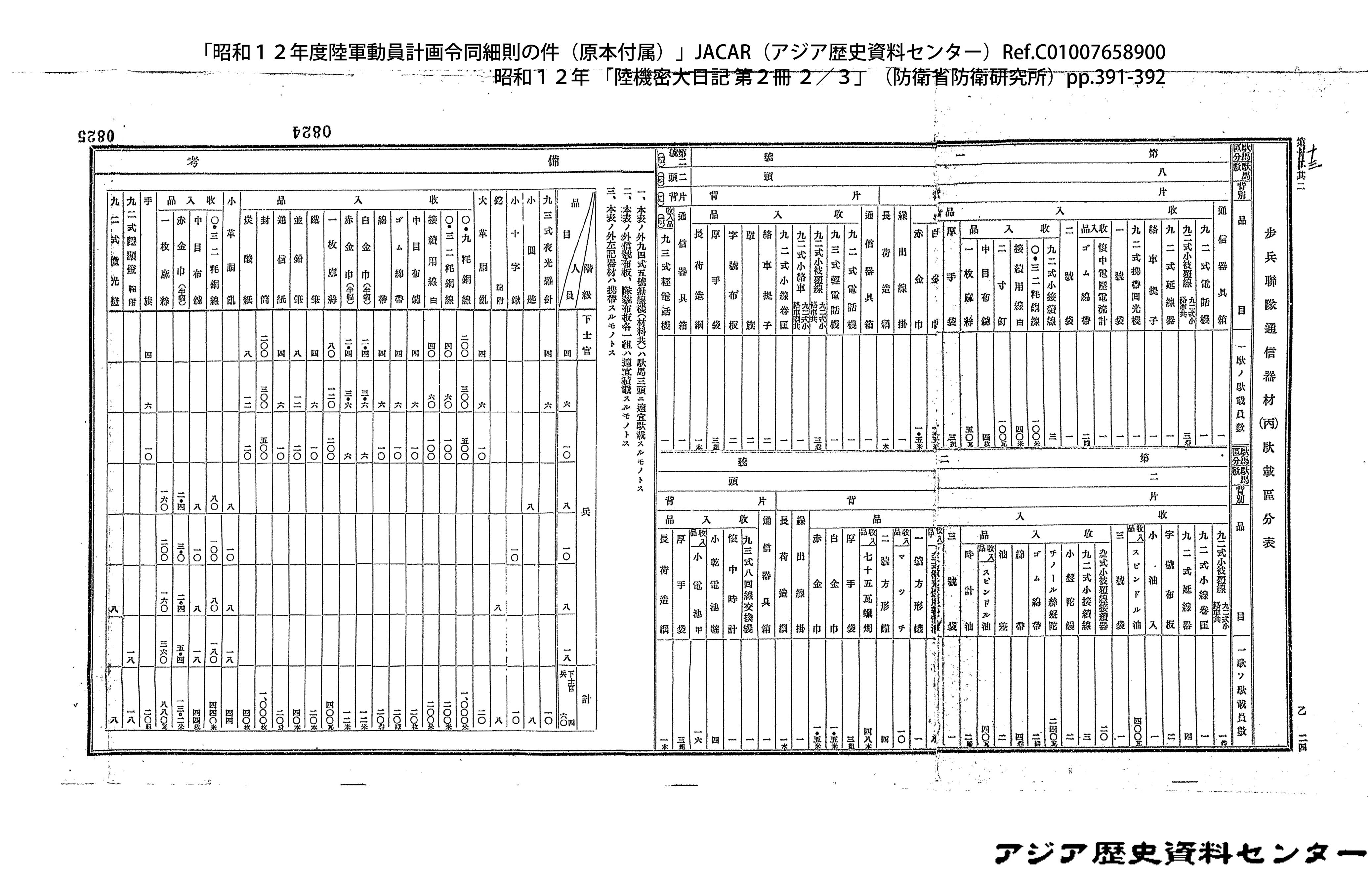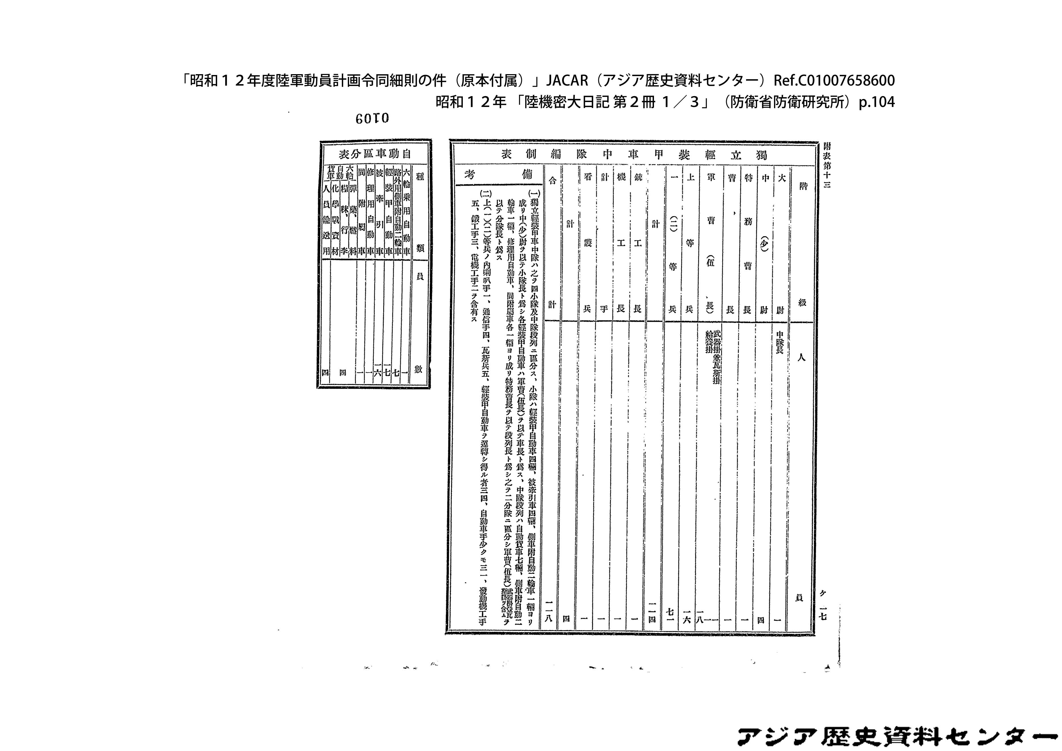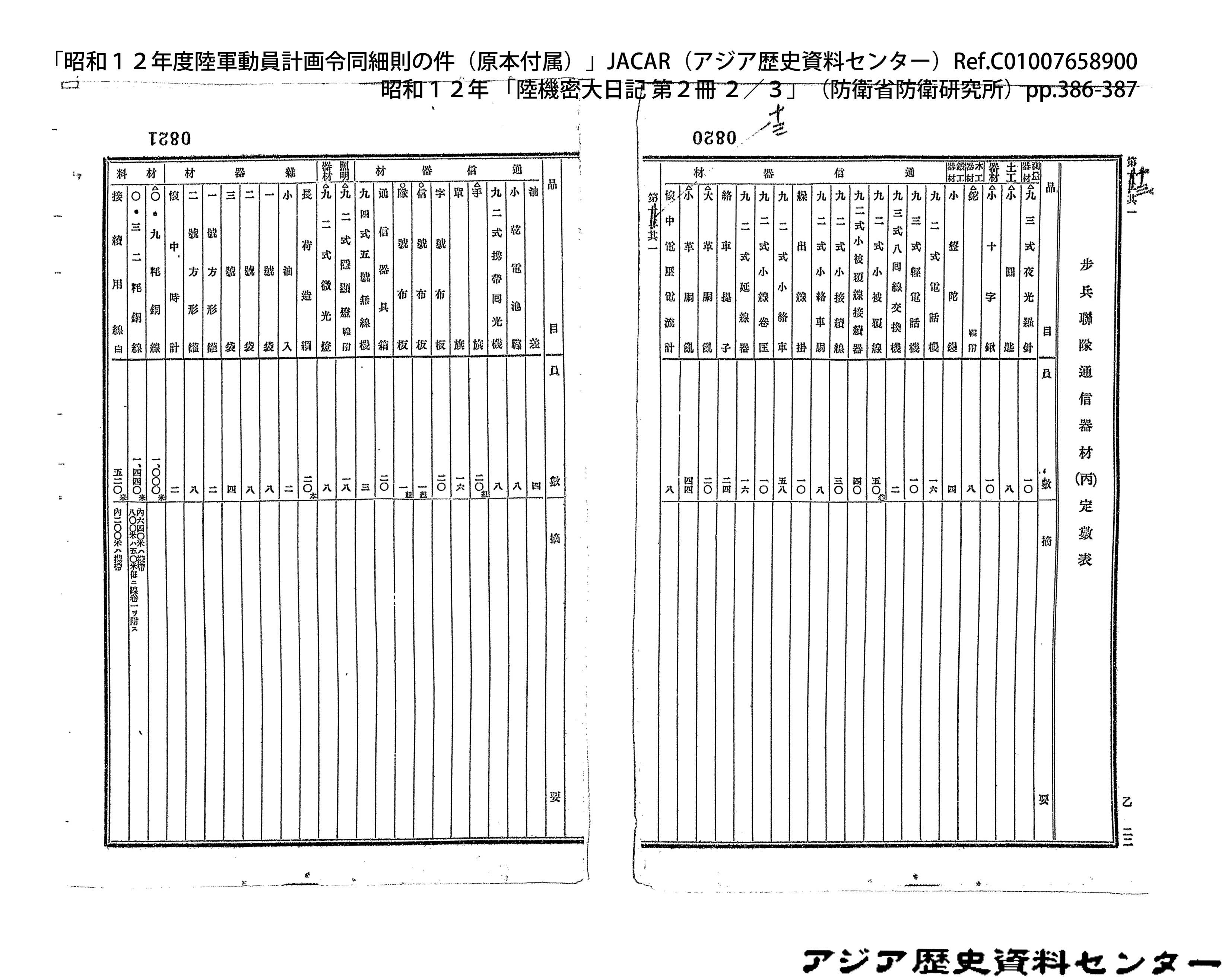 「昭和12年度陸軍動員計画令同細則の件(原本付属)」JACAR(アジア歴史資料センター)Ref.C01007659200、昭和12年 「陸機密大日記 第2冊 3/3」(防衛省防衛研究所)