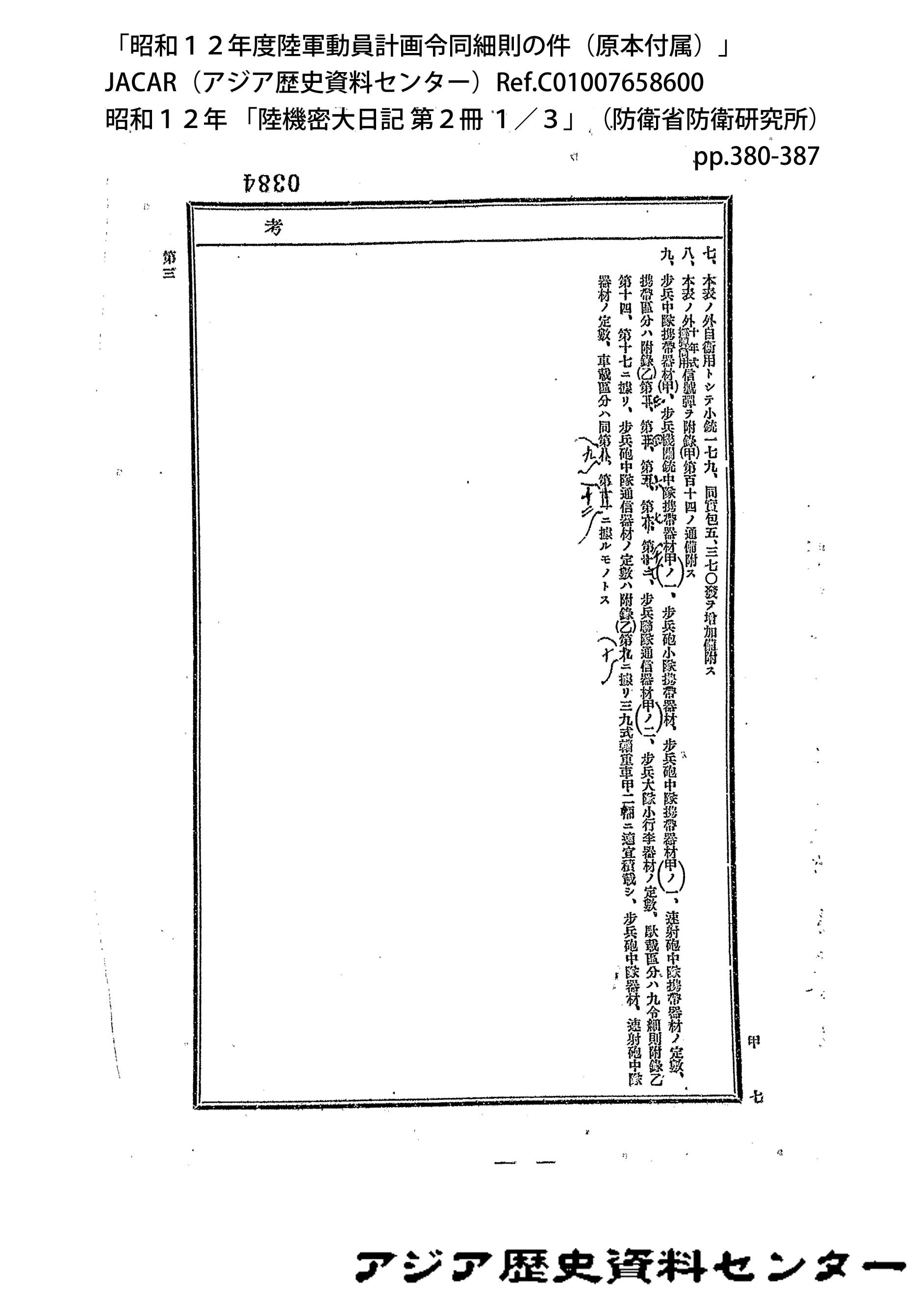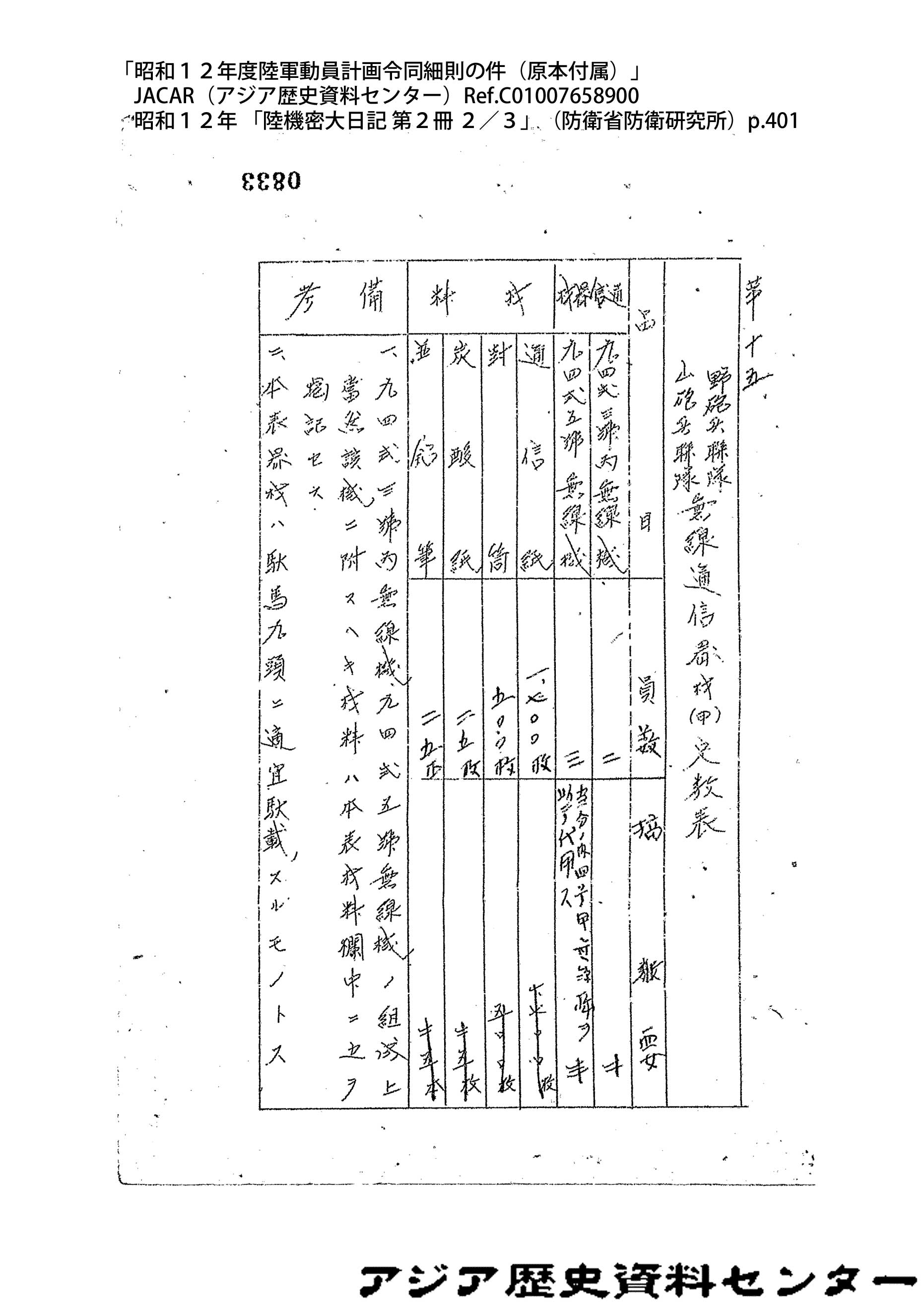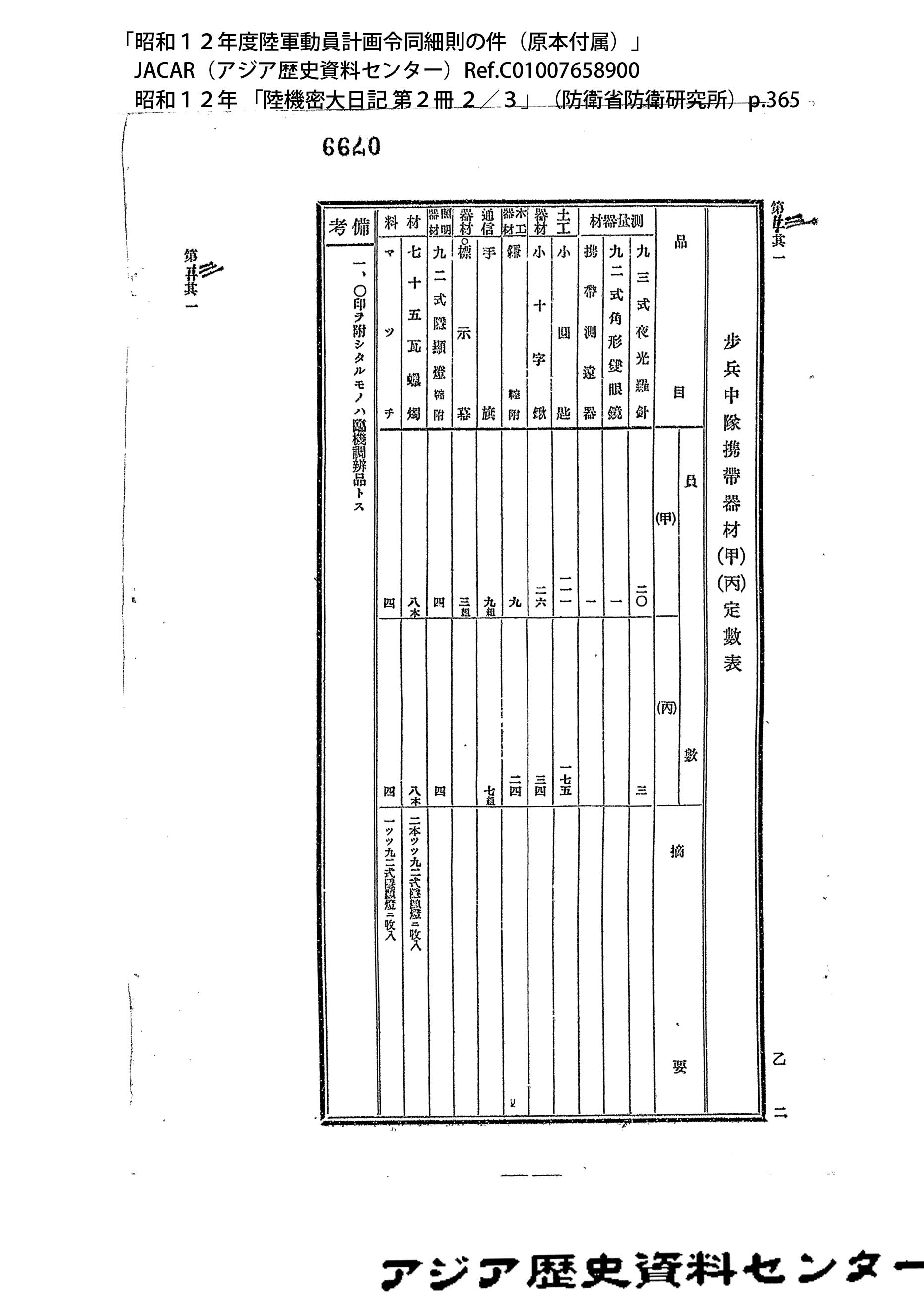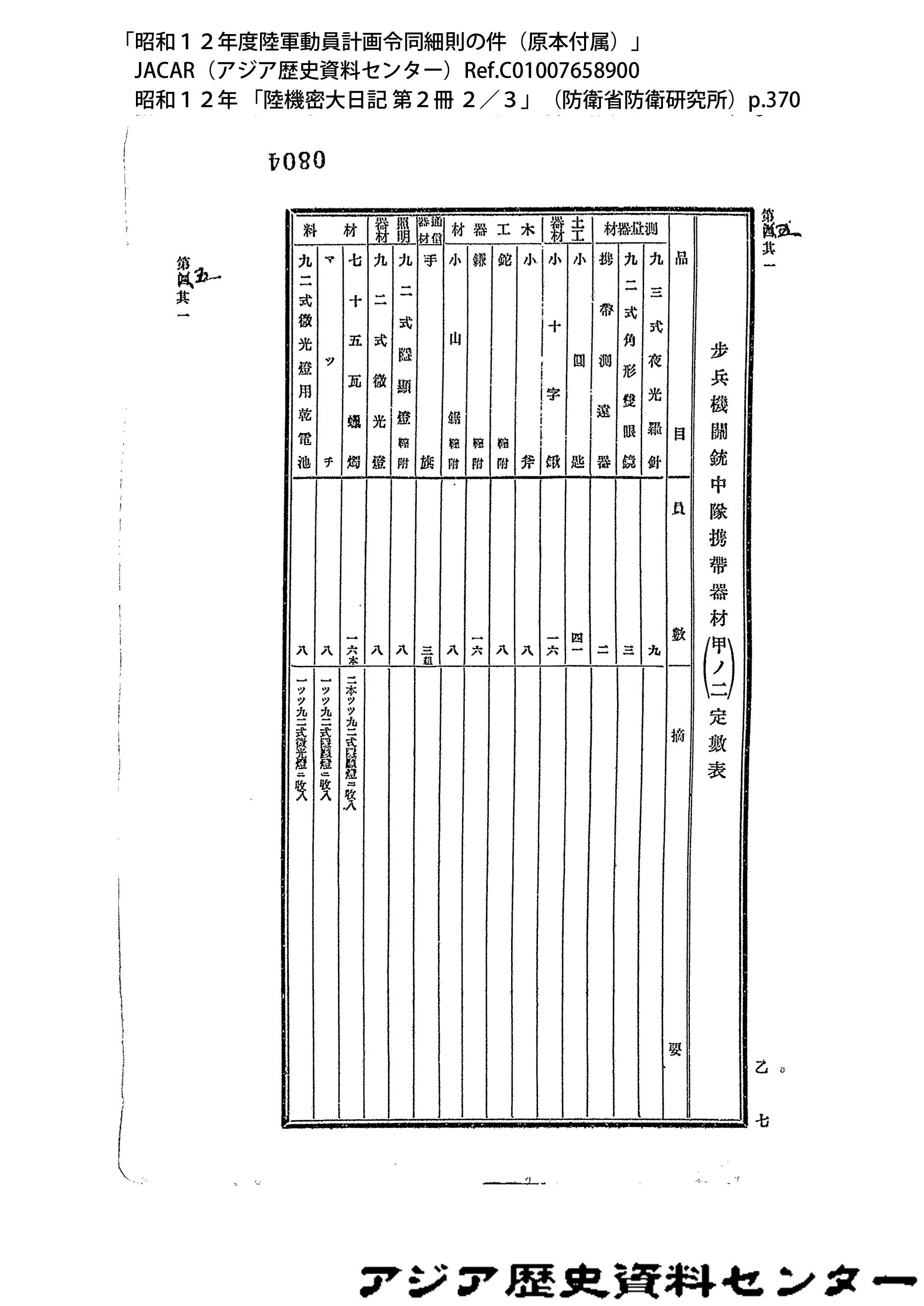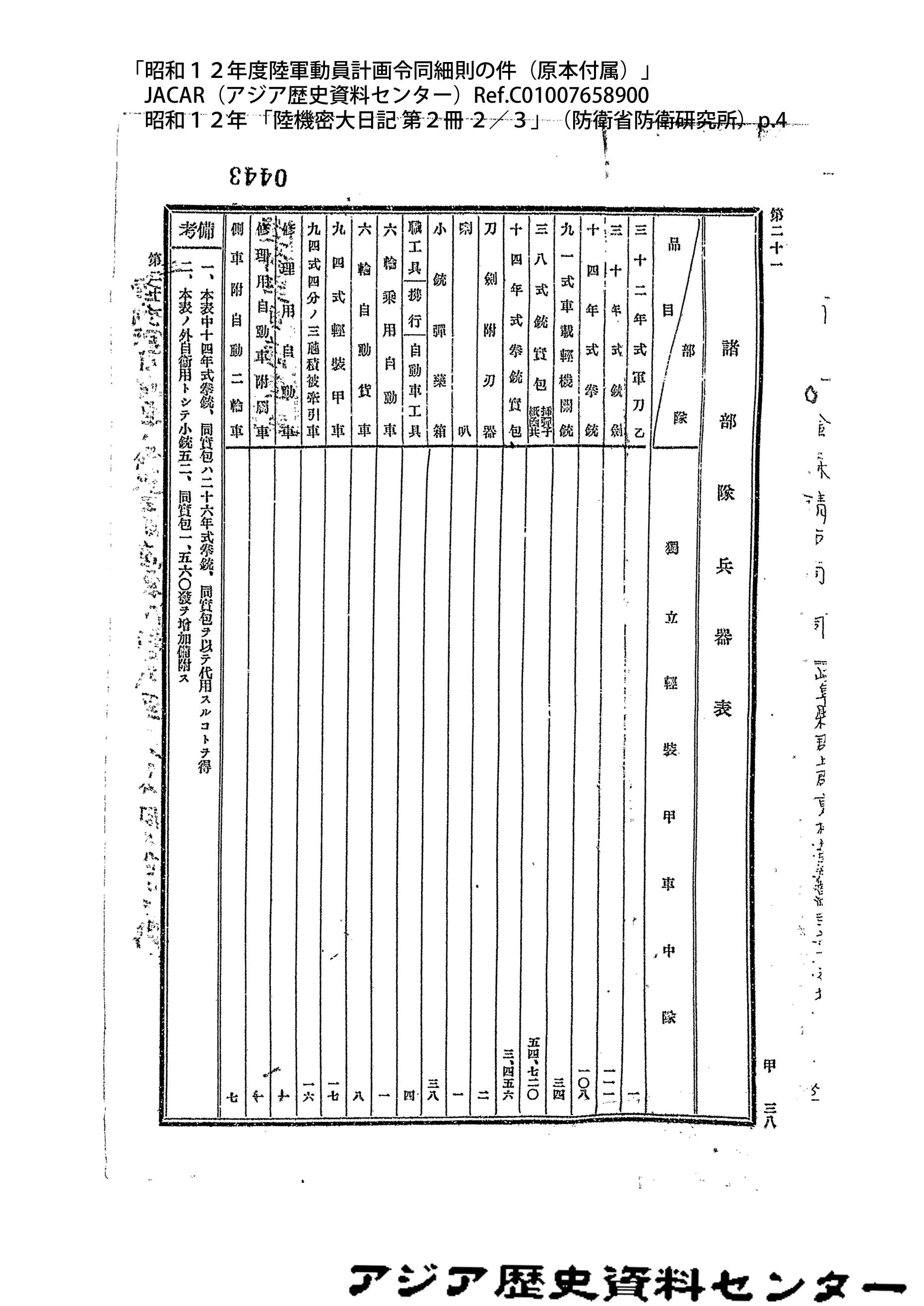 「昭和12年度陸軍動員計画令同細則の件(原本付属)」JACAR(アジア歴史資料センター)Ref.C01007659200、昭和12年 「陸機密大日記 第2冊 3/3」(防衛省防衛研究所)