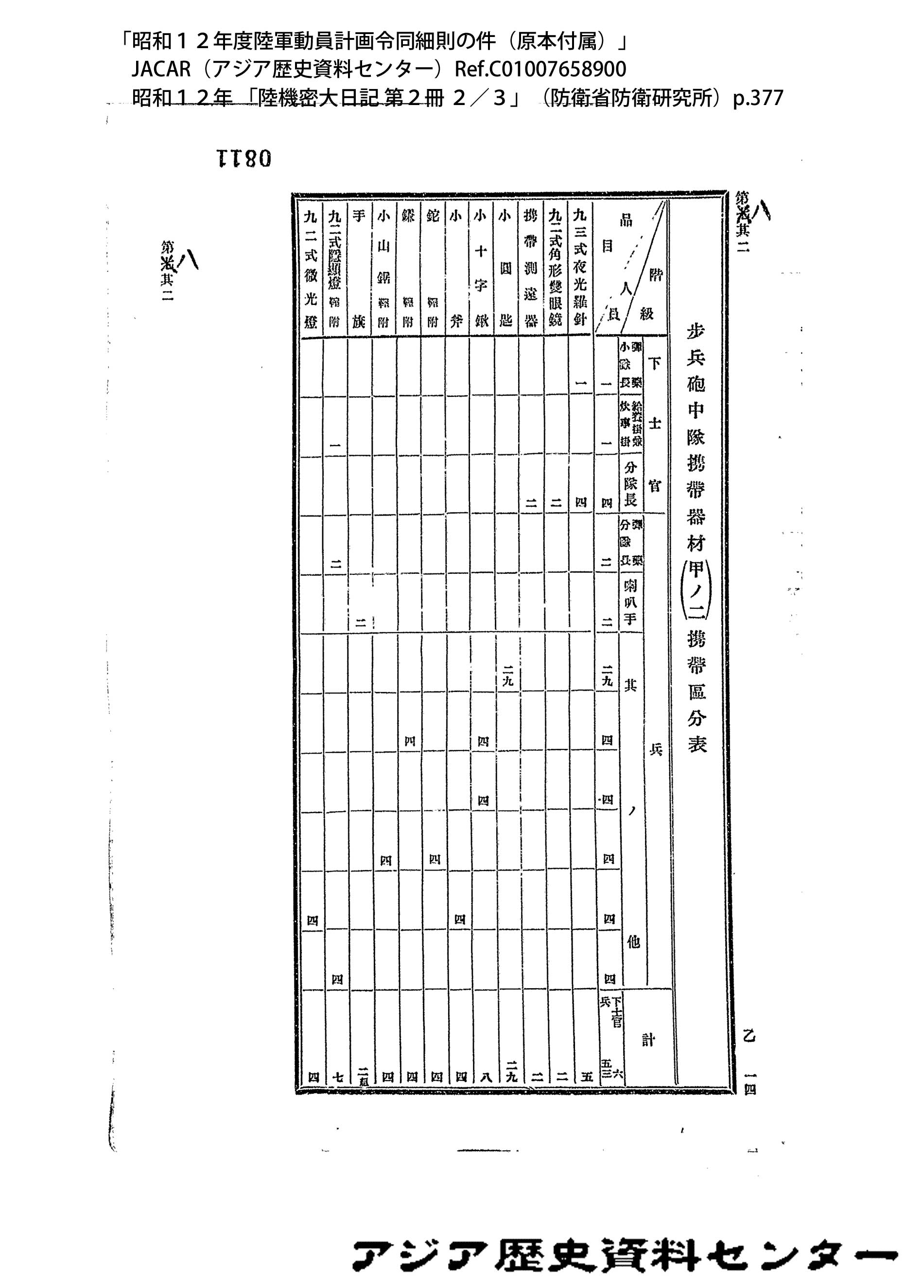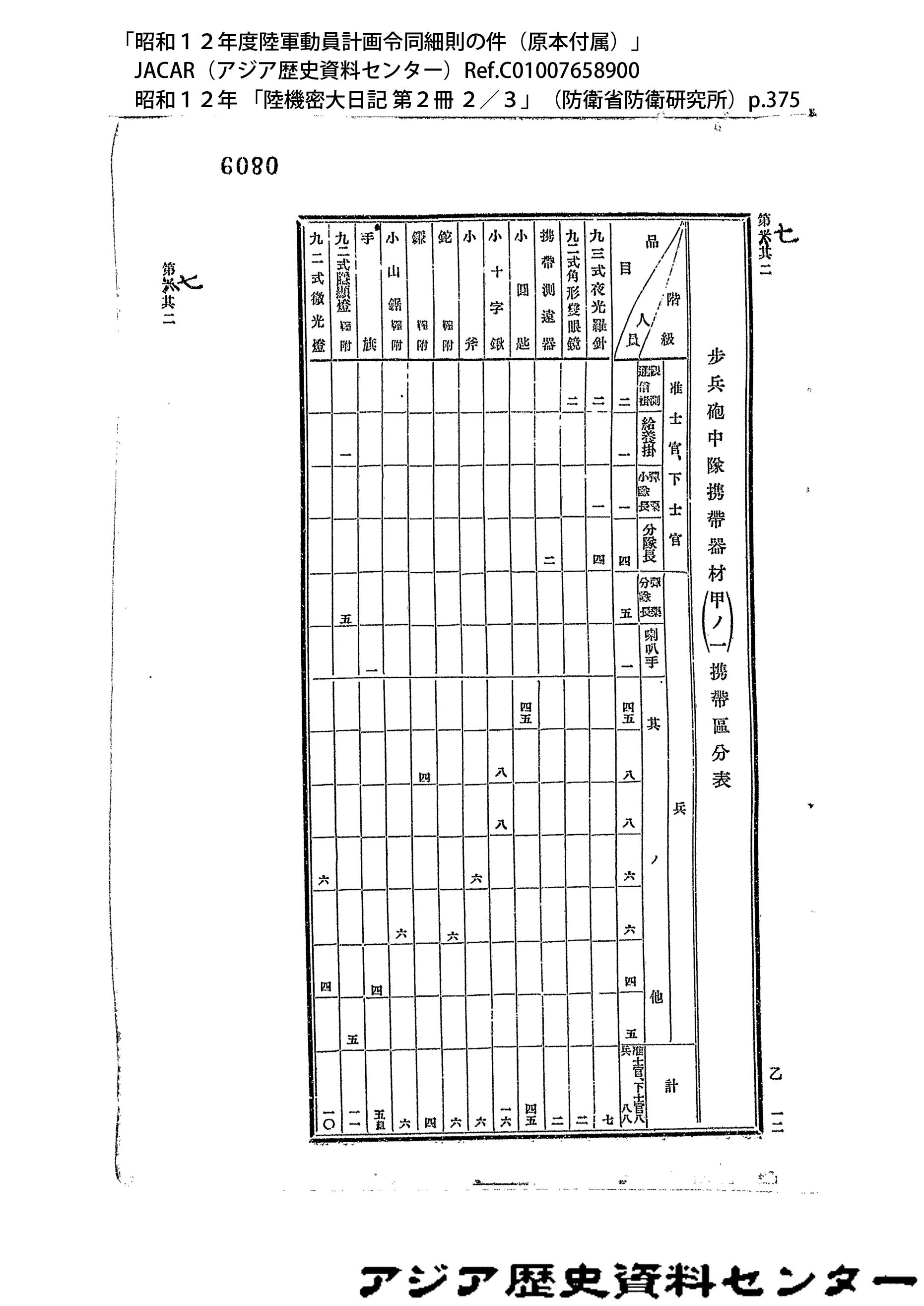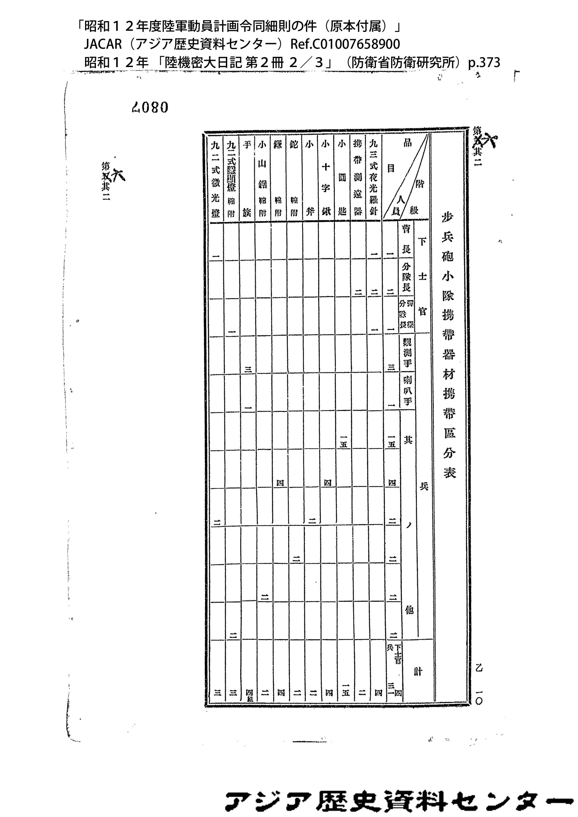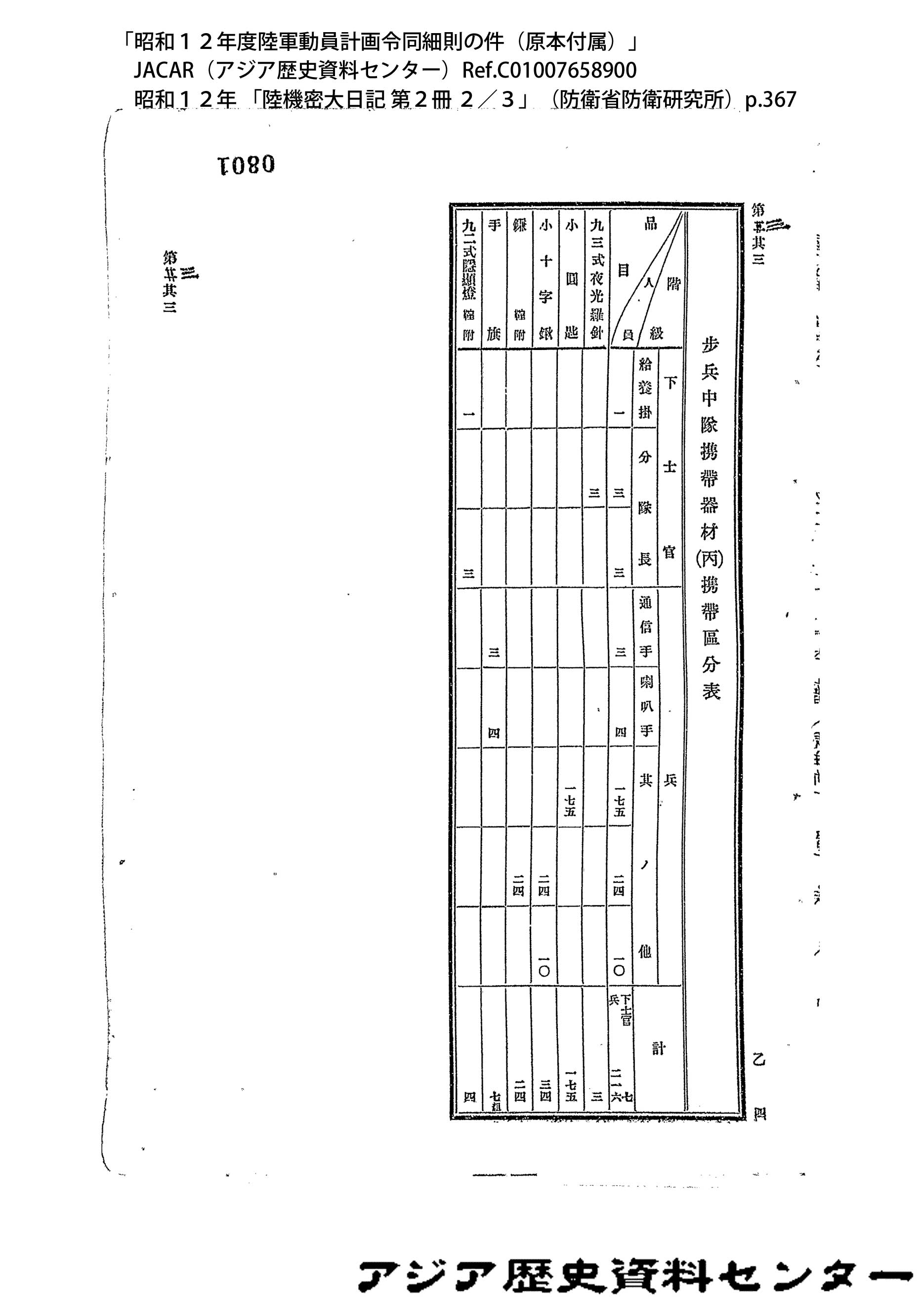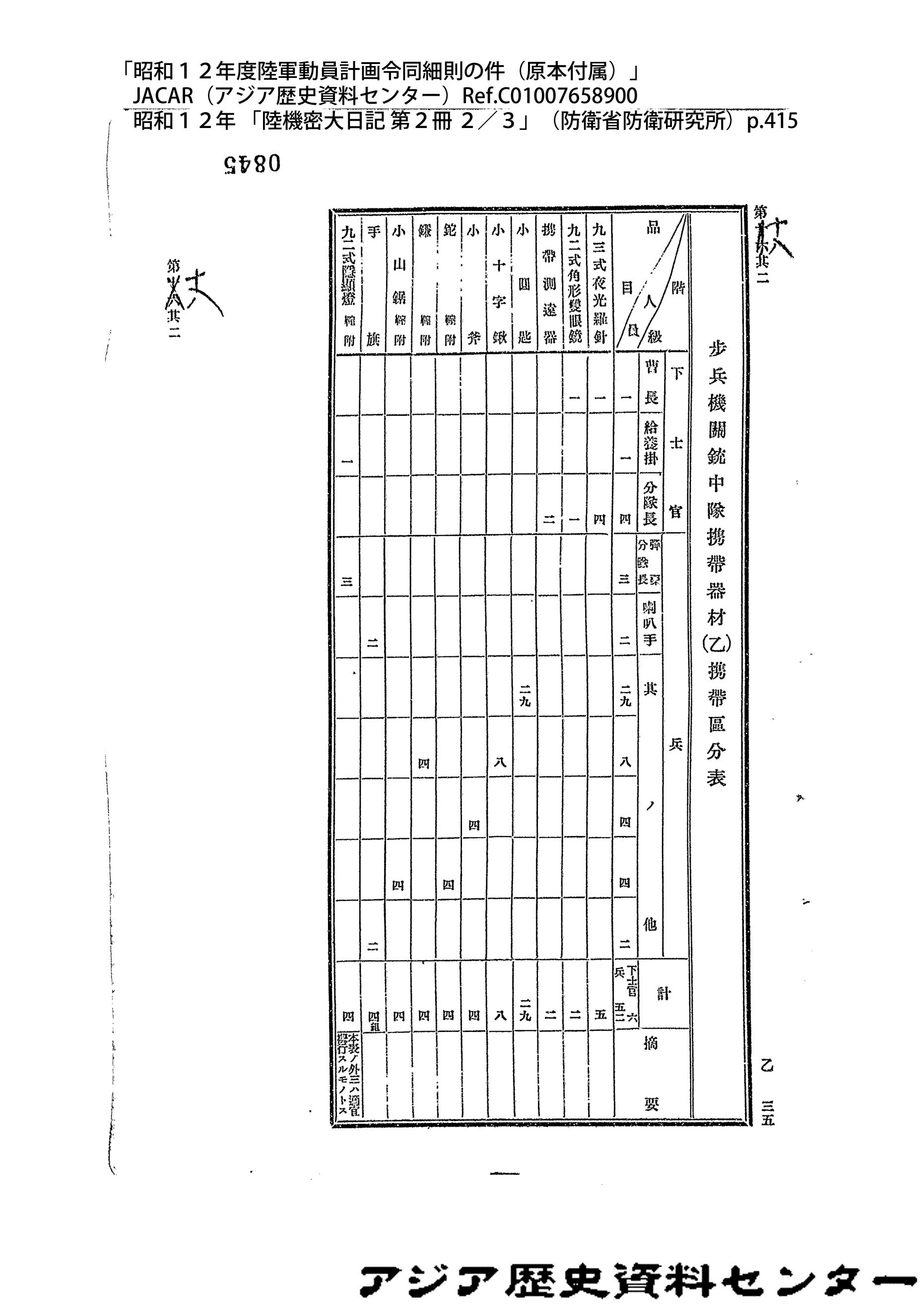 「昭和12年度陸軍動員計画令同細則の件(原本付属)」JACAR(アジア歴史資料センター)Ref.C01007659200、昭和12年 「陸機密大日記 第2冊 3/3」(防衛省防衛研究所)