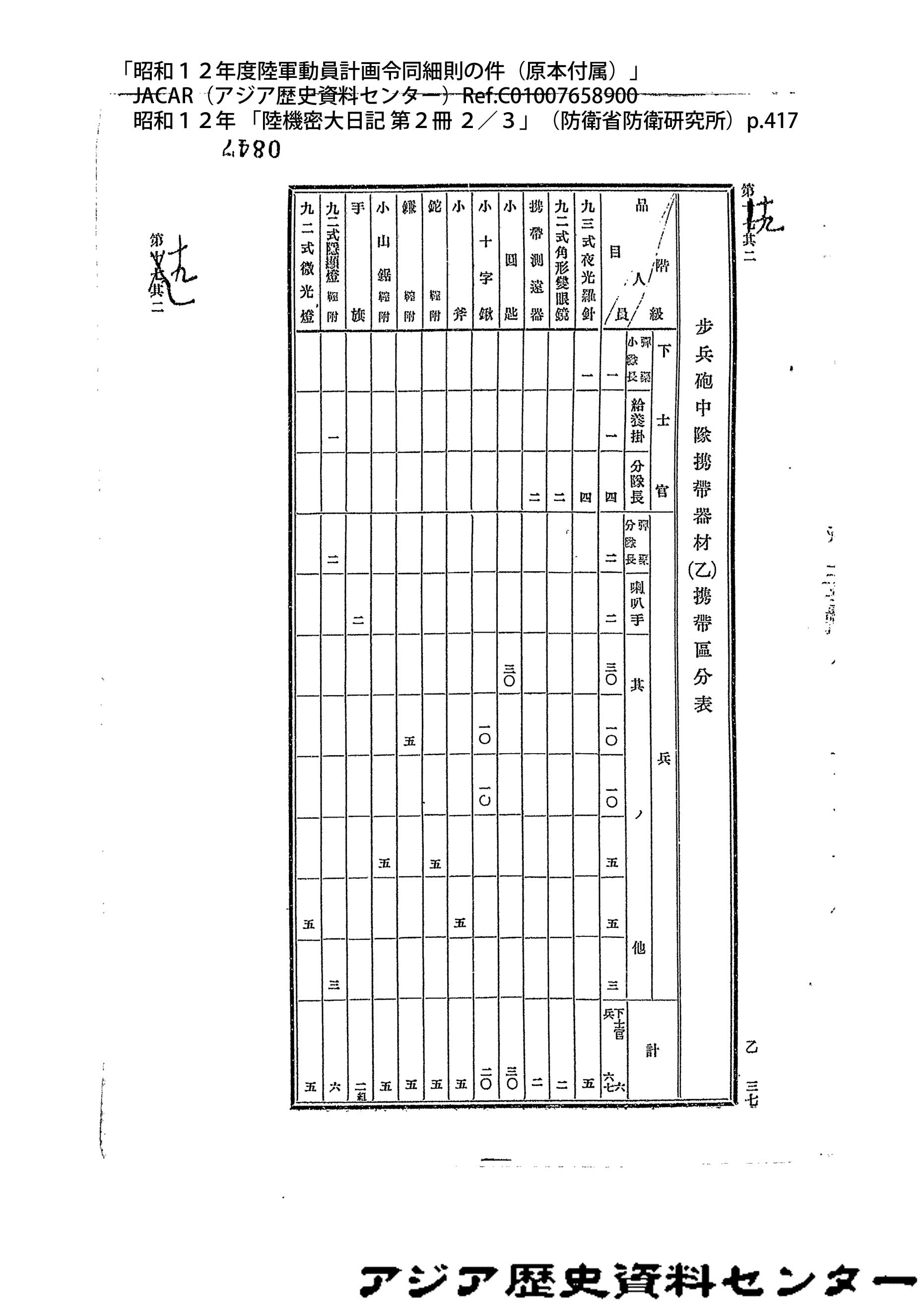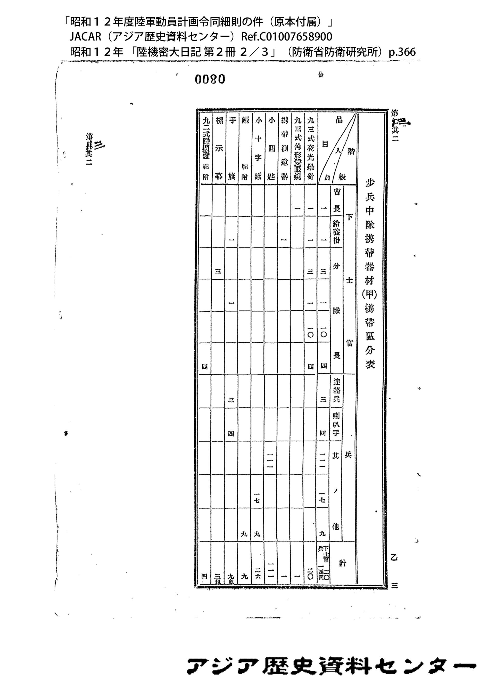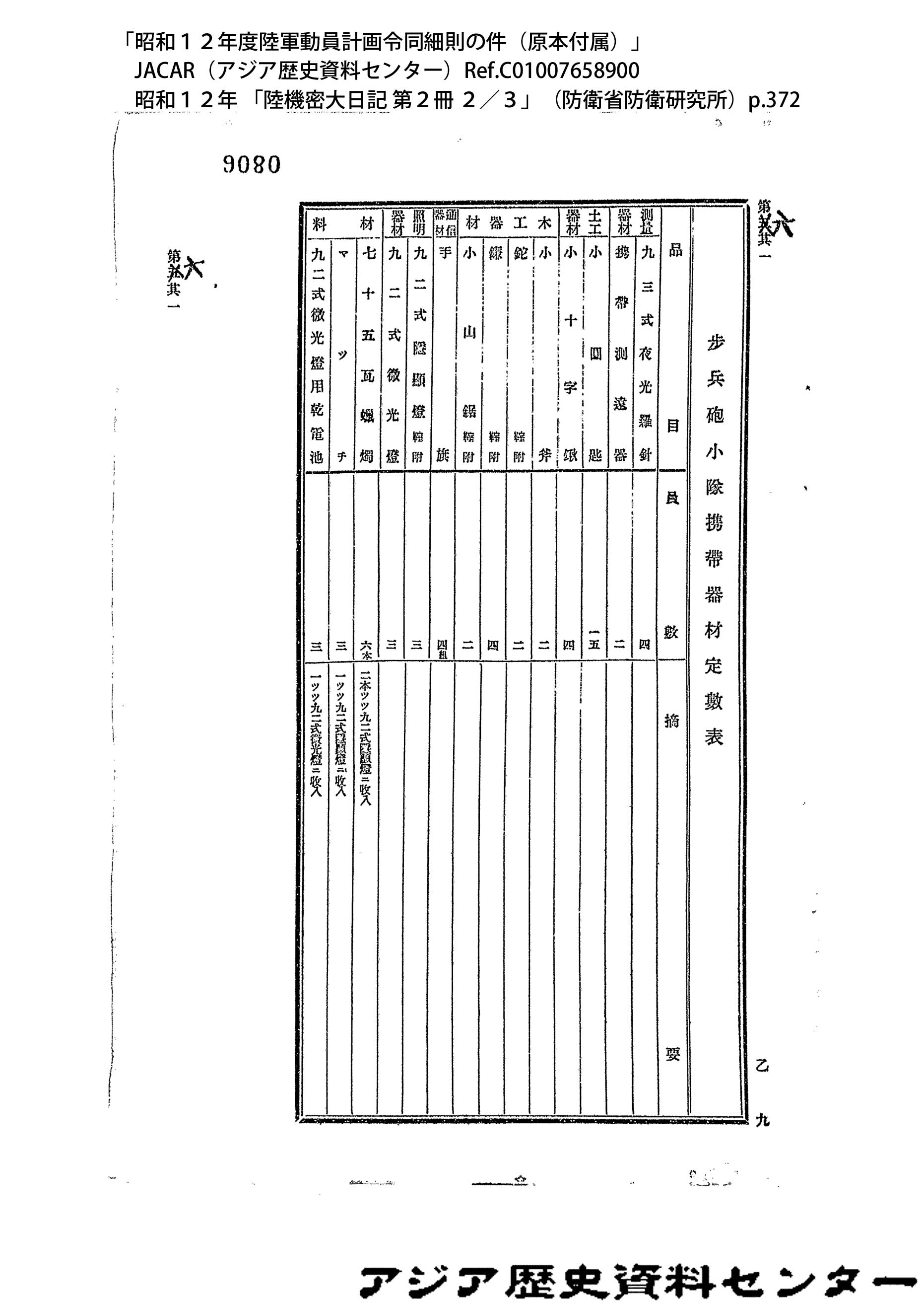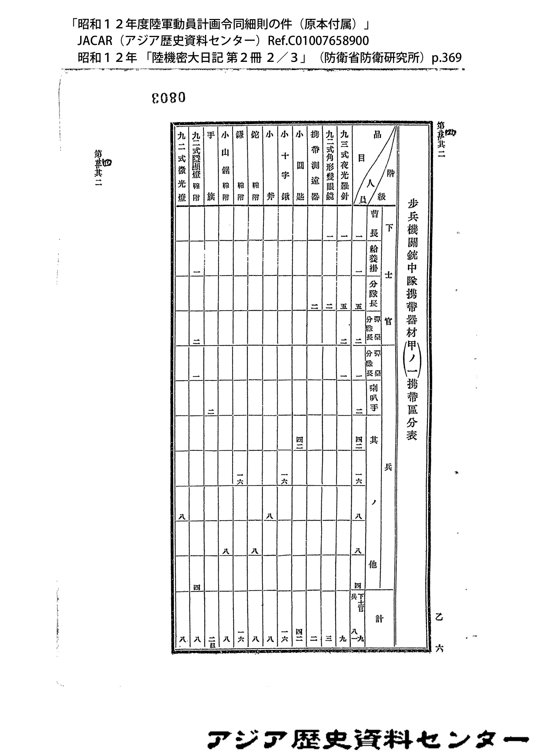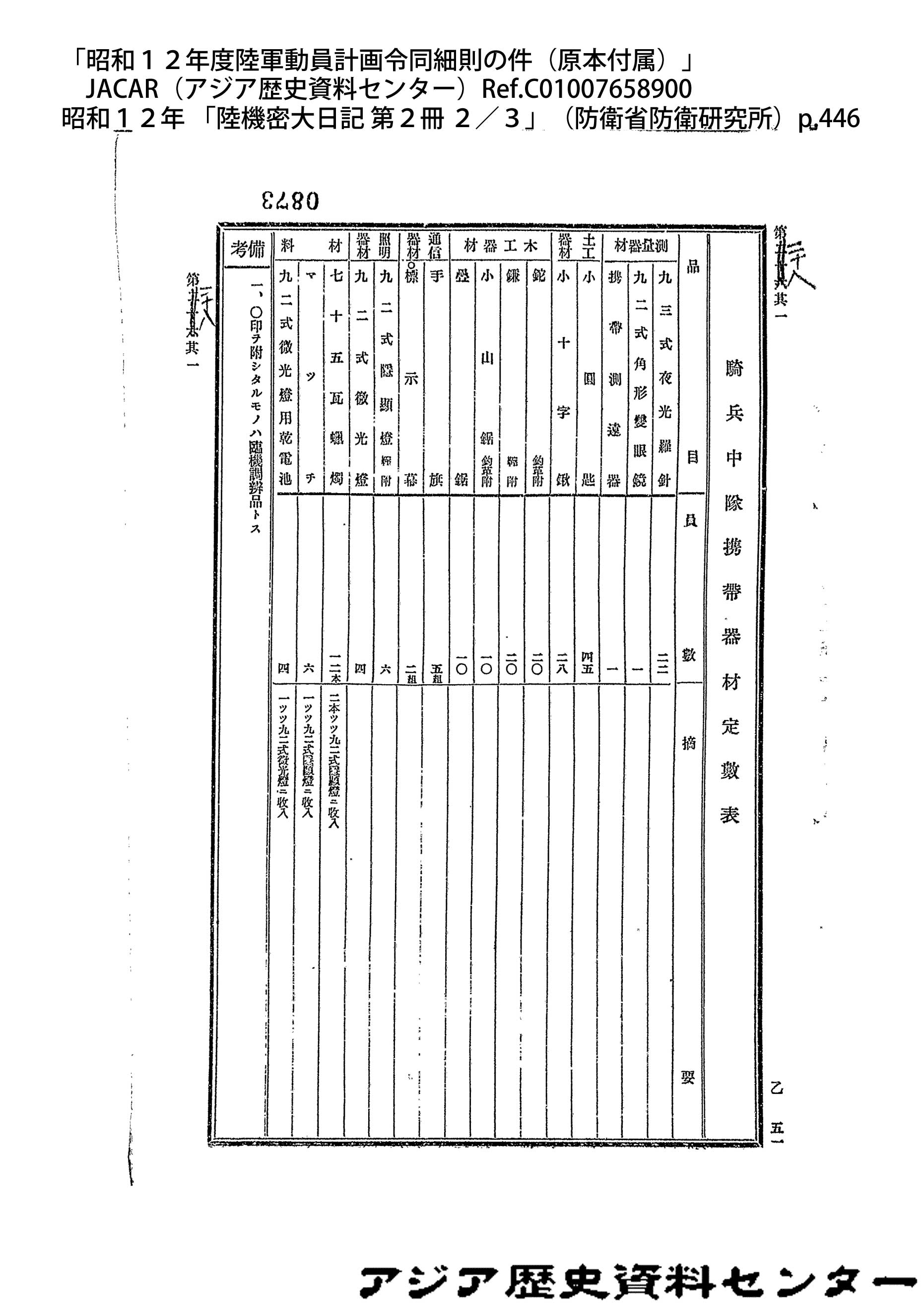 「昭和12年度陸軍動員計画令同細則の件(原本付属)」JACAR(アジア歴史資料センター)Ref.C01007659200、昭和12年 「陸機密大日記 第2冊 3/3」(防衛省防衛研究所)
