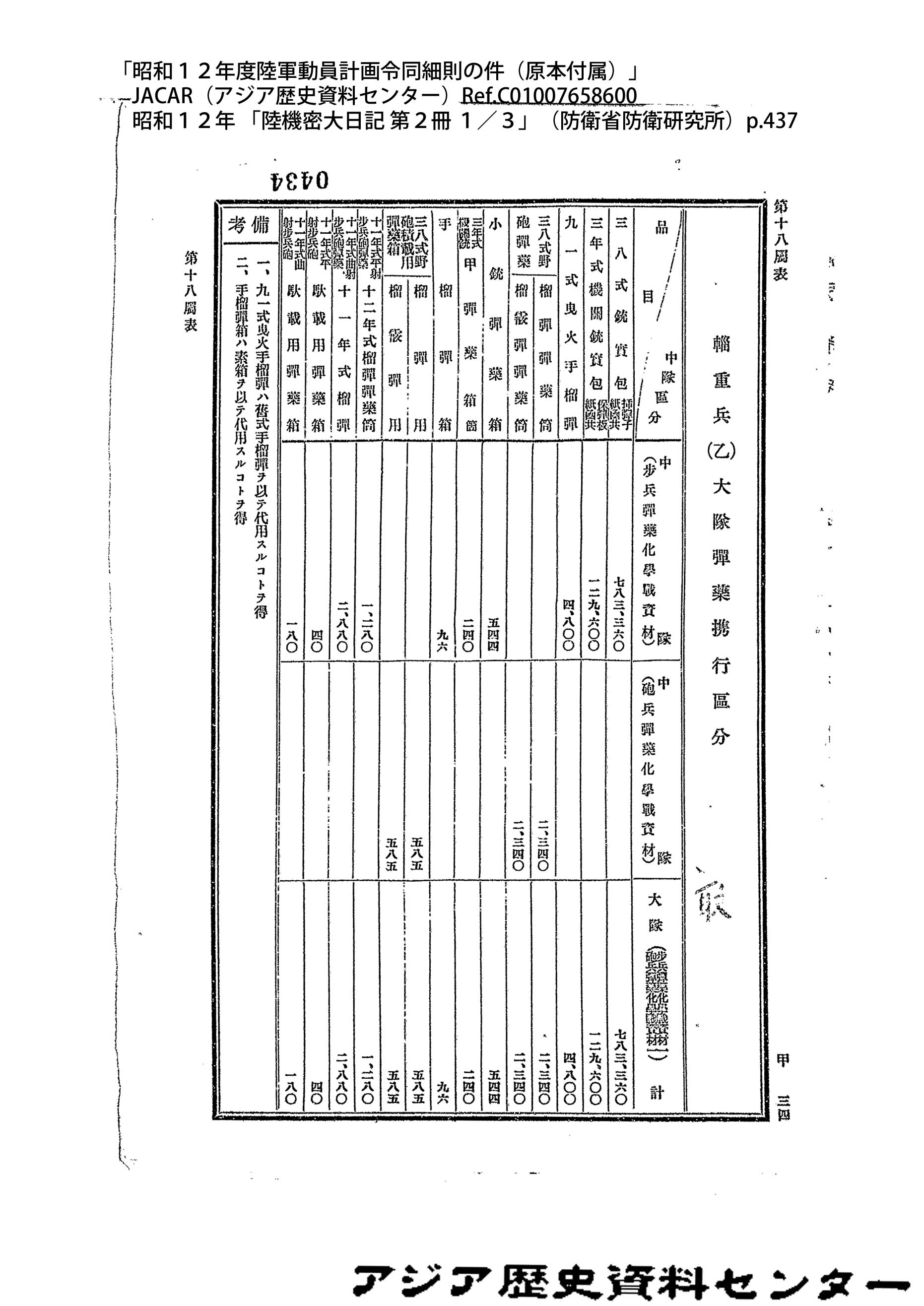 「昭和12年度陸軍動員計画令同細則の件(原本付属)」JACAR(アジア歴史資料センター)Ref.C01007658600、昭和12年 「陸機密大日記 第2冊 1/3」(防衛省防衛研究所)