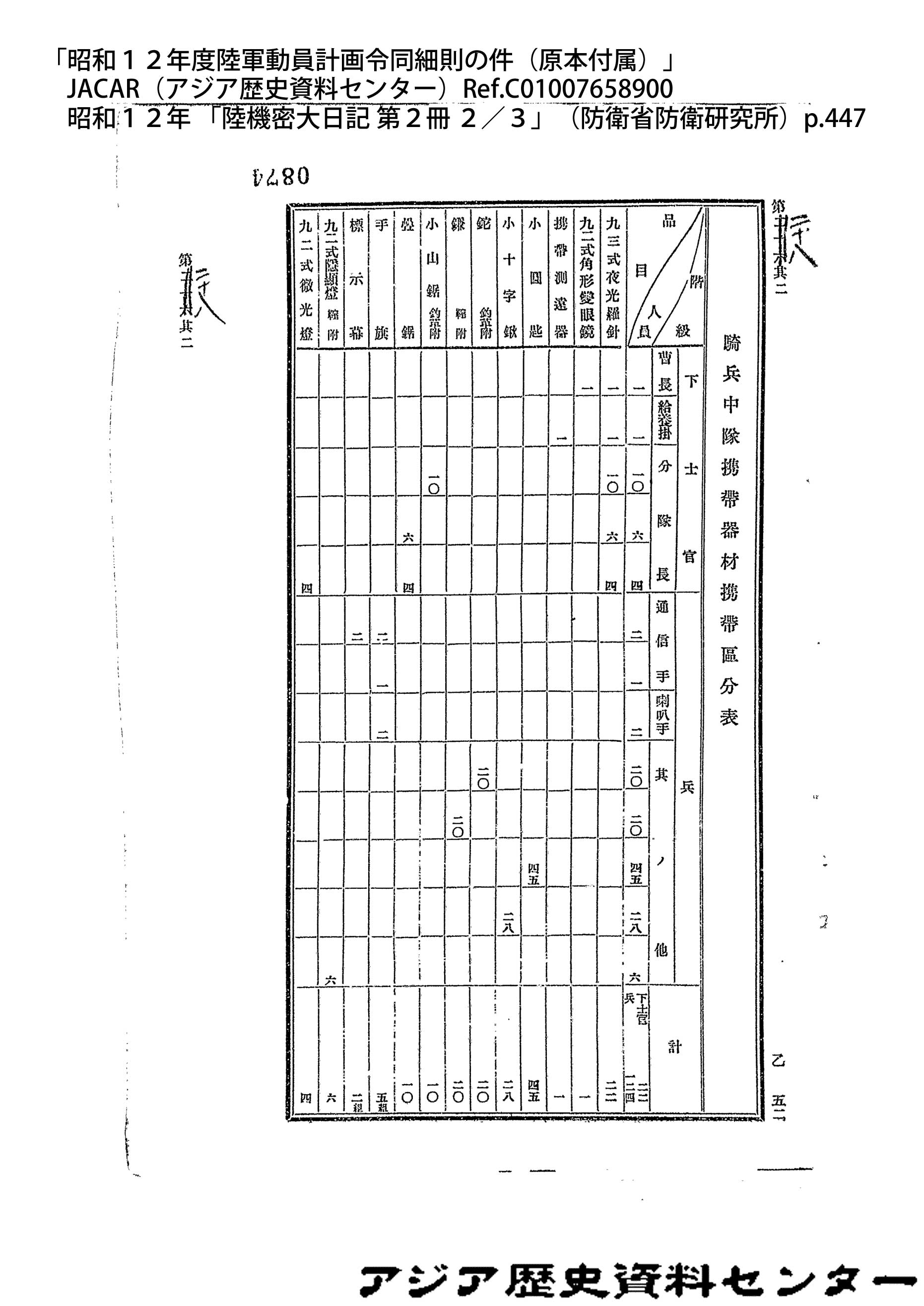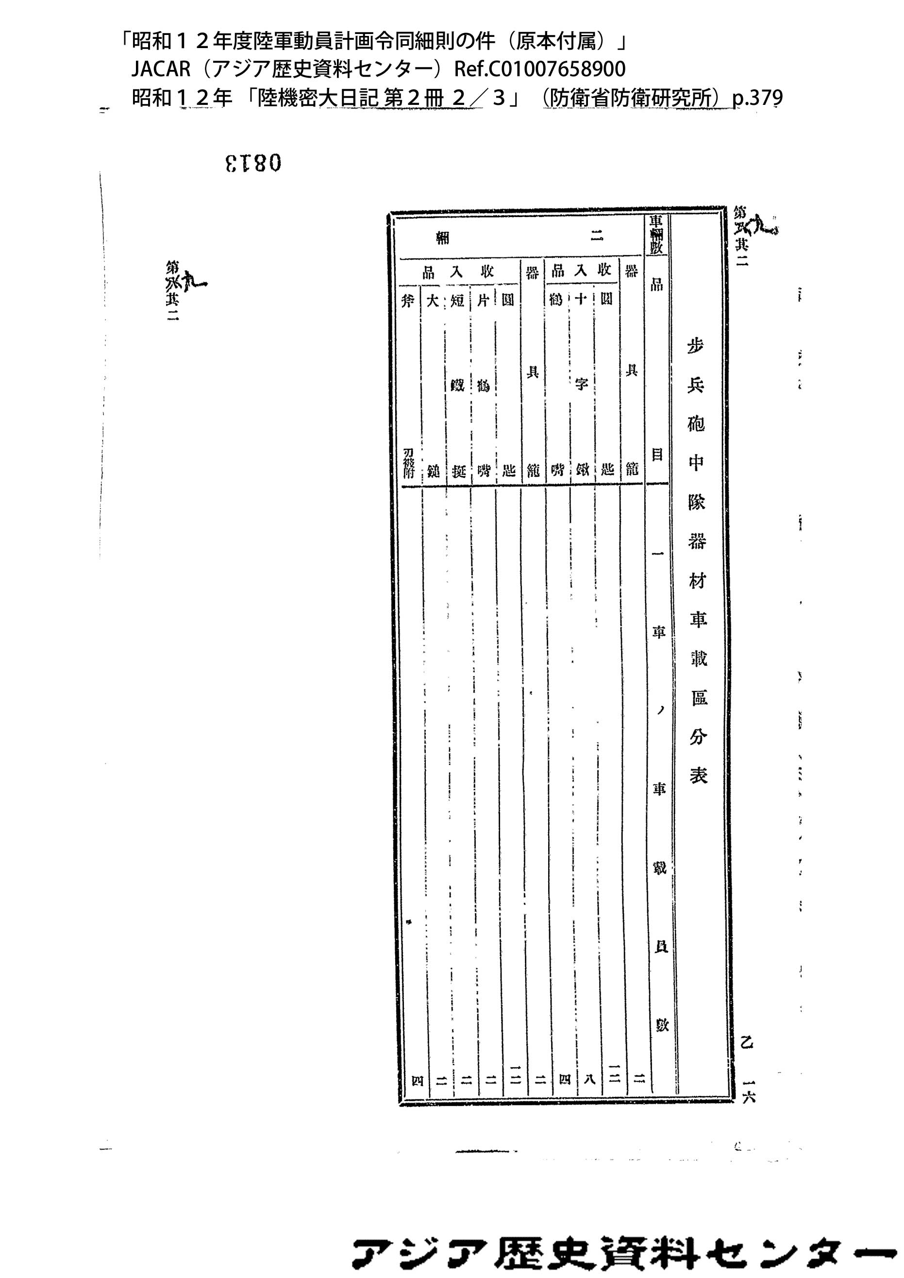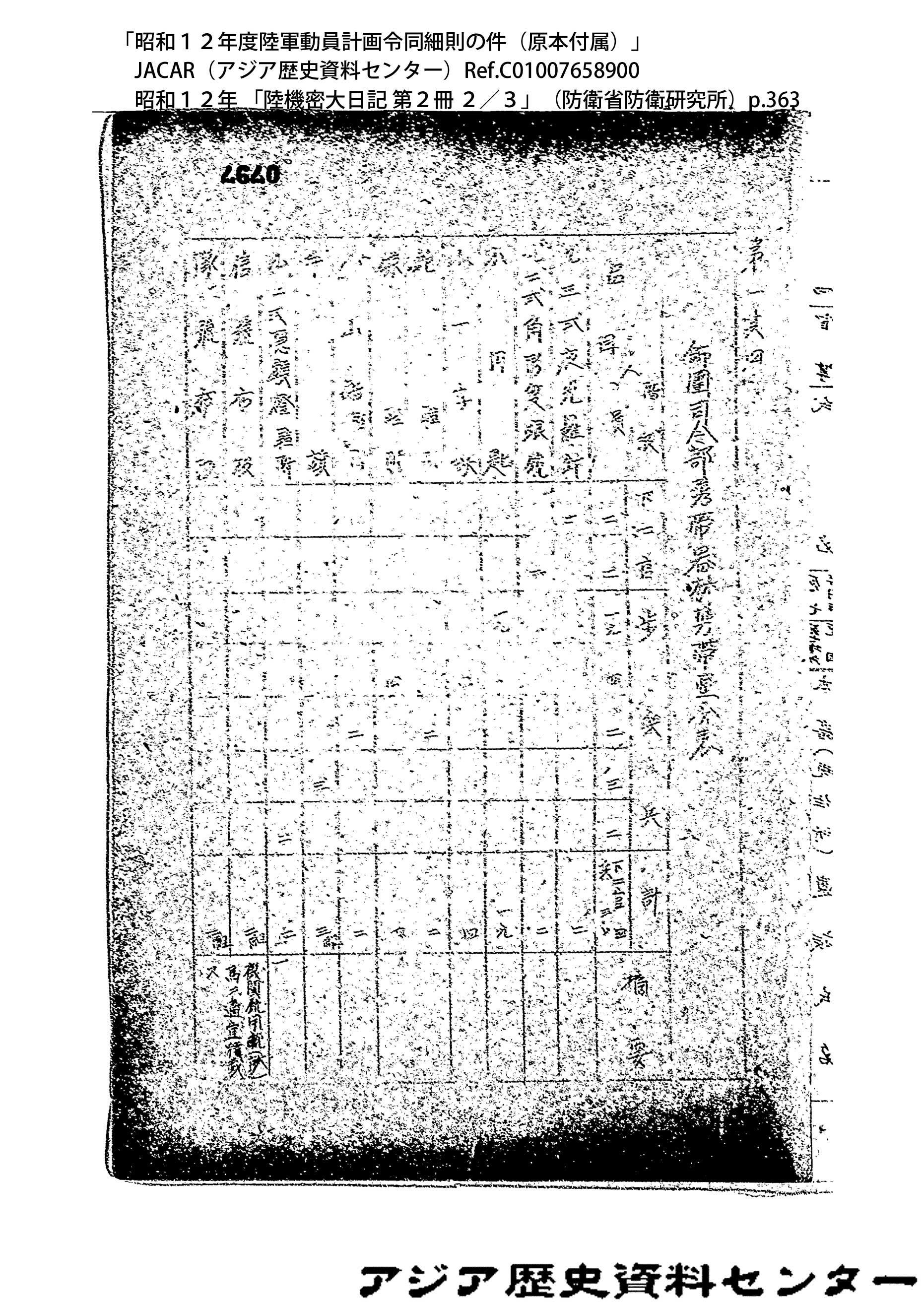 「昭和12年度陸軍動員計画令同細則の件(原本付属)」JACAR(アジア歴史資料センター)Ref.C01007658900、昭和12年 「陸機密大日記 第2冊 2/3」(防衛省防衛研究所)