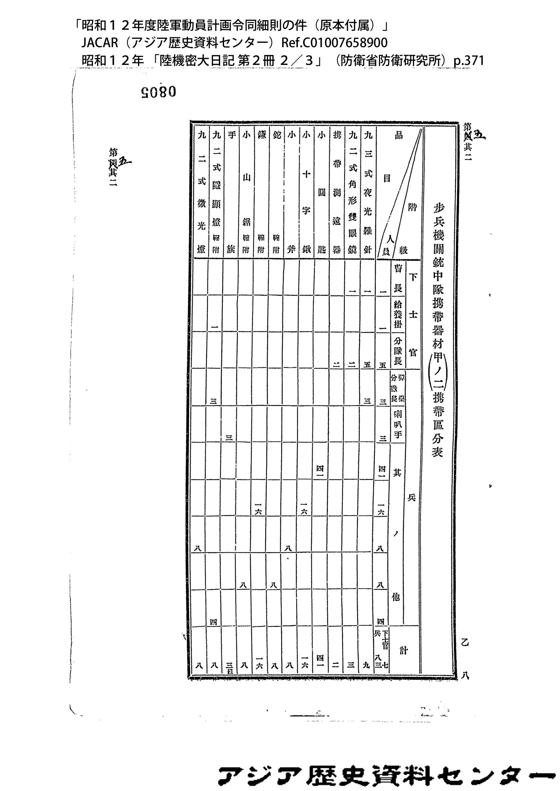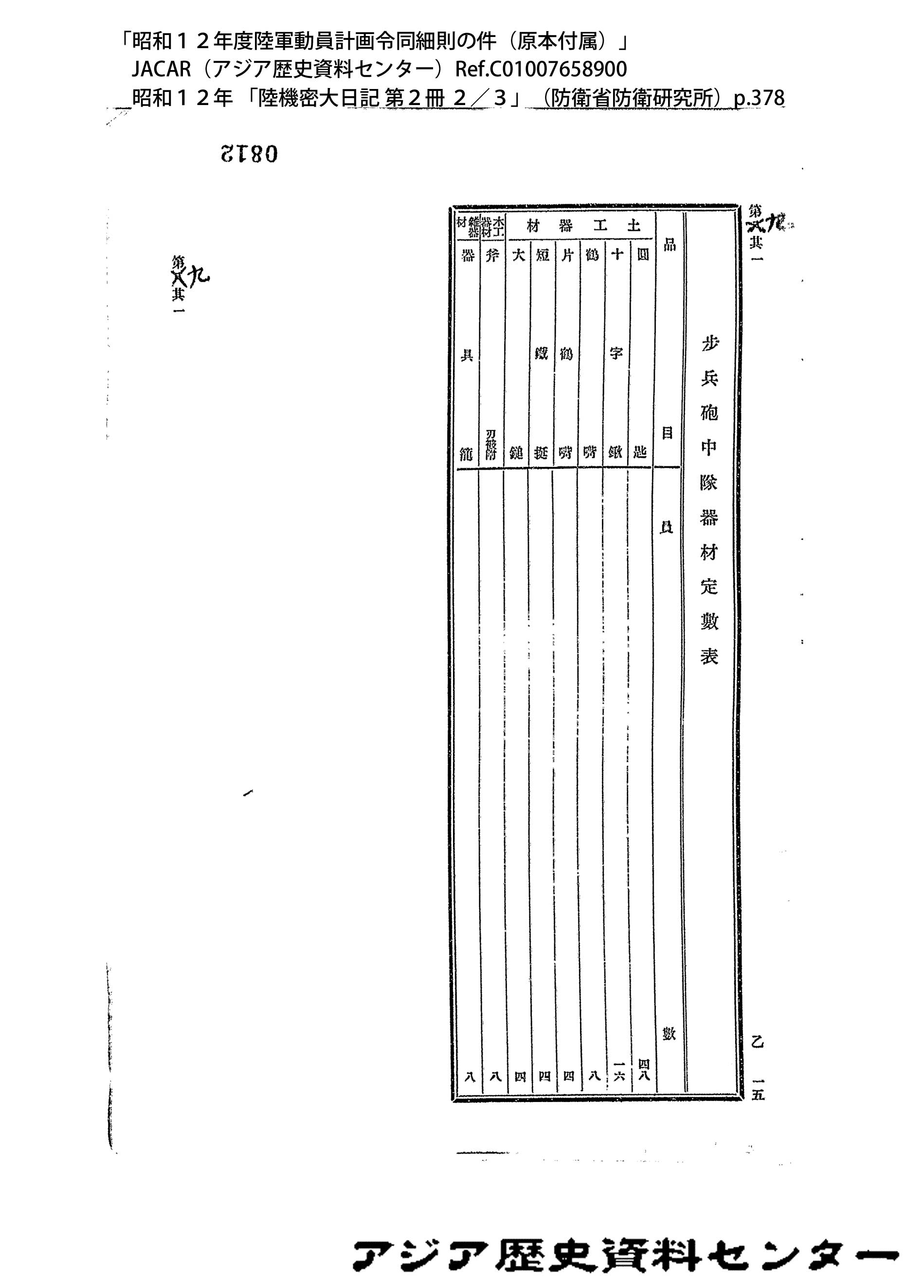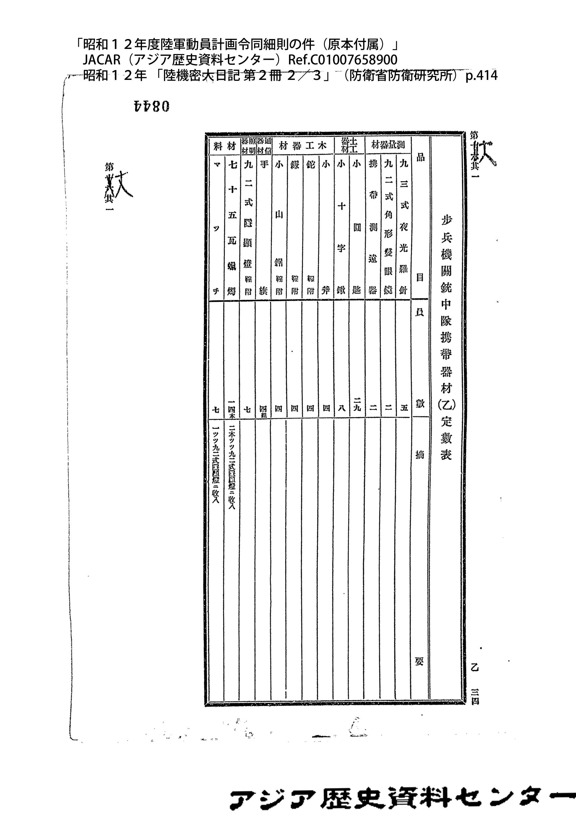 「昭和12年度陸軍動員計画令同細則の件(原本付属)」JACAR(アジア歴史資料センター)Ref.C01007658900、昭和12年 「陸機密大日記 第2冊 2/3」(防衛省防衛研究所)