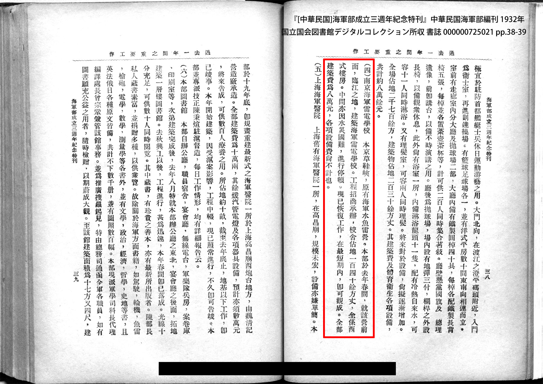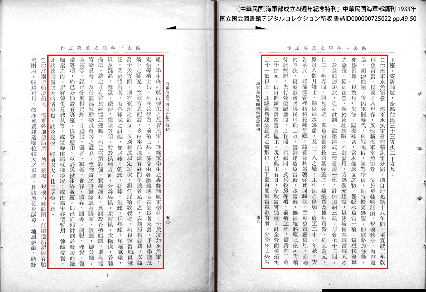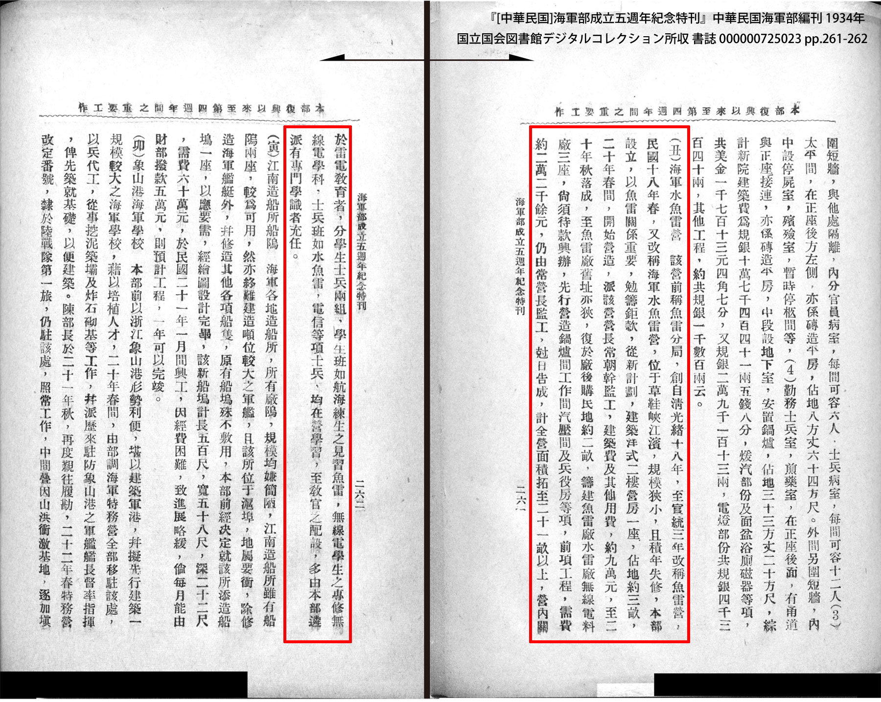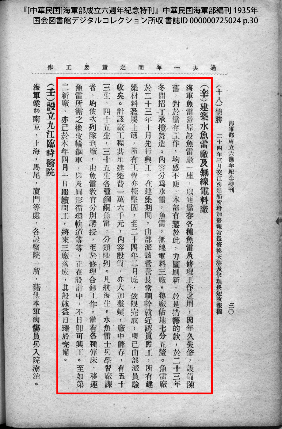 〔説明〕 ここで紹介する資料は、中華民国海軍の水魚雷営に関する資料である。水魚雷営は南京市下関の下流にある草鞋峡という集落の東端部に位置し、幕府山事件で二日間に亘って行なわれた捕虜殺害のうち、一日目の殺害現場と考えられている。 資料はいずれも中華民国海軍部が編集・刊行した『海軍部成立(三〜六)週年紀念特刊』 という冊子から引用しており、国会図書館デジタルライブラリーにおいて閲覧が可能である。なお、引用するのにあたり、色合いや傾きの調整を行なっている。
