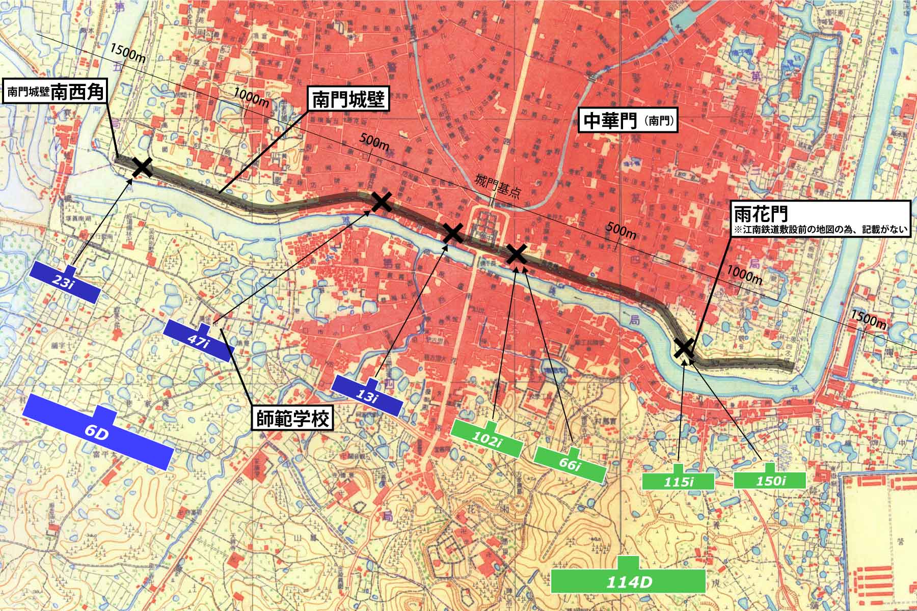 ここで注意すべきなのは、「南門城壁」という言葉である。この「南門」とは中華門を指し、「南門城壁」とは、中華門を中心に東西に伸びる城壁を指す。歩47第3中隊が確保した城壁とは、中華門から西400mの地点である。一方、第66連隊が担当した城壁は、中華門から東の地点である。つまり、歩47第3中隊の確保した場所と、歩66第1大隊が攻撃した場所とでは、同じ「南門城壁」であっても場所が違うのである。南門城壁に対する各部隊の攻撃箇所は下図の様になる。