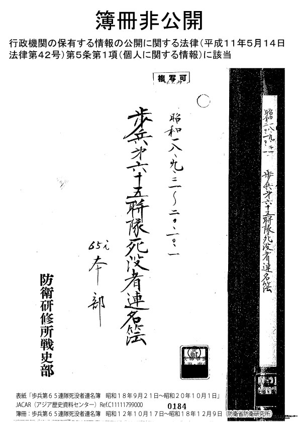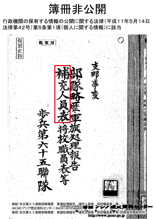 資料②はタイトルに「歩兵第65連隊部隊略歴 軍旗処理報告 補充人員表 将校職員表 等」と書かれており、補充人員表が含まれていることが推測できる。内容は情報公開法により非公開となっているので確認できないものの、『若松聯隊回想録』や『第四中隊史』に書かれている補充員数の根拠資料となり得るものである。