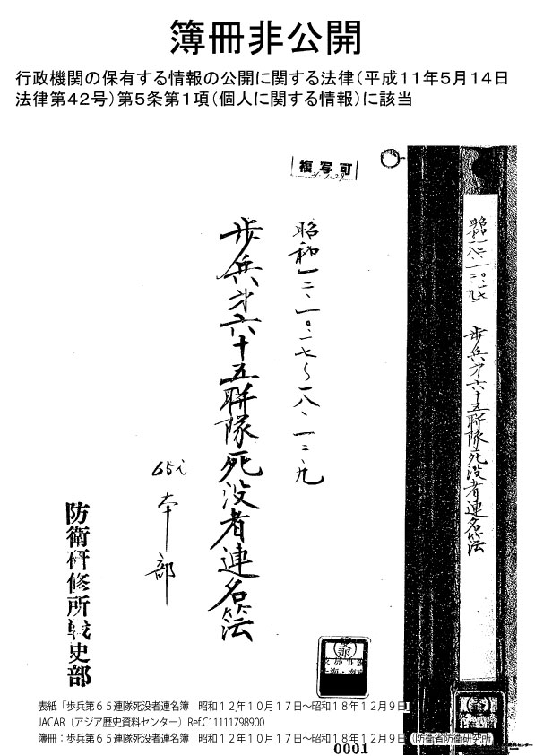 資料①「歩兵第65連隊死没者連名簿 昭和12年10月17日~昭和18年12月9日」