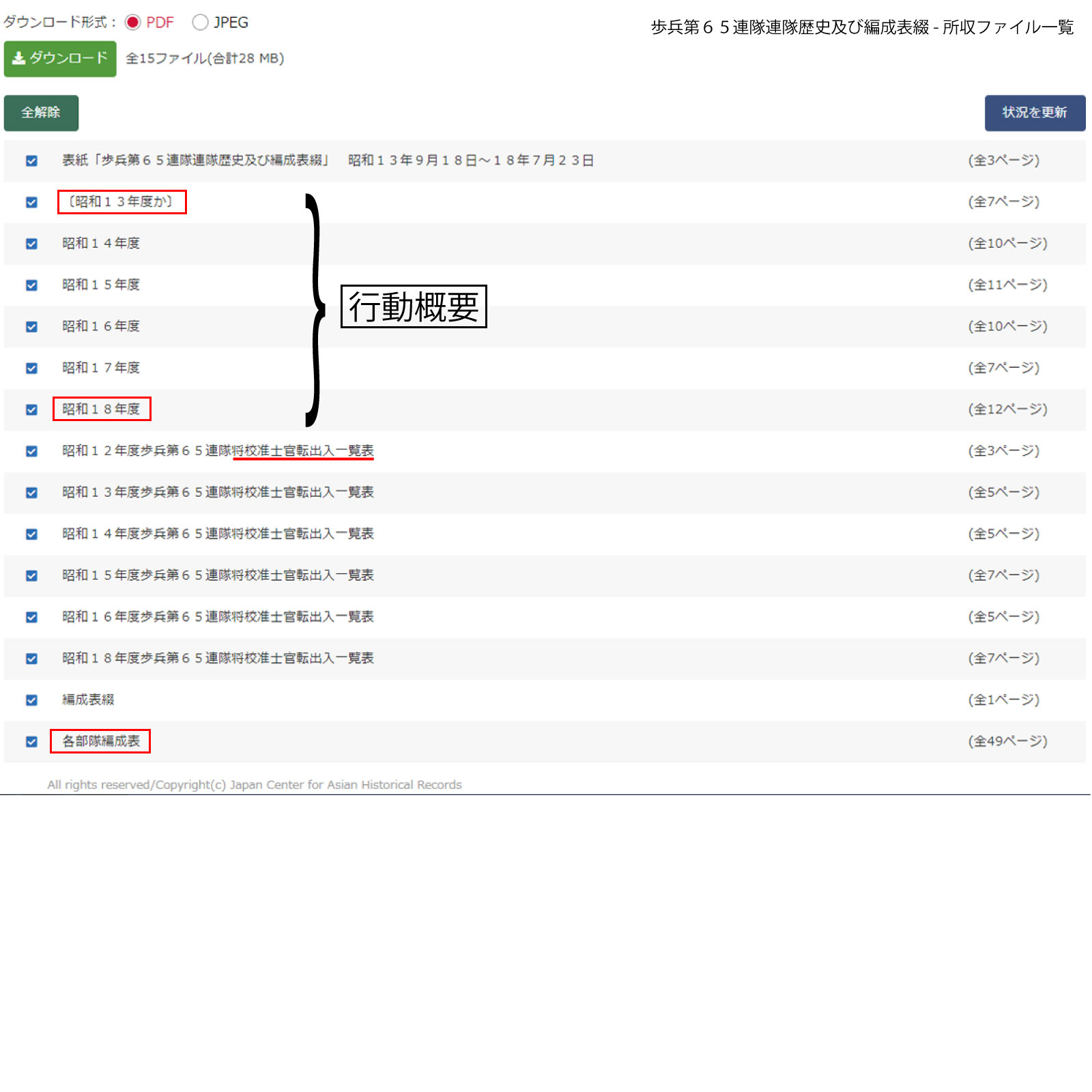 しかしここで問題となるのは、先に示した通りこの資料にある行動概要には欠落部分があることだ。仮にこの資料を閲覧できたとしても、それに基いて書かれた『若松聯隊回想録』の「歩兵第六十五聯隊史」は一部が欠落したものとなってしまう。
