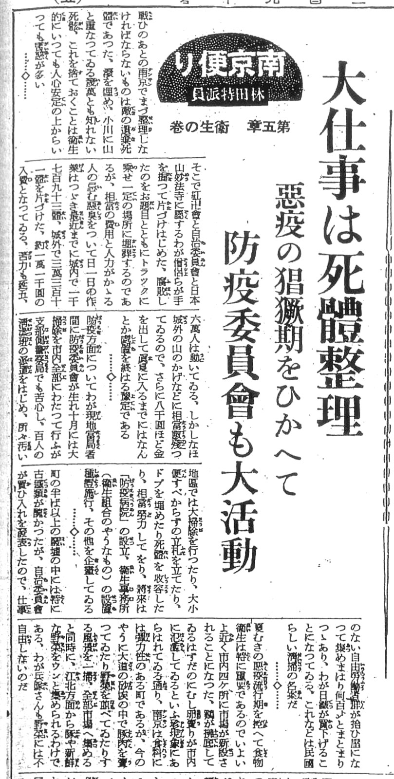 魚雷〈軍〉営江辺に畳々と聳へる土墓は皆、逃亡者の落付き処ではなかつたか。何処に生路があらうぞ。逃げざるも又方法ではなかつた。紅卍字会、崇善堂等の機関団体の個人的に埋葬した屍体数字は何十万に上つてゐる。之等は逃げざりし者の結末ではなかつたか。大道小道に無茶苦茶に倒れてゐるのは難を避けんと身を動かした結果ではなかつたか。