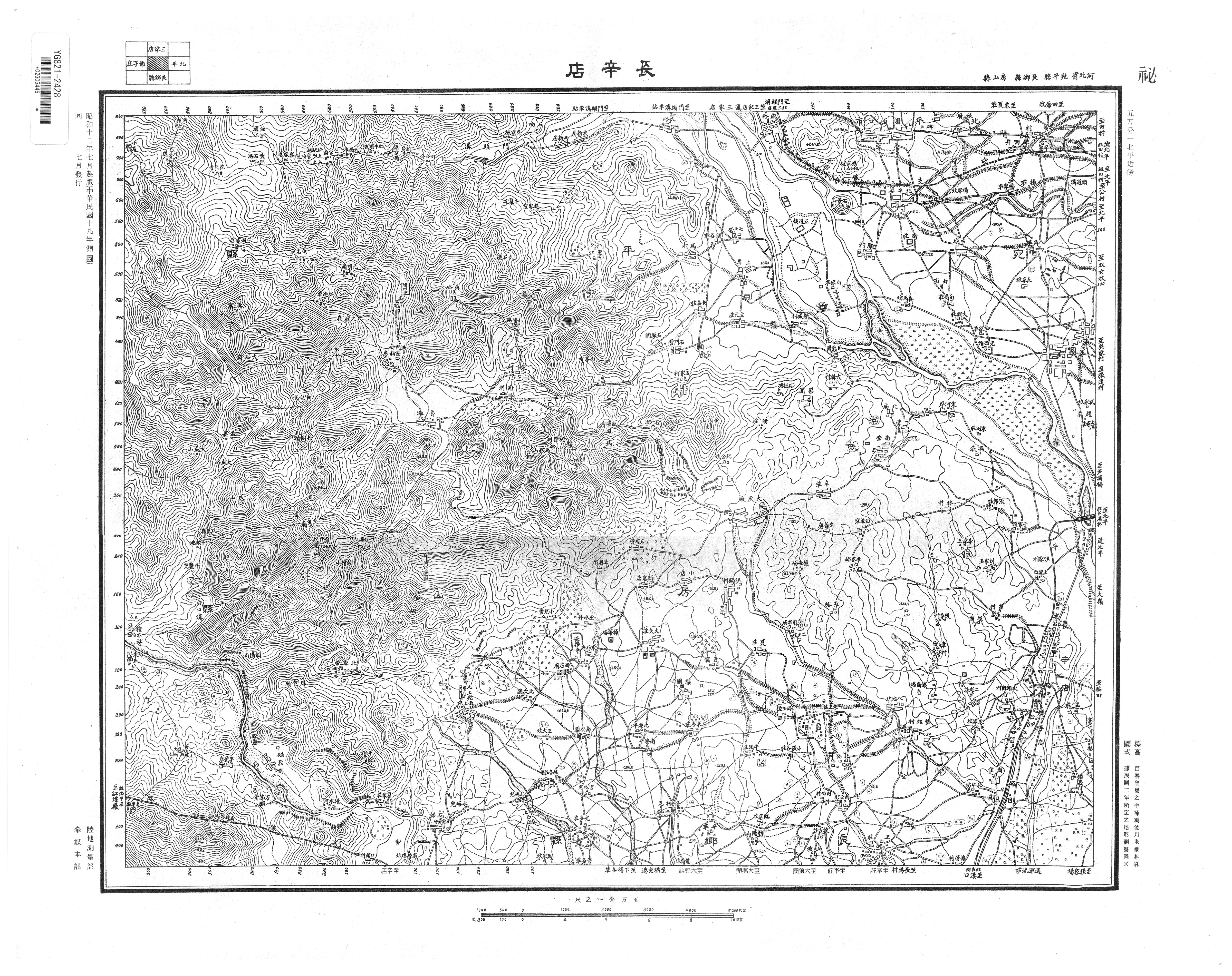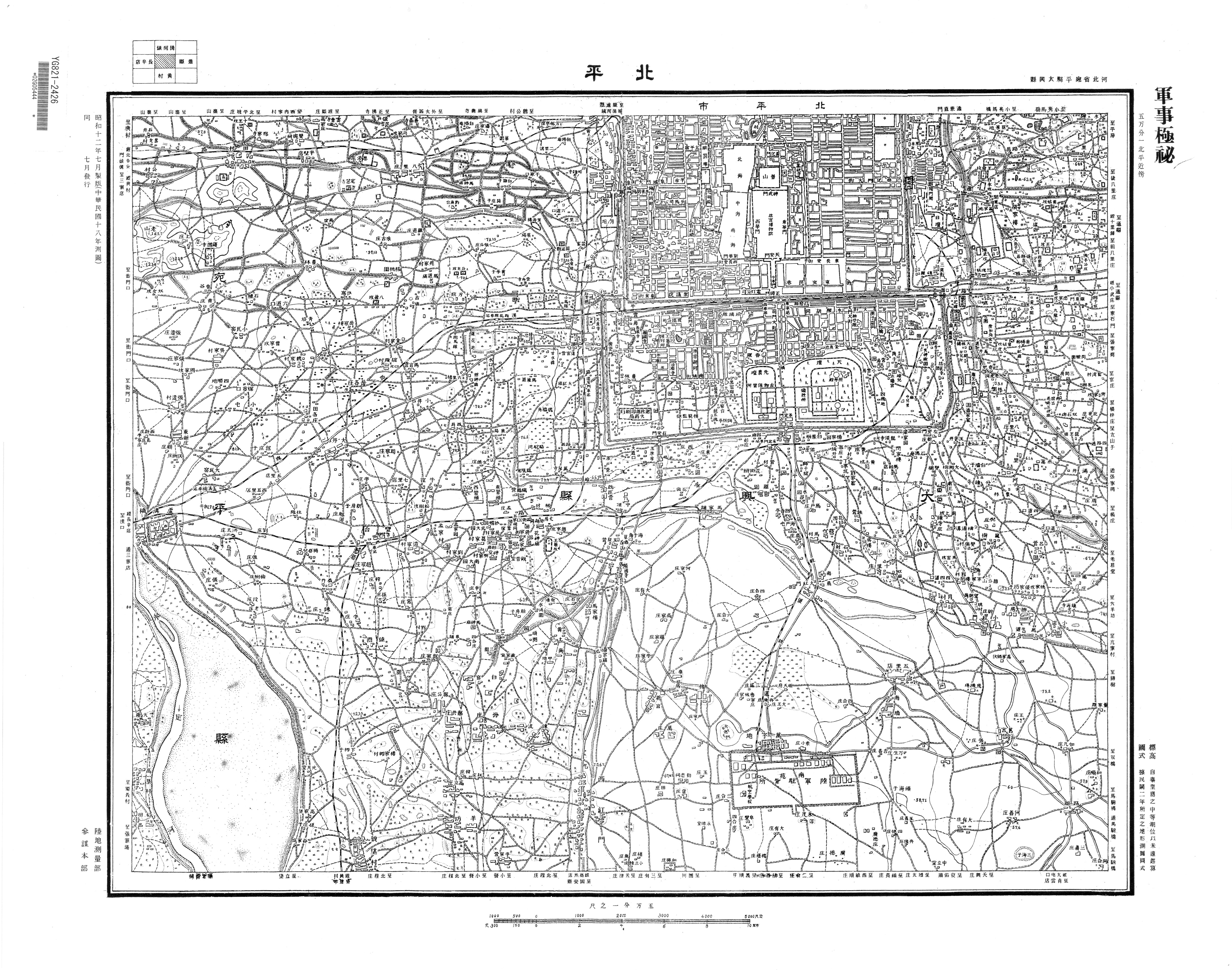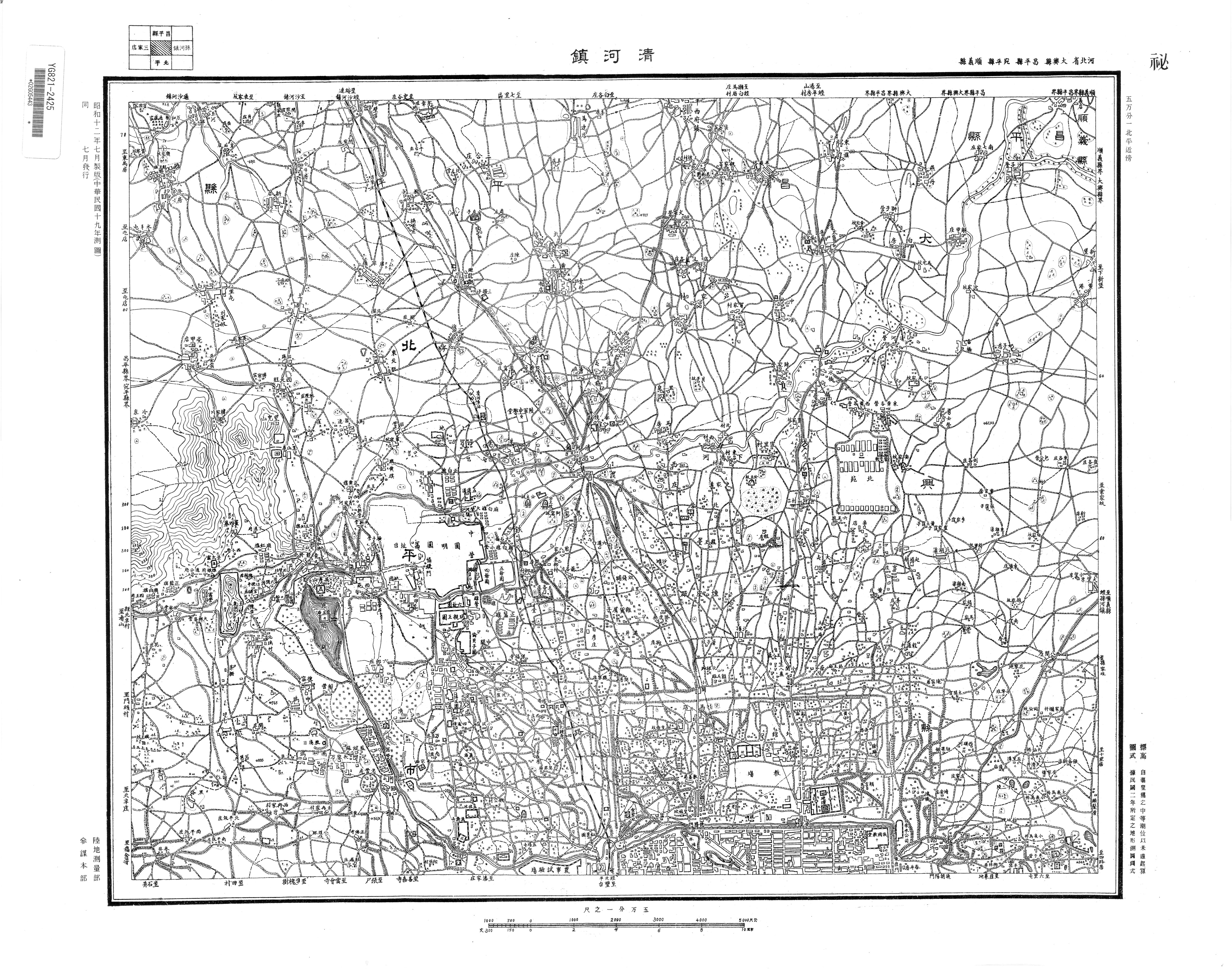 本資料は、国会図書館に所蔵されている1937年7月発行、参謀本部陸地測量部作製「五万分一図北平近傍図」である。