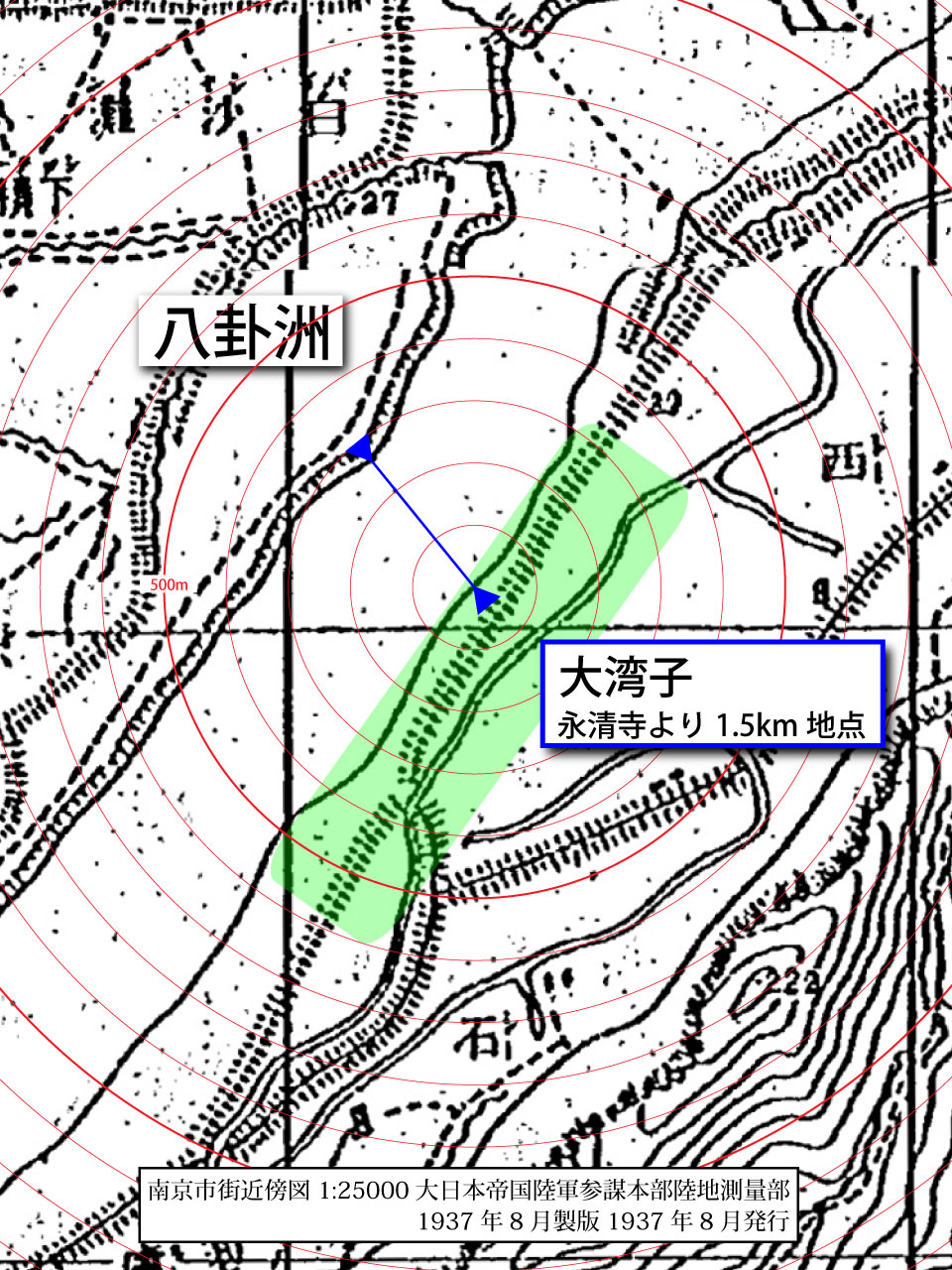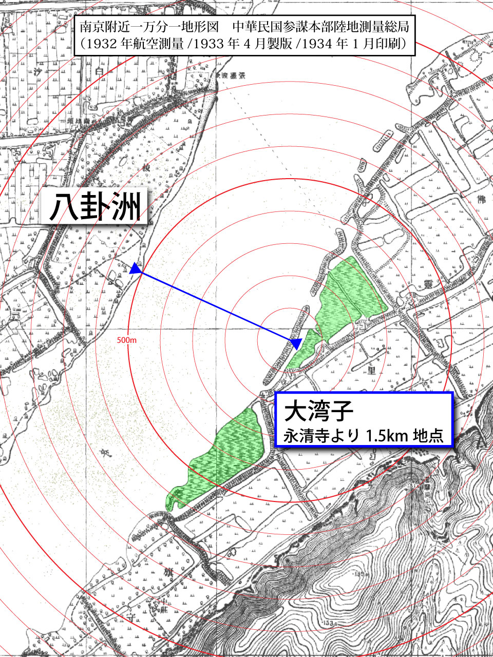 そのため本稿では、南京戦当時の大湾子―八卦洲間の距離を計測する方法として、当時の地図に基いて図上より計測する。