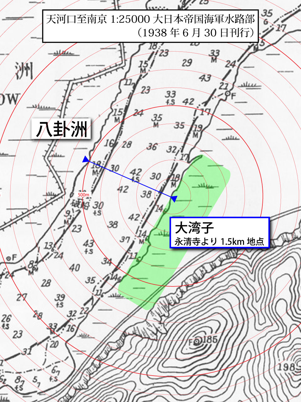地図上で大湾子―八卦洲間の距離を測ると約500mである。