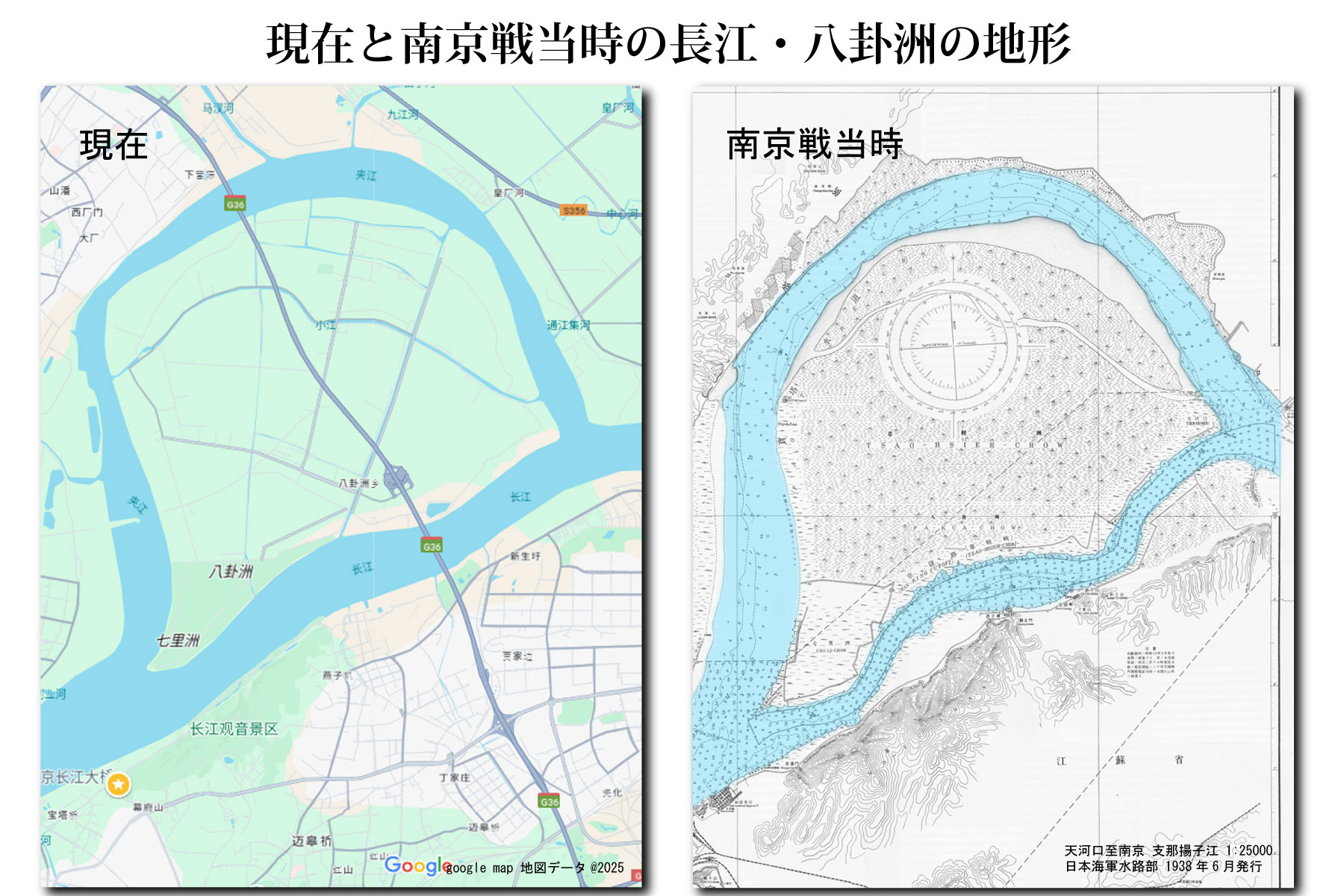 長江はかなり氾濫の多い河川だったと言われており、現在では河川改修が進み、南京戦当時と比較するとかなり河岸の形状が変化している。その状況は左図を見ても明らかだが、戦前は八卦洲の北側が主要河道だったが、現在では南側が主要河道となっており、河川の形状自体が変化しているとも言える。したがって、直接現地へ赴いて距離を測定したり、googlemap等の現在の地図で距離を測定することは不可能である。