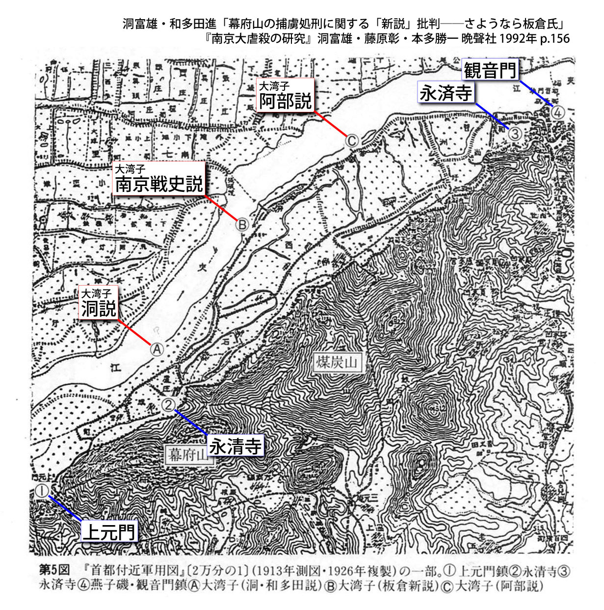 残るは、阿部氏、南京戦史、洞氏の各見解となる。洞・和多田「幕府山の捕虜処刑に関する「新説」批判――さようなら板倉氏」『南京大虐殺の研究』p.156の第5図に、三者の主張する大湾子の位置を地図上にまとめられているので以下に示す。
