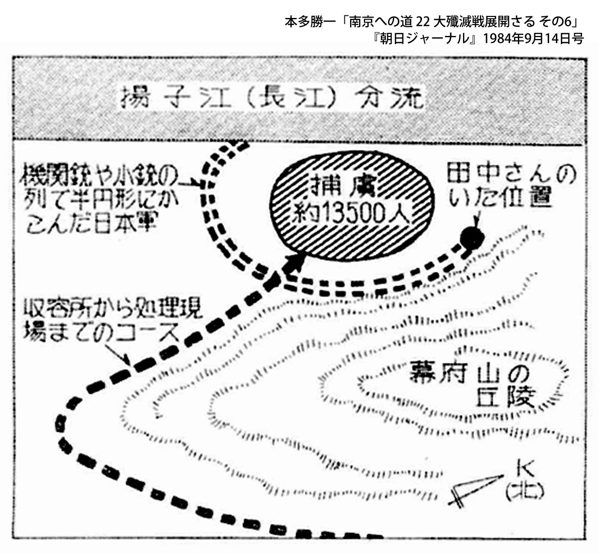 捕虜収容所の位置は「幕府山の丘陵の南側、つまり丘陵をはさんで長江と反対側だったと田中さんは記憶し、当時のスケッチでもそのように描いている」とする。このスケッチ自体は掲載されなかったものの、スケッチに基づいて描かれたイラストが掲載された(右図参照)