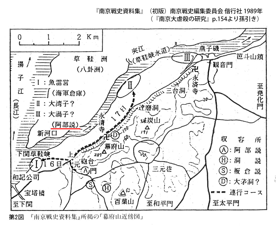 実際、『南京の氷雨』を読む限り阿部氏は17日の捕虜連行先を「大湾子」としており、大渦子は大湾子より東の観音門附近としている。大湾子の位置は「南京北部の幕府山一帯関係図」(同書p.34、上掲)を見る限り、Ⅲで示された位置より西側を示している。